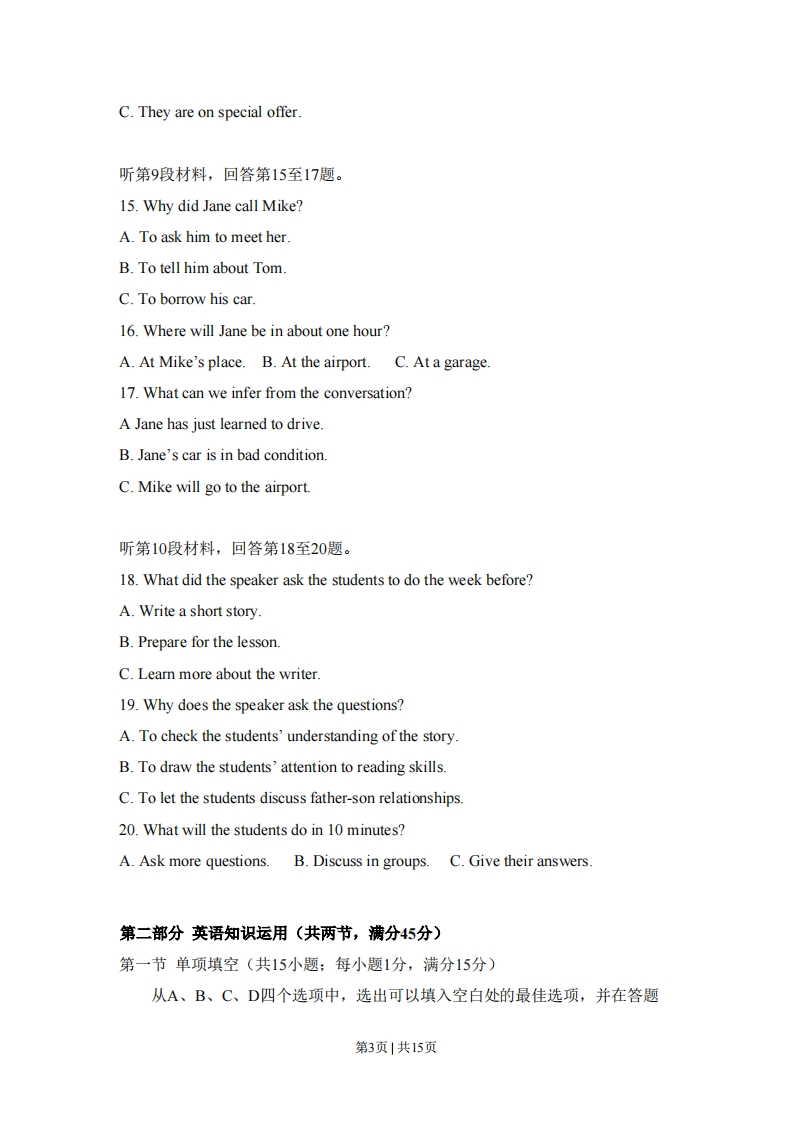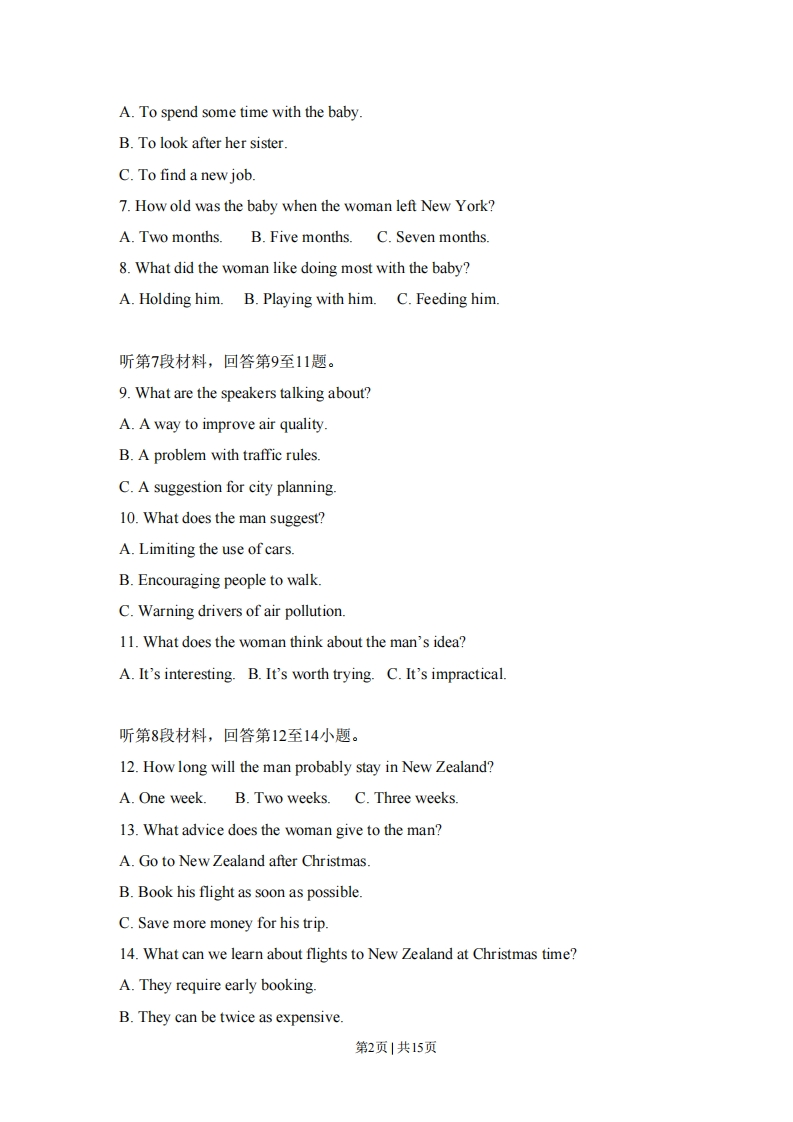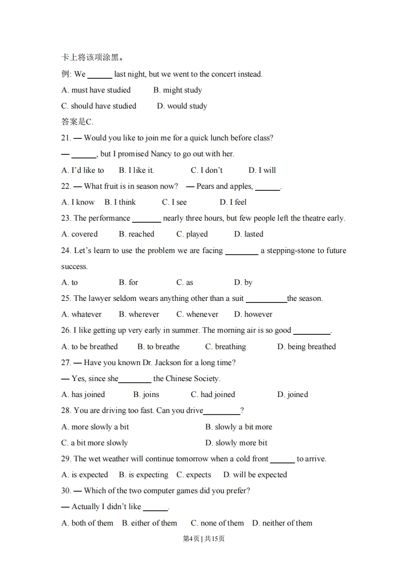 2008年高考英语试卷(全国卷I)第一部分听力(共两节,满分30分)做题时,先将答案标在试卷上,录音结束后,你将有两分钟的时间将试卷上的答案转涂到答题卡上。第一节(共5小题,每小题1.5分,满分7.5分)听下面5段对话。每段对话后有一个小题,从题中所给的A、B、C三个选项中选出最佳答案。听完每段对话后,你都有10秒钟的时间来回答有关小题和阅读下一小题。每段对话仅读一遍。例:How much is the shirt?A.£19.15B.£9.18C.9.15.答案是C,1.What is the weather like?A.It's raining.B.It's cloudy.C.It's sunny2.Who will go to China next month?A.Lucy.B.Alice.C.Richard3.What are the speakers talking about?A.The man's sister.B.A film.C.An actor.4.Where will the speakers meet?A.In Room 340.B.In Room 314.C.In Room 223.5.Where does the conversation most probably take place?A.In a restaurant.B.In an office.C.At home.第二节(共15小题;每小题1.5分,满分22.5分)听下面5段对话或独白,每段对话或独白后面有几个小题,从题中所给的A、B、C三个选项中选出最佳选项,并标在试卷的相应位置。听每段对话或独白前,你将有时间阅读各小题,每小题5秒钟:听完后,各小题将给出5秒钟的作答时间。每段对话或独白读两遍。听第6段材料,回答第6至8题。6.Why did the woman go to New York?第1页|共15页A.To spend some time with the baby.B.To look after her sister.C.To find a new job7.How old was the baby when the woman left New York?A.Two months.B.Five months.C.Seven months.8.What did the woman like doing most with the baby?A.Holding him.B.Playing with him.C.Feeding him.听第7段材料,回答第9至11题。9.What are the speakers talking about?A.A way to improve air qualityB.A problem with traffic rules.C.A suggestion for city planning.10.What does the man suggest?A.Limiting the use of carsB.Encouraging people to walk.C.Warning drivers of air pollution.11.What does the woman think about the man's idea?A.It's interesting.B.It's worth trying.C.It's impractical.听第8段材料,回答第12至14小题。12.How long will the man probably stay in New Zealand?A.One week.B.Two weeks.C.Three weeks13.What advice does the woman give to the man?A.Go to New Zealand after ChristmasB.Book his flight as soon as possible.C.Save more money for his trip14.What can we learn about flights to New Zealand at Christmas time?A.They require early bookingB.They can be twice as expensive.第2页|共15页C.They are on special offer.听第9段材料,回答第15至17题。15.Why did Jane call Mike?A.To ask him to meet her.B.To tell him about Tom.C.To borrow his car.16.Where will Jane be in about one hour?A.At Mike's place.B.At the airport.C.At a garage.17.What can we infer from the conversation?A Jane has just learned to drive.B.Jane's car is in bad conditionC.Mike will go to the airport.听第10段材料,回答第18至20题。18.What did the speaker ask the students to do the week before?A.Write a short story.B.Prepare for the lesson.C.Learn more about the writer.19.Why does the speaker ask the questions?A.To check the students'understanding of the story.B.To draw the students'attention to reading skills.C.To let the students discuss father-son relationships.20.What will the students do in 10 minutes?A.Ask more questions.B.Discuss in groups.C.Give their answers.第二部分英语知识运用(共两节,满分45分)第一节单项填空(共15小题;每小题1分,满分15分)从A、B、C、D四个选项中,选出可以填入空白处的最佳选项,并在答题第3页1共15页