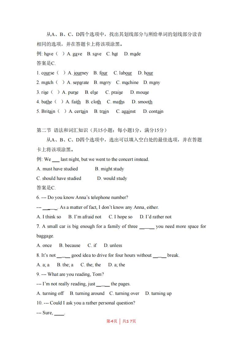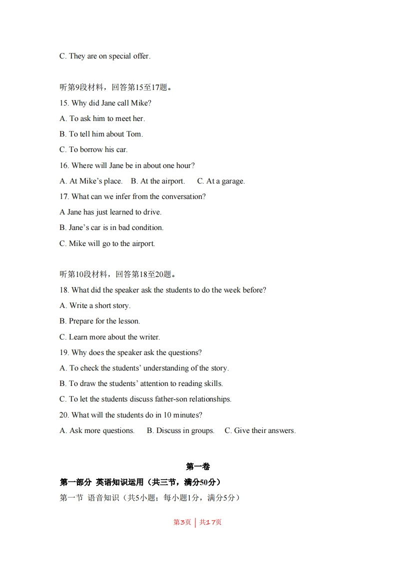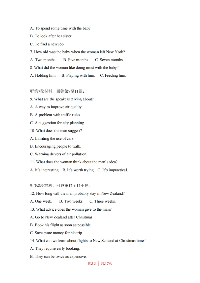 2008年高考英语试卷(全国卷Ⅱ)第一部分听力(共两节,满分30分)做题时,先将答案标在试卷上,录音结束后,你将有两分钟的时间将试卷上的答案转涂到答题卡上。第一节(共5小题,每小题1.5分,满分7.5分)听下面5段对话。每段对话后有一个小题,从题中所给的A、B、C三个选项中选出最佳答案。听完每段对话后,你都有10秒钟的时间来回答有关小题和阅读下一小题。每段对话仅读一遍。例:How much is the shirt?A.£19.15B.£9.18C.9.15.答案是C1.What is the weather like?A.It's raining.B.It's cloudy.C.It's sunny.2.Who will go to China next month?A.Lucy.B.Alice.C.Richard3.What are the speakers talking about?A.The man's sister.B.A film.C.An actor.4.Where will the speakers meet?A.In Room 340.B.In Room 314.C.In Room 223.5.Where does the conversation most probably take place?A.In a restaurant.B.In an office.C.At home.第二节(共15小题;每小题1.5分,满分22.5分)听下面5段对话或独白,每段对话或独白后面有几个小题,从题中所给的A、B、C三个选项中选出最佳选项,并标在试卷的相应位置。听每段对话或独白前,你将有时间阅读各小题,每小题5秒钟:听完后,各小题将给出5秒钟的作答时间。每段对话或独白读两遍。听第6段材料,回答第6至8题。6.Why did the woman go to New York?第1页共17页A.To spend some time with the baby.B.To look after her sister.C.To find a new job7.How old was the baby when the woman left New York?A.Two months.B.Five months.C.Seven months.8.What did the woman like doing most with the baby?A.Holding him.B.Playing with him.C.Feeding him.听第7段材料,回答第9至11题。9.What are the speakers talking about?A.A way to improve air qualityB.A problem with traffic rules.C.A suggestion for city planning.10.What does the man suggest?A.Limiting the use of carsB.Encouraging people to walk.C.Warning drivers of air pollution.11.What does the woman think about the man's idea?A.It's interesting.B.It's worth trying.C.It's impractical.听第8段材料,回答第12至14小题。12.How long will the man probably stay in New Zealand?A.One week.B.Two weeks.C.Three weeks13.What advice does the woman give to the man?A.Go to New Zealand after ChristmasB.Book his flight as soon as possible.C.Save more money for his trip14.What can we learn about flights to New Zealand at Christmas time?A.They require early booking.B.They can be twice as expensive.第2页共17页C.They are on special offer.听第9段材料,回答第15至17题。15.Why did Jane call Mike?A.To ask him to meet her.B.To tell him about Tom.C.To borrow his car.16.Where will Jane be in about one hour?A.At Mike's place.B.At the airport.C.At a garage.17.What can we infer from the conversation?A Jane has just learned to drive.B.Jane's car is in bad conditionC.Mike will go to the airport.听第10段材料,回答第18至20题。18.What did the speaker ask the students to do the week before?A.Write a short story.B.Prepare for the lesson.C.Learn more about the writer.19.Why does the speaker ask the questions?A.To check the students'understanding of the story.B.To draw the students'attention to reading skills.C.To let the students discuss father-son relationships.20.What will the students do in 10 minutes?A.Ask more questions.B.Discuss in groups.C.Give their answers.第一卷第一部分英语知识运用(共三节,满分50分)第一节语音知识(共5小题:每小题1分,满分5分)第3页共17页