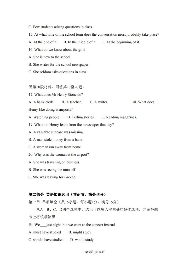 2009年高考英语试卷(全国卷I)第一部分听力(共两节,满分30分)做题时,先将答案标在试卷上,录音结束后,你将有两分钟的时间将试卷上的答案转涂到答题卡上。第一节(共5小题,每小题1.5分,满分7.5分)听下面5段对话。每段对话后有一个小题,从题中所给的A、B、C三个选项中选出最佳答案。听完每段对话后,你都有10秒钟的时间来回答有关小题和阅读下一小题。每段对话仅读一遍。例:How much is the shirt?A.£19.15B.f9.18C.9.15.答案是C1.What do the speakers need to buy?A.A fridge.B.A dinner table.C.A few chairs.2.Where are the speakers?A.In a restaurant.B.In a hotel.C.In a school.3.What does the woman mean?A.Cathy will be at the party.B.Cathy is too busy to come.C.Cathy is going to be invited.4.Why does the woman plan to go to town?A.To pay her bills in the bankB.To buy books in a bookstoreC.To get some money from the bank.5.What is the woman trying to do?A.Finish some writing.B.Print an article.C.Find a newspaper.第二节(共15小题,每小题1.5分,满分22.5分)听下面5段对话或独白。每段对话或独白后有几个小题,从题中所给的A、B、C三个选项中选出最佳选项,并标在试卷的相应位置。听每段对话或独白前第1页1共14页,你将有时间阅读各个小题,每小题5秒钟:听完后,个小题将给出5秒钟的作答时间。每段对话或独白读两遍。听第6段材料,回答第6、7题。6.What is the man doing?A.Changing seats on the planeB.Asking for a window seat.C.Trying to find his seat.7.What is the woman's seat number?A.6A.B.7A.C.8A.听第7段材料,回答第8、9题。8.Why doesn't the woman take the green T-shirt?A.It's too small.B.It's too dark.C.It's too expensive.9.What does the woman buy in the end?A.A yellow T-shirt.B.A blue T-shirt.C.A pink T-shirt.听第8段材料,回答第10至12题。10.How long has the man been in London?A.One year.B.A few years.C.A couple of months.11.Why did the woman leave her hometown?A.To lead a city life.B.To open a restaurant.C.To find a job12.Where did the woman come from?A.London.B.Arnside.C.Lancaster.听第9段材料,回答第13至16题。13.What is a daypack?A.A box.B.A bag.C.A lock.14.What surprises the girl at school?A.A lot of discussions in classB.Teachers giving little homework第2页|共14页C.Few students asking questions in class.15.At what time of the school term does the conversation most,probably take place?A.At the end of it.B.In the middle of it.C.At the beginning of it.16.What do we know about the girl?A.She is new to the schoolB.She writes for the school newspaperC.She seldom asks questions in class.听第10段材料,回答第17至20题。17.What does Mr Henry Stone do?A.A bank clerk.B.A teacher.C.A writer.18.What doesHenry like doing at airports?A.Watching people.B.Telling stories.C.Reading magazines.19.What did Henry learn from the newspaper that day?A.A valuable suitcase was missing.B.A man stole money from a bank.C.A woman ran away from home.20.Why was the woman at the airport?A.She was traveling on businessB.She was seeing the man off.C.She was leaving for Greece.第二部分英语知识运用(共两节,满分45分)第一节单项填空(共15小题:每小题1分,满分15分)从A、B、C、D四个选项中,选出可以填入空白处的最佳选项,并在答题卡上将该项涂黑。Welast night,but we went to the concert instead.A.must have studiedB.might studyC.should have studied D.would study第3页1共14页