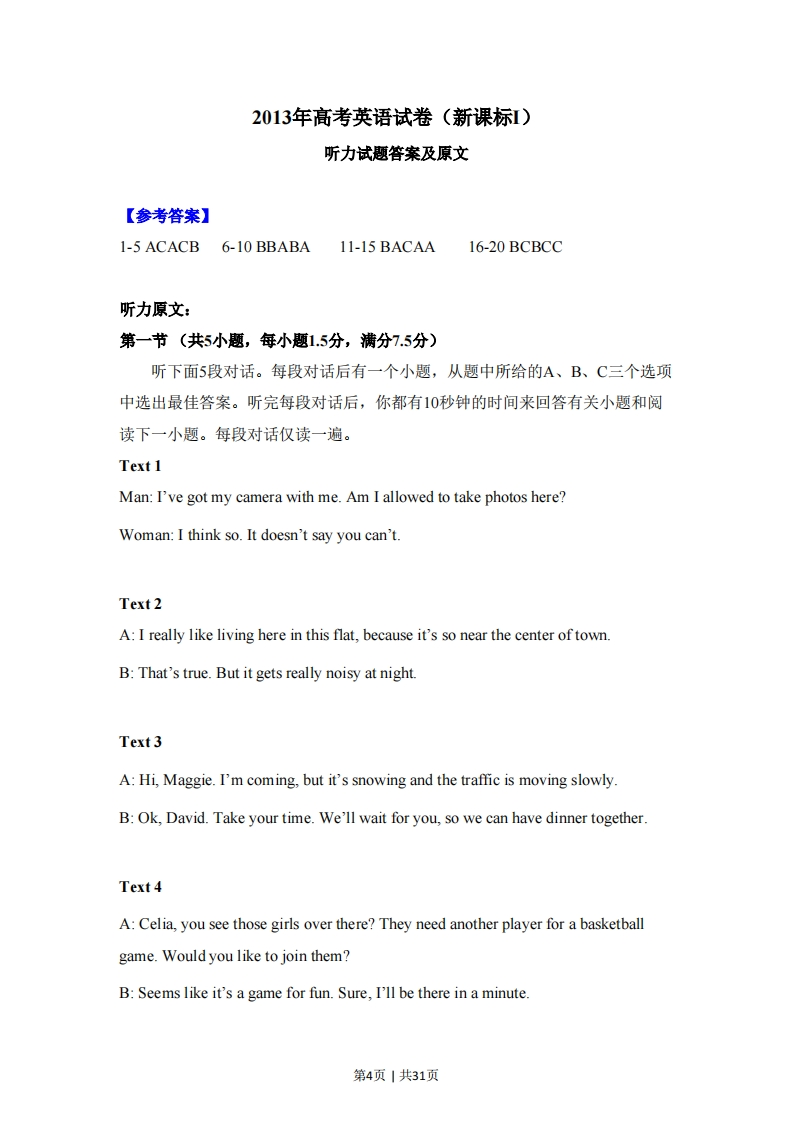 2013年高考英语试卷(新课标I)事考答案与试题佩折第一部分听力(共两节,满分30分)做题时,先将答案标在试卷上,录音结束后,你将有两分钟的时间将试卷上的答案转涂到答题卡上。第一节(共5小题,每小题1.5分,满分7.5分)听下面5段对话。每段对话后有一个小题,从题中所给的A、B、C三个选项中选出最佳答案。听完每段对话后,你都有10秒钟的时间来回答有关小题和阅读下一小题。每段对话仅读一遍。例:How much is the shirt?A.£19.15B.f9.18C.f9.15.答案是C1.What does the man want to do?A.Take photos.B.Buy a camera.C.Help the woman.2.What are the speakers talking about?A.A noisy night.B.Their life in town.C.A place of living.3.Where is the man now?A.On his way.B.In a restaurant.C.At home4.What will Celia do?A.Find a player.B.Watch a game.C.Play basketball5.What day is it when the conversation takes place?A.Saturday.B.Sunday.C.Monday第二节(共15小题:每小题1.5分,满分22.5分)听下面5段对话或独白。每段对话或独白后有几个小题,从题中所给的A、B、C三个选项中选出最佳选项,并标在试卷的相应位置。听每段对话或独白前,你将有时间阅读各个小题,每小题5秒钟:听完后,个小题将给出5秒钟的作答时间。每段对话或独白读两遍。第1页|共31页听第6段材料,回答6、7题。6.What is Sara going to do?A.Buy John a gift.B.Give John a surprise.C.Invite John to France.7.What does the man think of Sara's plan?A.Funny.B.Exciting.C.Strange.听第7段材料,回答第8、9题。8.Why does Diana say sorry to peter?A.She has to give up her travel pan.B.She wants to visit another cityC.She needs to put offher test.9.What does Diana want Peter to do?A.Help her with her studyB.Take a book to her friend.C.Teach a geography lesson.听第8段材料,回答第10至12题。10.Why does the man call the woman?A.To tell her about her new job.B.To ask about her job program.C.To plan a meeting with her.11.Who needs a new flat?A.Alex.B.Andrea.C.Miranda.12.Where is the woman now?A.In Baltimore.B.In New York.C.In Avon听第9段材料,回答第13至16题。13.What does Jan consider most important when he judges a restaurant?A.Where the restaurant is.B.Whether the prices are low.第2页|共31页C.How well the food is prepared.14.When did Jan begin to write for a magazine?A.After he came back to Sweden.B.Before he went to the United States.C.As soon as he got his first job in 198215.What may Jan do to find a good restaurant?A.Talk to people in the street.B.Speak to taxi drivers.C.Ask hotel clerks.16.What do we know about Jan?A.He cooks for a restaurant.B.He travels a lot of his work.C.He prefers American food.听第10段材料,回答第17至20题。17.What do we know about the piaza Leen?A.It's new building.B.It's a small town.C It's public place.18.When do parents and children like going to the Piaza Leen?A.Saturday nights.B.Sunday afternoons.C.Fridays and Saturdays.19.Which street is known for its food shops and markets?A.Via dei Mar Street.B.Femando Street.C.Hemandes Street.20.Why does the speaker like Horation Street bestA.It has an old stone surface.B.It is named after a writer.C.It is a famous university.第3页|共31页