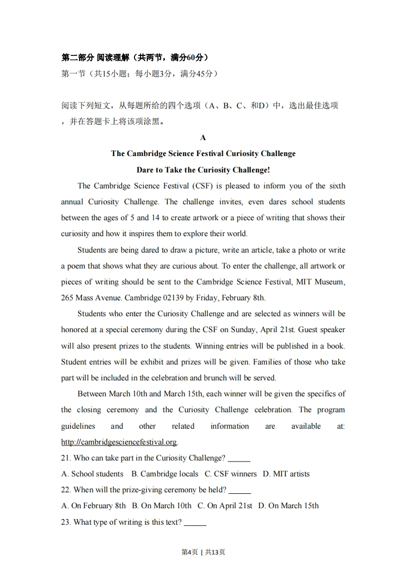 2014年高考英语试卷(新课标I)第一部分听力(共两节,满分30分)做题时,先将答案标在试卷上,录音结束后,你将有两分钟的时间将试卷上的答案转涂到答题卡上。第一节(共5小题,每小题1.5分,满分7.5分)听下面5段对话。每段对话后有一个小题,从题中所给的A、B、C三个选项中选出最佳答案。听完每段对话后,你都有10秒钟的时间来回答有关小题和阅读下一小题。每段对话仅读一遍。例:How much is the shirt?A.£19.15B.f9.18C.f9.15答案是C1.What does the woman want to do?A.Find a place.B.Buy a map.C.Get an address.2.What will the man do for the woman?A.Repair her car.B.Give her a ride.C.Pick up her aunt.3.Who might Mr.Peterson be?A.A new professor.B.A department head.C.A company director.4.What does the man think of the book?A.Quite difficult.B.Very interesting.C.Too simple.5.What are the speakers talking about?A.Weather.B.Clothes.C.News.第二节(共15小题;每小题1.5分,满分22.5分)听下面5段对话或独白。每段对话或独白后有几个小题,从题中所给的A、B、C三个选项中选出最佳选项,并标在试卷的相应位置。听每段对话或独白前,你将有时间阅读各个小题,每小题5秒钟:听完后,各小题将给出5秒钟的作答时间。每段对话或独白读两遍。听第6段材料,回答6、7题。6.Why is Harry unwilling to join the woman?第1页|共13页A.He has a pain in his knee.B.He wants to watch TV.C.He is too lazy.7.What will the woman probably do next?A.Stay at home.B.Take Harry to hospital.C.Do some exercise.听第7段材料,回答第8、9题。8.When will the man be home from work?A.At5:45.B.At6:15.C.At6:50.9.Where will the speakers go?A.The Green House Cinema.B.The New State Cinema.C.The UME Cinema.听第8段材料,回答第10至12题。10.How will the speakers go to New York?A.By air.B.By taxi.C.By bus.11.Why are the speakers making the trip?A.For business.B.For shopping.C.For hoilday.12.What is the probable relationship between the speakers?A.Driver and passenger.B.Husband and wife.C.Fellow workers.听第9段材料,回答第13至16题。13.Where does this conversation probably take place?A.In a restaurant.B.In an office.C.In a classroom.14.What does John do now?A.He's a trainer.B.He's a tour guide.C.He's a college student.15.How much can a new person earn for the first year?A.$10,500.B.$12,000.C.$15,00016.How many people will the woman hire?A.Four.B.Three.C.Two.第2页|共13页听第10段材料,回答第17至20题。17.How long has the speaker lived in a big city?A.One year.B.Ten years.C.Eighteen years18.What is the speaker's opinion on public transport?A.It's comfortable.B.It's time-saving.C.It's cheap.19.What is good about living in a small town?A.It's safer.B.It's healthier.C.It's more convenient.20.What kind of life does the speaker seem to like most?A.Busy.B.Colorful.C.Quiet.第3页1共13页