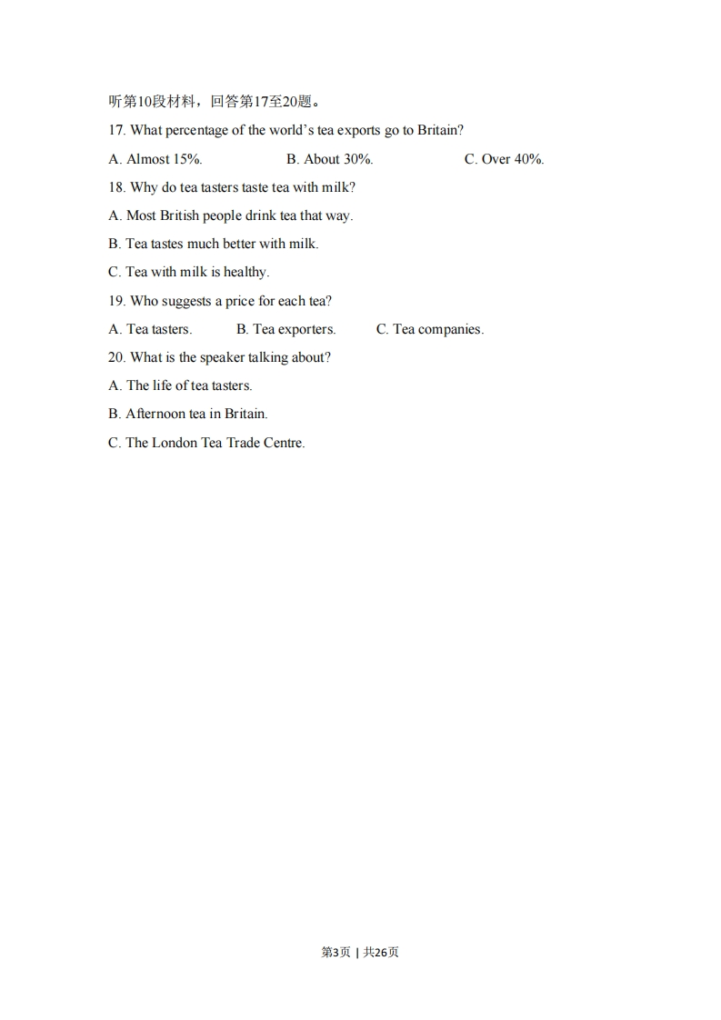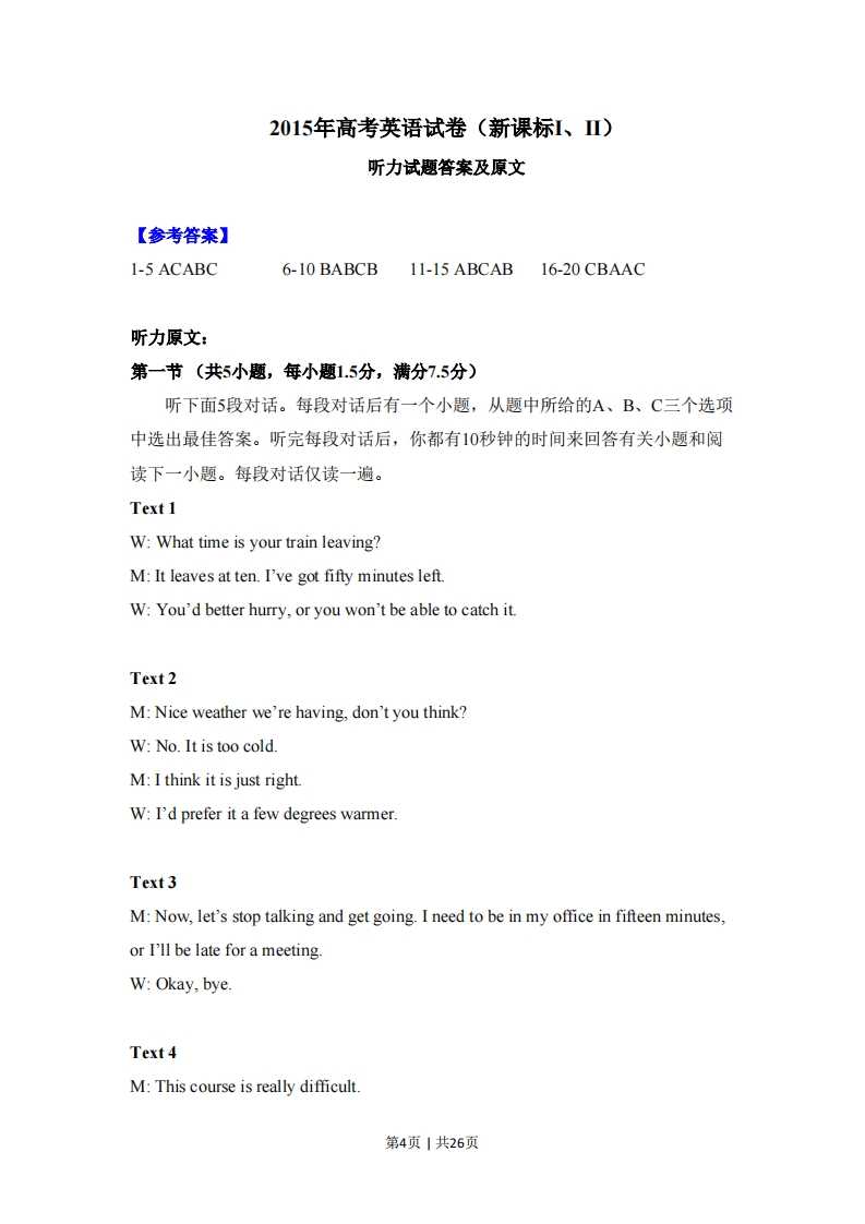 2015年高考英语试卷(新课标I)事考答案与试题解析第一部分听力(共两节,满分30分)做题时,先将答案标在试卷上,录音结束后,你将有两分钟的时间将试卷上的答案转涂到答题卡上。第一节(共5小题,每小题1.5分,满分7.5分)听下面5段对话。每段对话后有一个小题,从题中所给的A、B、C三个选项中选出最佳答案。听完每段对话后,你都有10秒钟的时间来回答有关小题和阅读下一小题。每段对话仅读一遍。例:How much is the shirt?A.£19.15B.f9.18C.f9.15答案是C1.What time is it now?A.9:10B.9:50.C.10:00.2.What does the woman think of the weather?A.It's nice.B.It's warmC.It's cold3.What will the man do?A.Attend a meeting.B.Give a lecture.C.Leave his office.4.What is the woman's opinion about the course?A.Too hard.B.Worth taking.C.Very easy.5.What does the woman want the man to do?A.Speak louder.B.Apologize to her.C.Turn off the radio.第二节(共15小题;每小题1.5分,满分22.5分)听下面5段对话或独白。每段对话或独白后有几个小题,从题中所给的A、B、C三个选项中选出最佳选项,并标在试卷的相应位置。听每段对话或独白前,你将有时间阅读各个小题,每小题5秒钟:听完后,各小题将给出5秒钟的作答时间。每段对话或独白读两遍。第1页1共26页听第6段材料,回答第6、7题。6.How long did Michael stay in China?A.Five daysB.One week.C.Two weeks.7.Where did Michael go last year?A.Russia.B.Norway.C.India听第7段材料,回答第8、9题。8.What food does Sally like?A.ChickenB.Fish.C.Eggs9.What are the speakers going to do?A.Cook dinner.B.Go shopping.C.Order dishes.听第8段材料,回答第10至12题。10.Where are the speakers?A.In a hospitalB.In the office.C.At home.11.When is the report due?A.ThursdayB.FridayC.Next Monday.12.What does George suggest Stephanie do with the report?A.Improve it.B.Hand it in later.C.Leave it with him听第9段材料,回答第13至16题。13.What is the probable relationship between the speakers?A.Salesperson and customer.B.Homeowner and cleaner.C.Husband and wife.14.What kind of apartment do the speakers prefer?A.One with two bedrooms.B.One without furniture.C.One near a market.15.How much rent should one pay for the one-bedroom apartment?A.$350B.$400C.$415.16.Where is the apartment the speakers would like to see?A.On Lake Street.B.On Market Street.C.On South Street.第2页|共26页听第10段材料,回答第17至20题。17.What percentage of the world's tea exports go to Britain?A.Almost 15%.B.About 30%C.Over 40%.18.Why do tea tasters taste tea with milk?A.Most British people drink tea that way.B.Tea tastes much better with milk.C.Tea with milk is healthy.19.Who suggests a price for each tea?A.Tea tasters.B.Tea exporters.C.Tea companies20.What is the speaker talking about?A.The life oftea tasters.B.Afternoon tea in Britain.C.The London Tea Trade Centre第3页1共26页