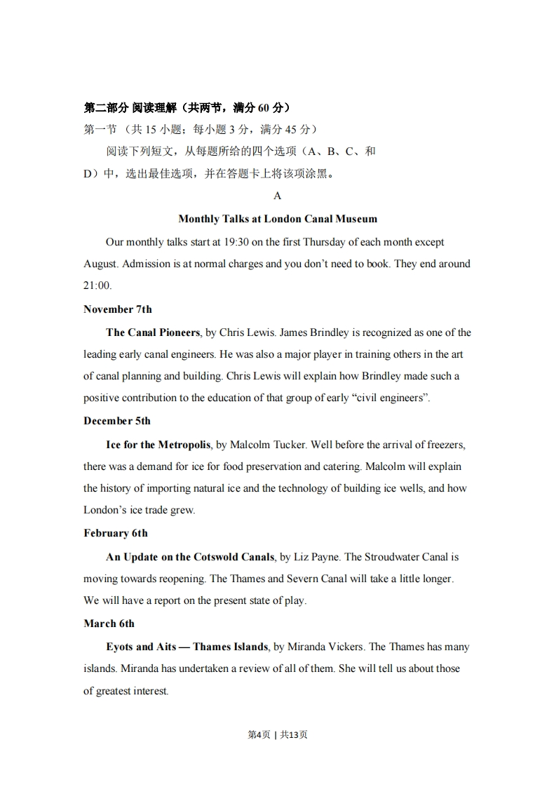 2015年高考英语试卷(新课标I)第一部分听力(共两节,满分30分)做题时,先将答案标在试卷上,录音结束后,你将有两分钟的时间将试卷上的答案转涂到答题卡上。第一节(共5小题,每小题1.5分,满分7.5分)听下面5段对话。每段对话后有一个小题,从题中所给的A、B、C三个选项中选出最佳答案。听完每段对话后,你都有10秒钟的时间来回答有关小题和阅读下一小题。每段对话仅读一遍。例:How much is the shirt?A.£19.15B.f9.18C.f9.15答案是C1.What time is it now?A.9:10B.9:50C.10:002.What does the woman think of the weather?A.It's nice.B.It's warm.C.It's cold.3.What will the man do?A.Attend a meeting.B.Give a lecture.C.Leave his office.4.What is the woman's opinion about the course?A.Too hard.B.Worth taking.C.Very easy.5.What does the woman want the man to do?A.Speak louder.B.Apologize to her.C.Turn off the radio.第二节(共15小题;每小题1.5分,满分22.5分)听下面5段对话或独白。每段对话或独白后有几个小题,从题中所给的A、B、C三个选项中选出最佳选项,并标在试卷的相应位置。听每段对话或独白前,你将有时间阅读各个小题,每小题5秒钟:听完后,各小题将给出5秒钟的作答时间。每段对话或独白读两遍。听第6段材料,回答第6、7题。第1页1共13页6.How long did Michael stay in China?A.Five daysB.One weekC.Two weeks.7.Where did Michael go last year?A.Russia.B.NorwayC.India.听第7段材料,回答第8、9题。8.What food does Sally like?A.Chicken.B.Fish.C.Eggs.9.What are the speakers going to do?A.Cook dinner.B.Go shoppingC.Order dishes.听第8段材料,回答第10至12题。10.Where are the speakers?A.In a hospitalB.In the office.C.At home.11.When is the report due?A.Thursday.B.Friday.C.Next Monday.12.What does George suggest Stephanie do with the report?A.Improve it.B.Hand it in later.C.Leave it with him.听第9段材料,回答第13至16题。13.What is the probable relationship between the speakers?A.Salesperson and customer.B.Homeowner and cleaner.C.Husband and wife.14.What kind of apartment do the speakers prefer?A.One with two bedrooms.B.One without furniture.C.One near a market.15.How much rent should one pay for the one-bedroom apartment?A.$350.B.$400.C.$415.16.Where is the apartment the speakers would like to see?A.On Lake Street.B.On Market Street.C.On South Street.听第10段材料,回答第17至20题。17.What percentage of the world's tea exports go to Britain?第2页|共13页A.Almost 15%.B.About 30%.C.0ver40%.18.Why do tea tasters taste tea with milk?A.Most British people drink tea that way.B.Tea tastes much better with milk.C.Tea with milk is healthy.19.Who suggests a price for each tea?A.Tea tasters.B.Tea exporters.C.Tea companies.20.What is the speaker talking about?A.The life of tea tasters.B.Afternoon tea in Britain.C.The London Tea Trade Centre.第3页1共13页