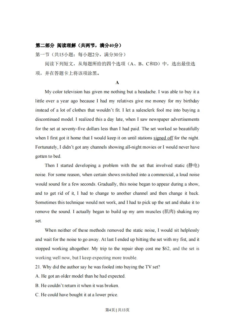 2015年高考英语试卷(新课标Ⅱ)第一部分听力(共两节,满分30分)做题时,先将答案标在试卷上,录音结束后,你将有两分钟的时间将试卷上的答案转涂到答题卡上。第一节(共5小题,每小题1.5分,满分7.5分)听下面5段对话。每段对话后有一个小题,从题中所给的A、B、C三个选项中选出最佳答案。听完每段对话后,你都有10秒钟的时间来回答有关小题和阅读下一小题。每段对话仅读一遍。例:How much is the shirt?A.£19.15B.f9.18C.f9.15答案是C1.What time is it now?A.9:10B.9:50C.10:002.What does the woman think of the weather?A.It's nice.B.It's warm.C.It's cold.3.What will the man do?A.Attend a meeting.B.Give a lecture.C.Leave his office.4.What is the woman's opinion about the course?A.Too hard.B.Worth taking.C.Very easy.5.What does the woman want the man to do?A.Speak louder.B.Apologize to her.C.Turn off the radio.第二节(共15小题;每小题1.5分,满分22.5分)听下面5段对话或独白。每段对话或独白后有几个小题,从题中所给的A、B、C三个选项中选出最佳选项,并标在试卷的相应位置。听每段对话或独白前,你将有时间阅读各个小题,每小题5秒钟:听完后,各小题将给出5秒钟的作答时间。每段对话或独白读两遍。听第6段材料,回答第6、7题。第1页1共13页6.How long did Michael stay in China?A.Five daysB.One weekC.Two weeks.7.Where did Michael go last year?A.Russia.B.NorwayC.India.听第7段材料,回答第8、9题。8.What food does Sally like?A.Chicken.B.Fish.C.Eggs.9.What are the speakers going to do?A.Cook dinner.B.Go shoppingC.Order dishes.听第8段材料,回答第10至12题。10.Where are the speakers?A.In a hospitalB.In the office.C.At home.11.When is the report due?A.Thursday.B.Friday.C.Next Monday.12.What does George suggest Stephanie do with the report?A.Improve it.B.Hand it in later.C.Leave it with him.听第9段材料,回答第13至16题。13.What is the probable relationship between the speakers?A.Salesperson and customer.B.Homeowner and cleaner.C.Husband and wife.14.What kind of apartment do the speakers prefer?A.One with two bedrooms.B.One without furniture.C.One near a market.15.How much rent should one pay for the one-bedroom apartment?A.$350.B.$400.C.$415.16.Where is the apartment the speakers would like to see?A.On Lake Street.B.On Market Street.C.On South Street.听第10段材料,回答第17至20题。17.What percentage of the world's tea exports go to Britain?第2页1共13页A.Almost 15%.B.About 30%.C.0ver40%.18.Why do tea tasters taste tea with milk?A.Most British people drink tea that way.B.Tea tastes much better with milk.C.Tea with milk is healthy.19.Who suggests a price for each tea?A.Tea tasters.B.Tea exporters.C.Tea companies.20.What is the speaker talking about?A.The life of tea tasters.B.Afternoon tea in Britain.C.The London Tea Trade Centre.第3页1共13页