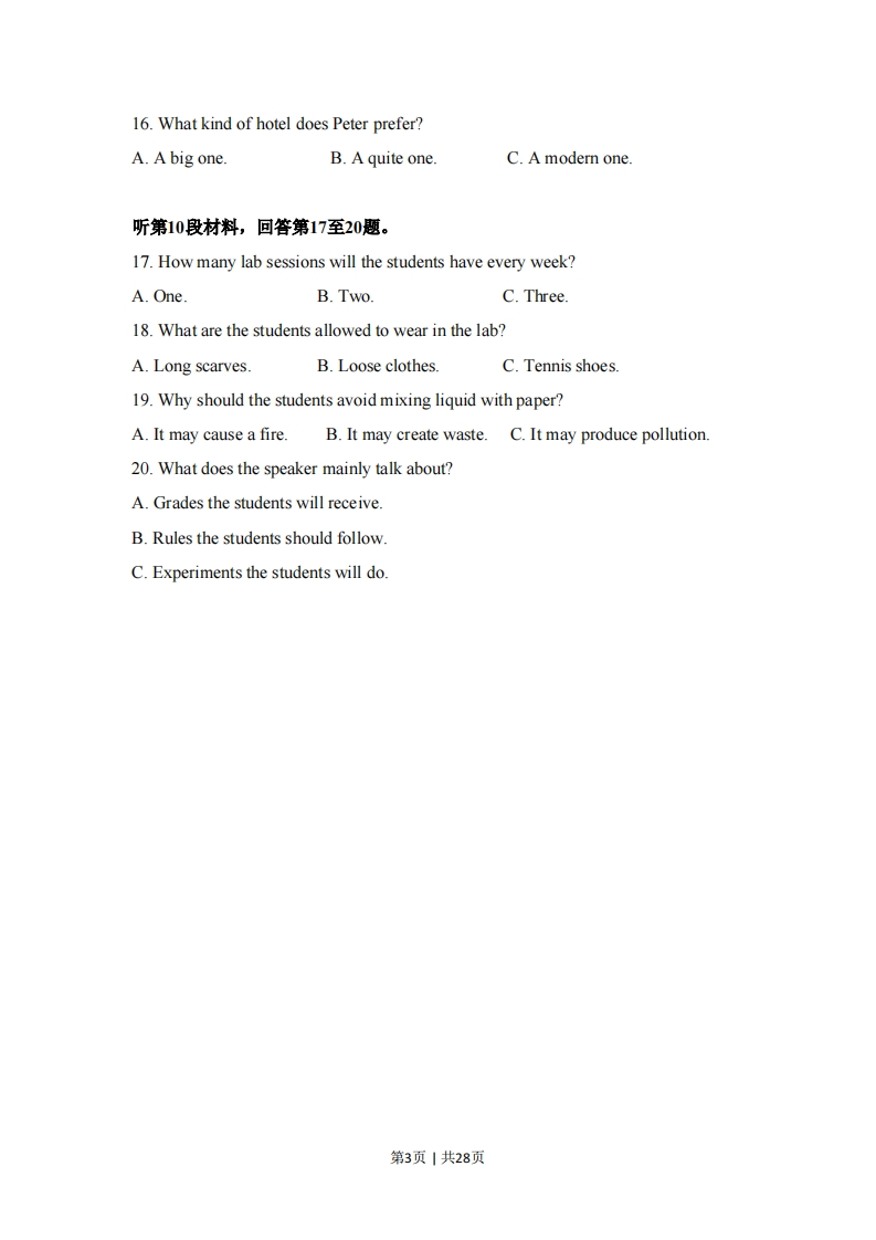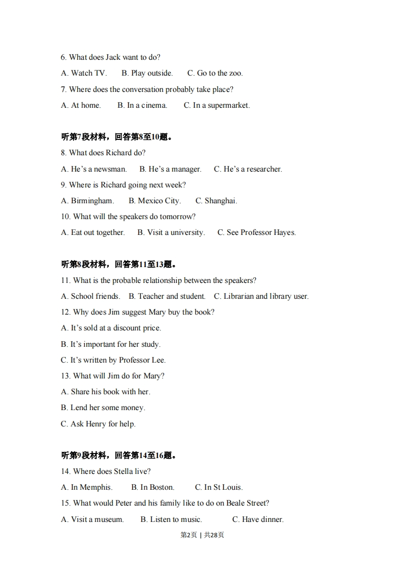 2017年高考英语试卷(新课标Ⅱ卷)事考答案与试题解析第一部分听力(共两节,满分30分)做题时,先将答案标在试卷上,录音结束后,你将有两分钟的时间将试卷上的答案转涂到答题卡上。第一节(共5小题,每小题1.5分,满分7.5分)听下面5段对话。每段对话后有一个小题,从题中所给的A、B、C三个选项中选出最佳答案。听完每段对话后,你都有10秒钟的时间来回答有关小题和阅读下一小题。每段对话仅读一遍。例:How much is the shirt?A.£19.15B.f9.18C.f9.15答案是C1.What will the woman do this afternoon?A.Do some exercise.B.Go shopping.C.Wash her clothes.2.Why does the woman call the man?A.To cancel a flight.B.To make an apology.C.To put off a meeting3.How much more does David need for the car?A.$5,000B.$20,000.C.$25,0004.What is Jane doing?A.Planning a tour.B.Calling her father.C.Asking for leave.5.How does the man feel?A.Tied.B.Dizzy.C.Thirsty.第二节(共15小题;每小题1.5分,满分22.5分)听下面5段对话或独白。每段对话或独白后有几个小题,从题中所给的A、B、C三个选项中选出最佳选项。听每段对话或独白前,你将有时间阅读各个小题,每小题5秒钟:听完后,各小题将给出5秒钟的作答时间。每段对话或独白读两遍。听第6段材料,回答第6、7题。第1页1共28页6.What does Jack want to do?A.Watch TV.B.Play outside.C.Go to the zoo.7.Where does the conversation probably take place?A.At home.B.In a cinema.C.In a supermarket.听第7段材料,回答第8至10题。8.What does Richard do?A.He's a newsman.B.He's a manager.C.He's a researcher.9.Where is Richard going next week?A.Birmingham.B.Mexico City.C.Shanghai.10.What will the speakers do tomorrow?A.Eat out together.B.Visit a university.C.See Professor Hayes.听第8段材料,回答第11至13题。11.What is the probable relationship between the speakers?A.School friends.B.Teacher and student.C.Librarian and library user.12.Why does Jim suggest Mary buy the book?A.It's sold at a discount price.B.It's important for her study.C.It's written by Professor Lee.13.What will Jim do for Mary?A.Share his book with her.B.Lend her some money.C.Ask Henry for help.听第段材料,回答第14至16题。14.Where does Stella live?A.In MemphisB.In Boston.C.In St Louis15.What would Peter and his family like to do on Beale Street?A.Visit a museum.B.Listen to music.C.Have dinner.第2页|共28页16.What kind of hotel does Peter prefer?A.A big one.B.A quite one.C.A modern one.听第10段材料,回答第17至20题。17.How many lab sessions will the students have every week?A.OneB.Two.C.Three.18.What are the students allowed to wear in the lab?A.Long scarves.B.Loose clothes.C.Tennis shoes.19.Why should the students avoid mixing liquid with paper?A.It may cause a fire.B.It may create waste.C.It may produce pollution.20.What does the speaker mainly talk about?A.Grades the students will receiveB.Rules the students should follow.C.Experiments the students will do.第3页1共28页