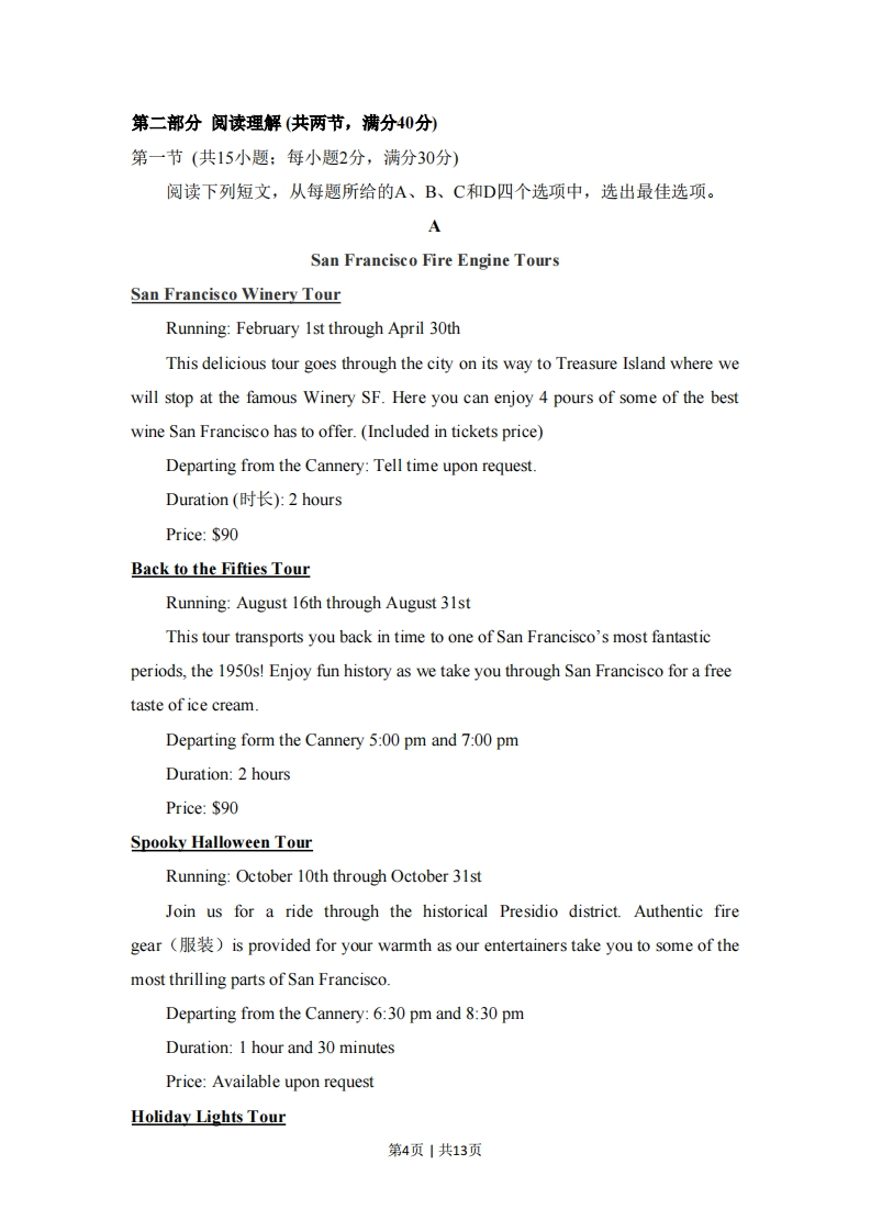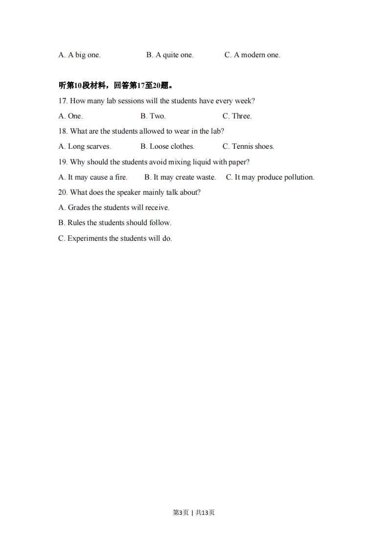 2017年高考英语试卷(新课标Ⅲ卷)第一部分听力(共两节,满分30分)做题时,先将答案标在试卷上,录音结束后,你将有两分钟的时间将试卷上的答案转涂到答题卡上。第一节(共5小题,每小题1.5分,满分7.5分)听下面5段对话。每段对话后有一个小题,从题中所给的A、B、C三个选项中选出最佳答案。听完每段对话后,你都有10秒钟的时间来回答有关小题和阅读下一小题。每段对话仅读一遍。例:How much is the shirt?A.£19.15B.9.18C.f9.15答案是C,1.What will the woman do this afternoon?A.Do some exercise.B.Go shopping.C.Wash her clothes.2.Why does the woman call the man?A.To cancel a flight.B.To make an apology.C.To put offa meeting.3.How much more does David need for the car?A.$5,000.B.$20.000.C.$25.0004.What is Jane doing?A.Planning a tour.B.Calling her father.C.Asking for leave.5.How does the man feel?A.Tied.B.Dizzy.C.Thirsty.第二节(共15小题;每小题1.5分,满分22.5分)听下面5段对话或独白。每段对话或独白后有几个小题,从题中所给的A、B、C三个选项中选出最佳选项。听每段对话或独白前,你将有时间阅读各个小题,每小题5秒钟:听完后,各小题将给出5秒钟的作答时间。每段对话或独白读两遍。听第6段材料,回答第6、7题。6.What does Jack want to do?第1页|共13页A.Watch TV.B.Play outside.C.Go to the zoo.7.Where does the conversation probably take place?A.At home.B.In a cinema.C.In a supermarket.听第7段材料,回答第8至10题。8.What does Richard do?A.He's a newsman.B.He's a manager.C.He's a researcher.9.Where is Richard going next week?A.Birmingham.B.Mexico City.C.Shanghai.10.What will the speakers do tomorrow?A.Eat out together.B.Visit a university.C.See Professor Hayes.听第8段材料,回答第11至13题。11.What is the probable relationship between the speakers?A.School friends.B.Teacher and student.C.Librarian and library user.12.Why does Jim suggest Mary buy the book?A.It's sold at a discount price.B.It's important for her study.C.It's written by Professor Lee13.What will Jim do for Mary?A.Share his book with her.B.Lend her some money.C.Ask Henry for help.听第9段材料,回答第14至16题。14.Where does Stella live?A.In Memphis.B.In Boston.C.In St Louis.15.What would Peter and his family like to do on Beale Street?A.Visit a museum.B.Listen to music.C.Have dinner.16.What kind of hotel does Peter prefer?第2页|共13页A.A big one.B.A quite one.C.A modern one.听第10段材料,回答第17至20题。17.How many lab sessions will the students have every week?A.One.B.Two.C.Three.18.What are the students allowed to wear in the lab?A.Long scarves.B.Loose clothes.C.Tennis shoes.19.Why should the students avoid mixing liquid with paper?A.It may cause a fire.B.It may create waste.C.It may produce pollution.20.What does the speaker mainly talk about?A.Grades the students will receive.B.Rules the students should follow.C.Experiments the students will do.第3页1共13页