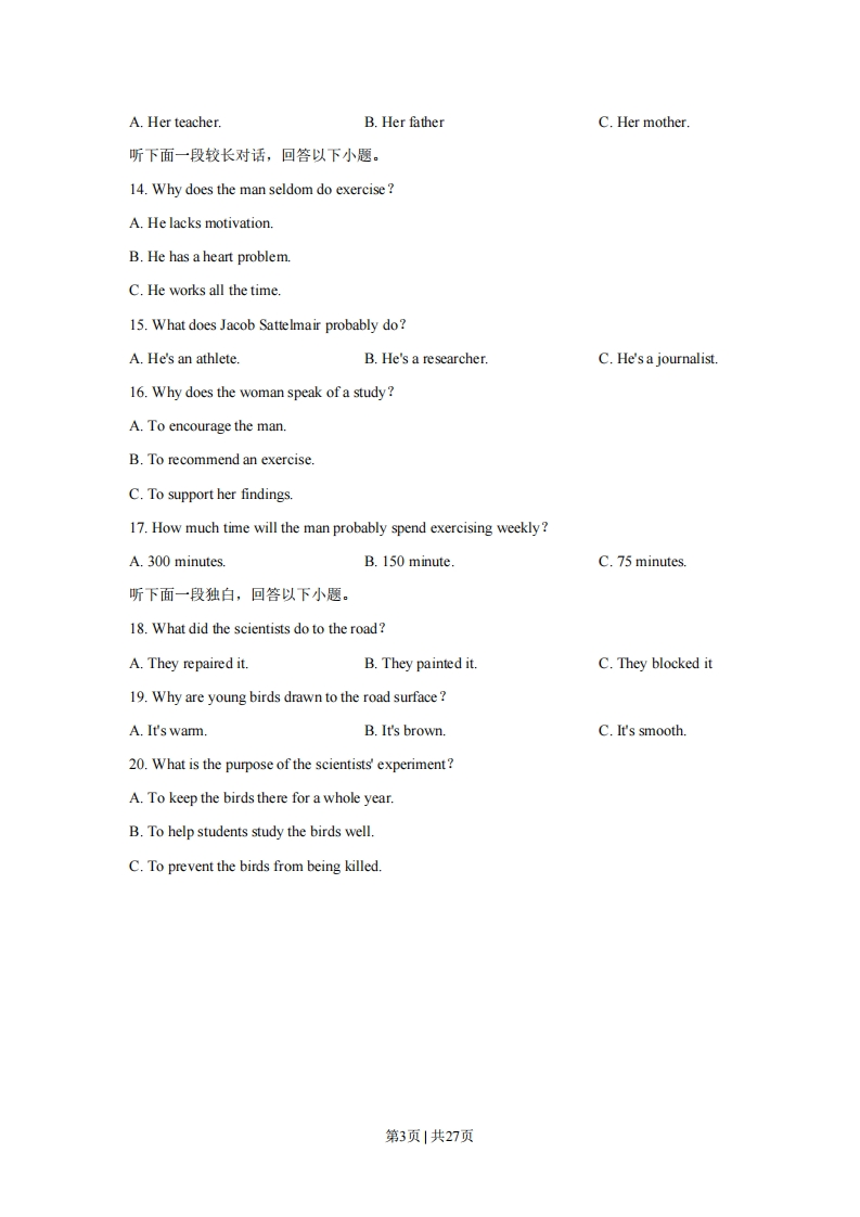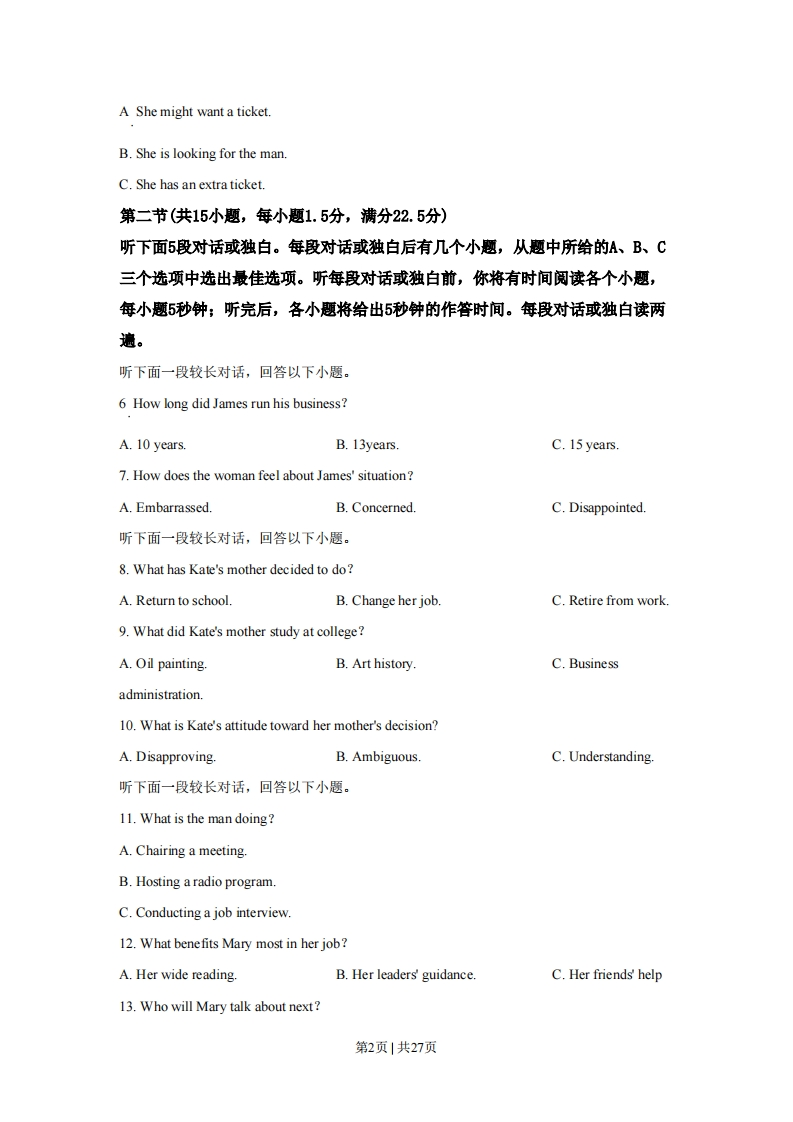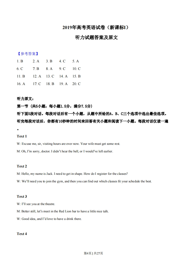 2019年普通高等学校招生全国统一考试(新课标I)英语注意事项:1.答卷前,考生务必将自己的姓名、准考证号填写在答题卡上。2.回答选择题时,选出每小题答案后,用铅笔把答题卡上对应题目的答案标号涂黑。如需改动,用橡皮擦干净后,再选涂其他答案标号。回答非选释题时,将答案写在答题卡上,写在本试卷上无效。3.考试结束后,将本试卷和答题卡一并交回。第一部分听力(共两节,满分30分)做题时,先将答案标在试卷上。录音内容结束后,你将有两分钟的时间将试卷上的答案转涂到答题卡上。第一节(共5小题;每小题1.5分,满分7.5分)听下面5段对话。每段对话后有一个小题,从题中所给的A、B、C三个选项中选出最佳选项。听完每段对话后,你都有10秒钟的时间来回答有关小题和阅读下一小题。每段对话仅读一遍。例:How much is the shirt?A.19.15.B.9.18.C.9.15.答案是C。1.Where does this conversation take place?A.In a classroomB.In a hospital.C.In a museum2.What does Jack want to do?A.Take fitness classes.B.Buy a pair of gym shoes.C.Change his work schedule.3.What are the speakers talking about?A.What to drinkB.Where to meet.C.When to leave.4.What is the relationship between the speakers?A.Colleges.B.Classmates.C.Strangers.5.Why is Emily mentioned in the conversation?第1页1共27页A She might want a ticket.B.She is looking for the man.C.She has an extra ticket.第二节(共15小题,每小题1.5分,满分22.5分)听下面5段对话或独白。每段对话或独白后有几个小题,从题中所给的A、B、C三个选项中选出最佳选项。听每段对话或独白前,你将有时间阅读各个小题,每小题5秒钟;听完后,各小题将给出5秒钟的作答时间。每段对话或独白读两遍。听下面一段较长对话,回答以下小题。6 How long did James run his business?A.10 yearsB.13years.C.15 years.7.How does the woman feel about James'situation?A.Embarrassed.B.Concerned.C.Disappointed.听下面一段较长对话,回答以下小题。8.What has Kate's mother decided to do?A.Return to school.B.Change her job.C.Retire from work9.What did Kate's mother study at college?A.Oil painting.B.Art history.C.Businessadministration.10.What is Kate's attitude toward her mother's decision?A.Disapproving.B.Ambiguous.C.Understanding.听下面一段较长对话,回答以下小题。11.What is the man doing?A.Chairing a meeting.B.Hosting a radio program.C.Conducting a job interview.12.What benefits Mary most in her job?A.Her wide reading.B.Her leaders'guidance.C.Her friends'help13.Who will Mary talk about next?第2页|共27页A.Her teacher.B.Her fatherC.Her mother.听下面一段较长对话,回答以下小题。14.Why does the man seldom do exercise?A.He lacks motivation.B.He has a heart problem.C.He works all the time.15.What does Jacob Sattelmair probably do?A.He's an athlete.B.He's a researcher.C.He's a journalist.16.Why does the woman speak of a study?A.To encourage the man.B.To recommend an exercise.C.To support her findings.17.How much time will the man probably spend exercising weekly?A.300 minutes.B.150 minute.C.75 minutes.听下面一段独白,回答以下小题。18.What did the scientists do to the road?A.They repaired it.B.They painted it.C.They blocked it19.Why are young birds drawn to the road surface?A.It's warmB.It's brown.C.It's smooth.20.What is the purpose of the scientists'experiment?A.To keep the birds there for a whole yearB.To help students study the birds well.C.To prevent the birds from being killed.第3页1共27页