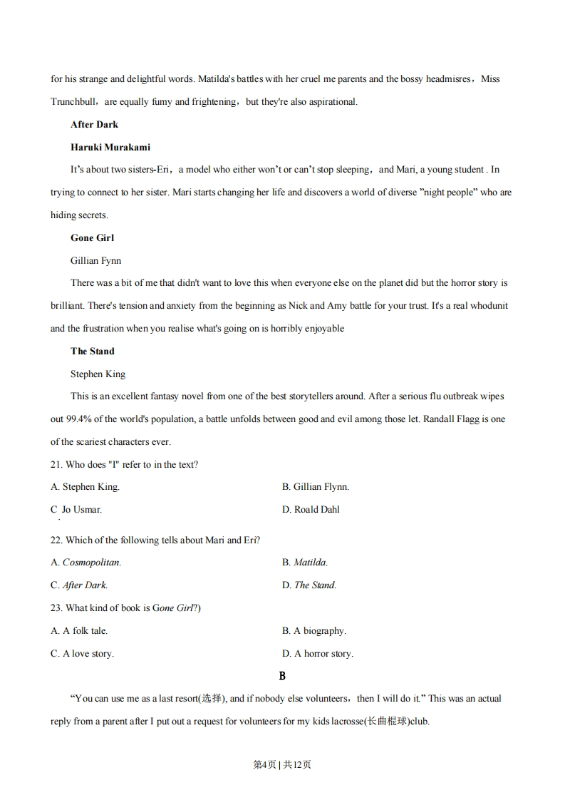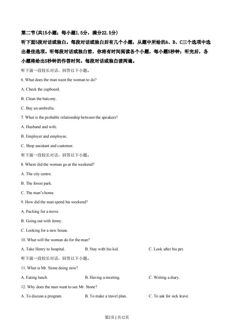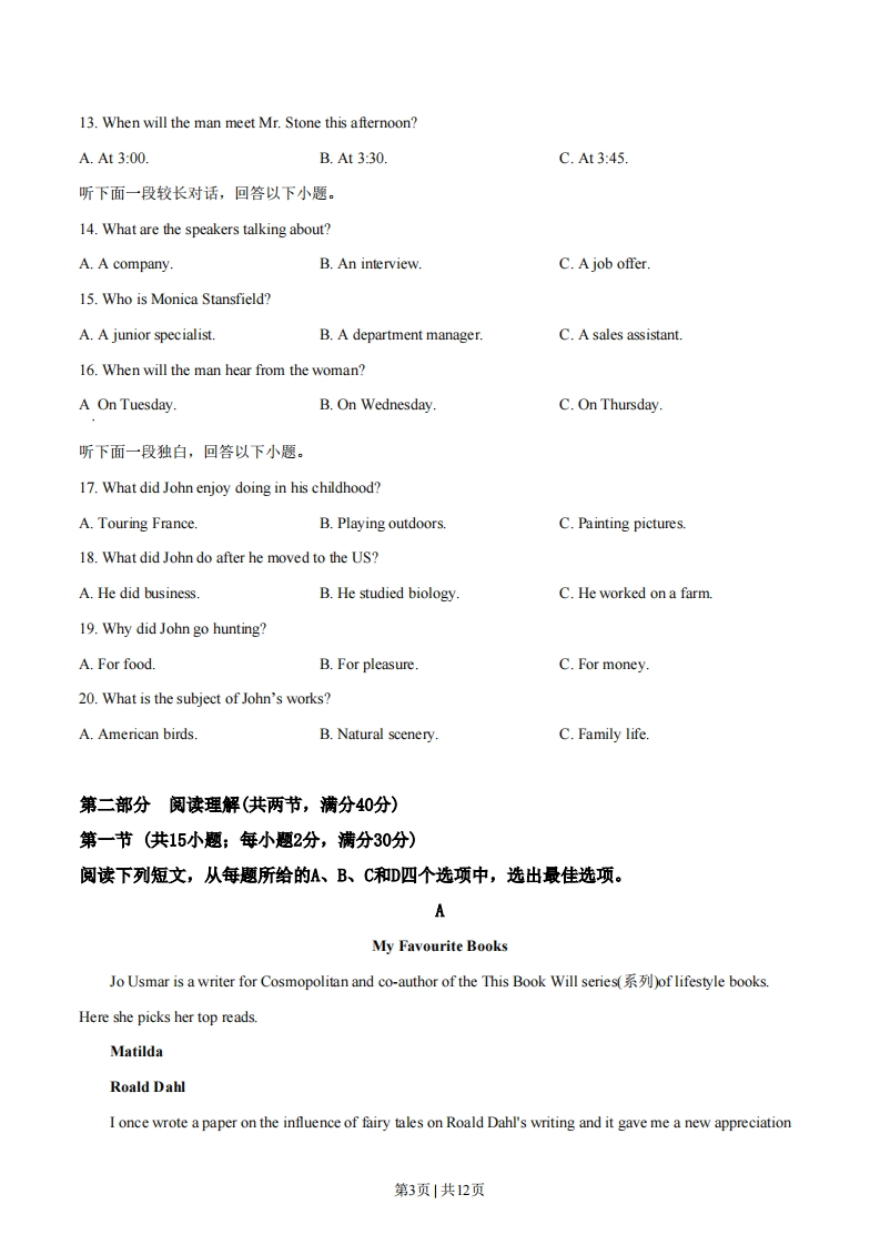 2019年普通高等学校招生全国统一考试(新课标II)英语注意事项:1.答卷前,考生务必将自己的姓名、准考证号填写在答题卡上。2.回答选择题时,选出每小题答案后,用铅笔把答题卡上对应题目的答案标号涂黑。如需改动,用橡皮擦干净后,再选涂其他答案标号。回答非选择题时,将答案写在答题卡上,写在本试卷上无效。3.考试结束后,将本试卷和答题卡一并交回。第一部分听力(共两节,满分30分)做题时,先将答案标在试卷上。录音内容结束后,你将有两分钟的时间将试卷上的答案转涂到答题卡上。第一节(共5小题;每小题1.5分,满分7.5分)听下面5段对话。每段对话后有一个小题,从题中所给的A、B、C三个选项中选出最住选项。听完每段对话后,你都有10秒钟的时间来回答有关小题和阅读下一小题。每段对话仅读一遍例:How much is the shirt?A.£19.15.B.9.18.C.f9.15.答案是C。1.Where does the conversation probably take place?A.In a library.B.In a bookstoreC.In a classroom2.How does the woman feel now?A.Relaxed.B.Excited.C.Tired.3.How much will the man pay?A.$520.B.$80C.$100.4.What does the man tell Jane to do?A.Postpone his appointmentB.Meet Mr.Douglas.C.Return at 3 o'clock.5.Why would David quit his job?A.To go back to school.B.To start his own firm.C.To work for his friend.第1页|共12页第二节(共15小题;每小题1.5分,满分22.5分)听下面5段对话或独白。每段对话或独白后有几个小题,从题中所给的A、B、C三个选项中选出最佳选项。听每段对话或独白前,你将有时间阅读各个小题,每小题5秒钟;听完后,各小题将给出5秒钟的作答时间。每段对话或独白读两遍。听下面一段较长对话,回答以下小题。6.What does the man want the woman to do?A.Check the cupboard.B.Clean the balconyC.Buy an umbrella.7.What is the probable relationship between the speakers?A.Husband and wife.B.Employer and employee.C.Shop assistant and customer听下面一段较长对话,回答以下小题。8.Where did the woman go at the weekend?A.The city centre.B.The forest park.C.The man's home.9.How did the man spend his weekend?A.Packing for a move.B.Going out with Jenny.C.Looking for a new house.10.What will the woman do for the man?A.Take Henry to hospital.B.Stay with his kid.C.Look after his pet.听下面一段较长对话,回答以下小题。11.What is Mr.Stone doing now?A.Eating lunch.B.Having a meeting.C.Writing a diary.12.Why does the man want to see Mr.Stone?A.To discuss a program.B.To make a travel plan.C.To ask for sick leave.第2页|共12页13.When will the man meet Mr.Stone this afternoon?A.At3:00B.At3:30.C.At3:45听下面一段较长对话,回答以下小题。14.What are the speakers talking about?A.A companyB.An interview.C.A job offer.15.Who is Monica Stansfield?A.A junior specialist.B.A department manager.C.A sales assistant.16.When will the man hear from the woman?A On Tuesday.B.On Wednesday.C.On Thursday.听下面一段独白,回答以下小题。17.What did John enjoy doing in his childhood?A.Touring France.B.Playing outdoors.C.Painting pictures.18.What did John do after he moved to the US?A.He did business.B.He studied biology.C.He worked on a farm19.Why did John go hunting?A.For food.B.For pleasure.C.For money.20.What is the subject of John's works?A.American birdsB.Natural scenery.C.Family life.第二部分阅读理解(共两节,满分40分)第一节(共15小题;每小题2分,满分30分)阅读下列短文,从每题所给的A、B、C和D四个选项中,选出最佳选项。AMy Favourite BooksJo Usmar is a writer for Cosmopolitan and co-author of the This Book Will series()of lifestyle books.Here she picks her top reads.MatildaRoald DahlI once wrote a paper on the influence of fairy tales on Roald Dahl's writing and it gave me a new appreciation第3页1共12页