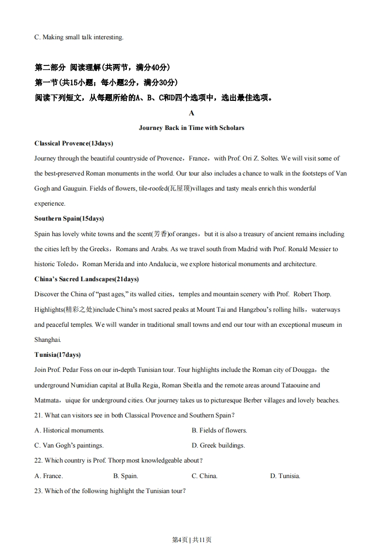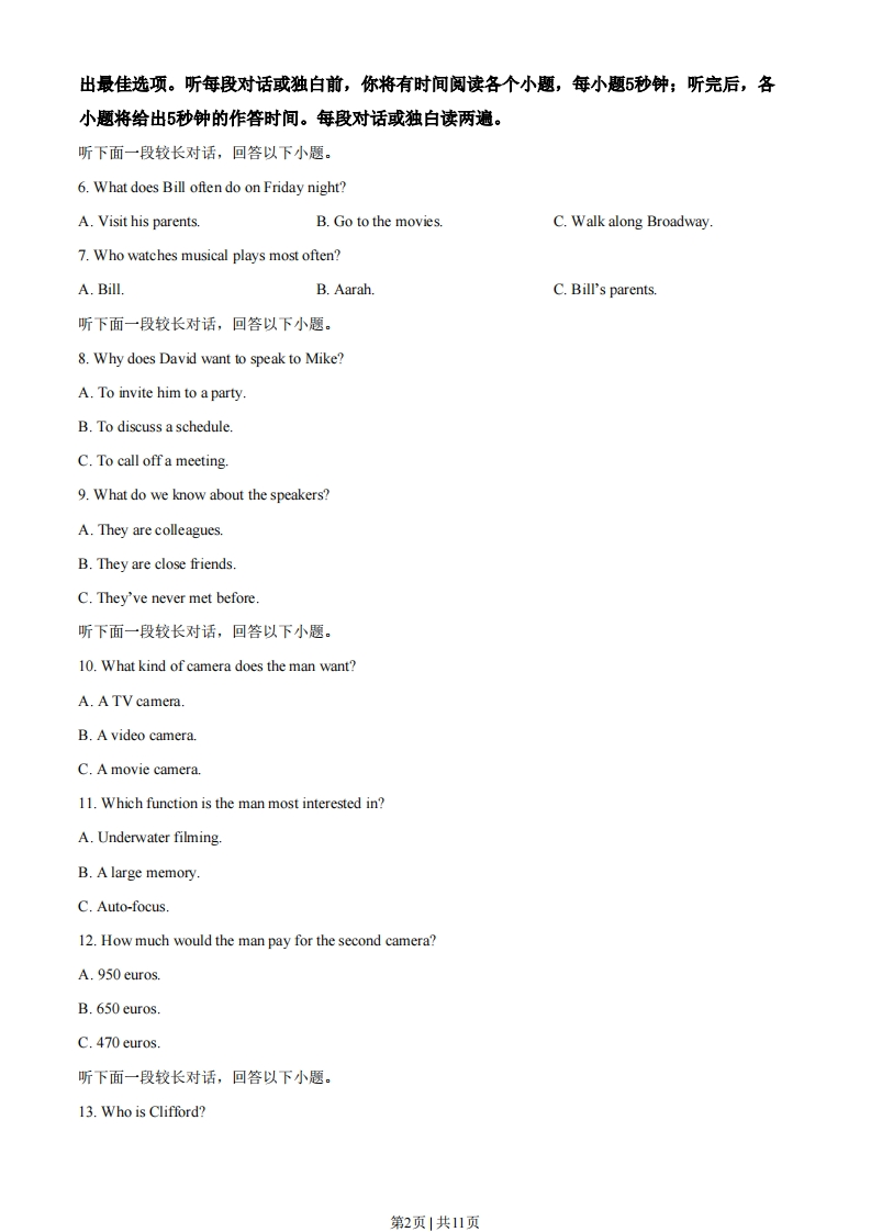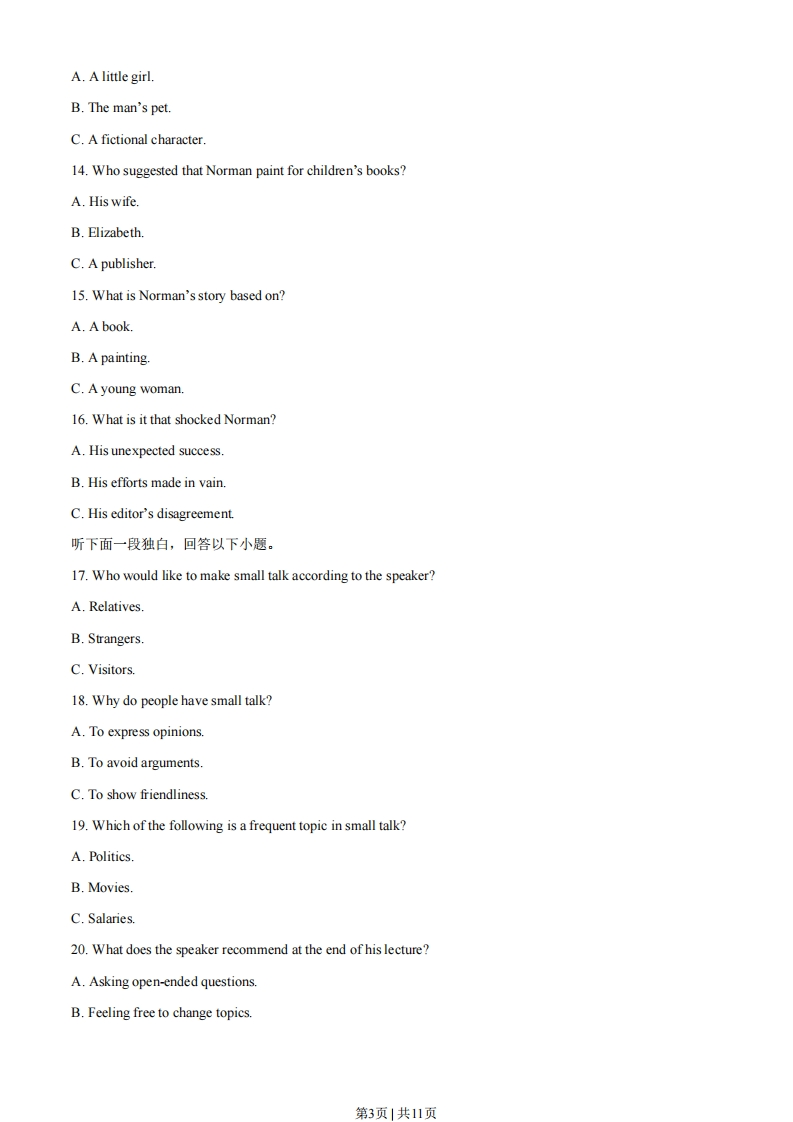 2020年普通高等学校招生全国统一考试(全国卷III)英语注意事项:1.答卷前,考生务必将自己的姓名、准考证号填写在答题卡和试卷指定位置上。2.回答选择题时,选出每小题答案后,用铅笔把答题卡上对应题目的答案标号涂黑。如需改动,用橡皮擦干净后,再选涂其他答案标号。回答非选择题时,将答案写在答题卡上,写在本试卷上无效。3.考试结束后,将本试卷和答题卡一并交回。第一部分听力(共两节,满分30分)第一节(共5小题;每小题1.5分,满分7.5分)听下面5段对话。每段对话后有一个小题,从题中所给的A、B、C三个选项中选出最佳选项。听完每段对话后,你都有10秒钟的时间来回答有关小题和阅读下一小题。每段对话仅读一遍例:How much is the shirt?A.£19.15.B.9.18.C.9.15.答案是C。1.Where does the conversation probably take place?A.In a supermarket.B.In the post office.C.In the street.2.What did Carl do?A.He designed a medal.B.He fixed a TV set.C.He took a test.3.What does the man do?A He's a tailor.B.He's a waiter.C.He's a shop assistant.4.When will the flight arrive?A.At18:20B.At18:35.C.At18:50.5.How can the man improve his article?A.By deleting unnecessary words.B.By adding a couple of points.C.By correcting grammar mistakes.第二节(共15小题;每小题1.5分,满分22.5分)听下面5段对话或独白。每段对话或独白后有几个小题,从题中所给的A、B、C三个选项中选第1页|共11页出最佳选项。听每段对话或独白前,你将有时间阅读各个小题,每小题5秒钟;听完后,各小题将给出5秒钟的作答时间。每段对话或独白读两遍。听下面一段较长对话,回答以下小题。6.What does Bill often do on Friday night?A.Visit his parentsB.Go to the movies.C.Walk along Broadway.7.Who watches musical plays most often?A.Bill.B.AarahC.Bill's parents.听下面一段较长对话,回答以下小题。8.Why does David want to speak to Mike?A.To invite him to a party.B.To discuss a scheduleC.To call off a meeting.9.What do we know about the speakers?A.They are colleagues.B.They are close friends.C.They've never met before.听下面一段较长对话,回答以下小题。10.What kind of camera does the man want?A.A TV camera.B.A video cameraC.A movie camera.11.Which function is the man most interested in?A.Underwater filmingB.A large memory.C.Auto-focus.12.How much would the man pay for the second camera?A.950 euros.B.650 euros.C.470 euros.听下面一段较长对话,回答以下小题。13.Who is Clifford?第2页1共11页A.A little girl.B.The man's pet.C.A fictional character.14.Who suggested that Norman paint for children's books?A.His wife.B.Elizabeth.C.A publisher.15.What is Norman's story based on?A.A book.B.A painting.C.A young woman.16.What is it that shocked Norman?A.His unexpected successB.His efforts made in vainC.His editor's disagreement.听下面一段独白,回答以下小题。17.Who would like to make small talk according to the speaker?A.Relatives.B.Strangers.C.Visitors.18.Why do people have small talk?A.To express opinions.B.To avoid arguments.C.To show friendliness.19.Which of the following is a frequent topic in small talk?A.PoliticsB.Movies.C.Salaries.20.What does the speaker recommend at the end of his lecture?A.Asking open-ended questions.B.Feeling free to change topics.第3页1共11页