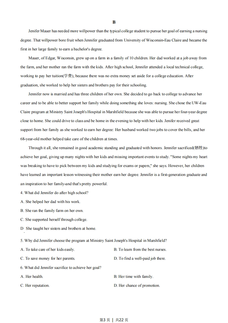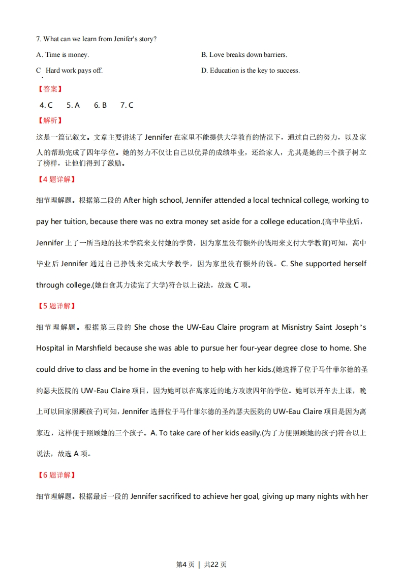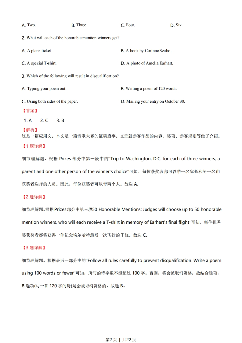2020年普通高等学校招生全国统一考试·新高考I卷英语注意事项:1.答卷前,考生务必将自己的姓名、准考证号填写在答题卡上。2.回答选择题时,选出每小题答案后,用铅笔把答题卡上对应题目的答案标号涂黑。如需改动,用橡皮擦干净后,再选涂其他答案标号。回答非选择题时,将答案写在答题卡上,写在本试卷上无效。3.考试结束后,将本试卷和答题卡一并交回。第一部分阅读(共两节,满分50分)第一节(共15小题:每小题2.5分,满分37.5分)阅读下列短文,从每题所给的A、B、C、D四个选项中选出最佳选项。APOETRY CHALLENGEWrite a poem about how courage,determination,and strength have helped you face challenges in your life.Prizes3 Grand Prizes:Trip to Washington,D.C.for each of three winners,a parent and one other person of thewinner's choice.Trip includes round-trip air tickets,hotel stay for two nights,and tours of the National Air and SpaceMuseum and the office of National Geographic World.6 First Prizes:The book Sky Pioneer:A Photobiography of Amelia Earhart signed by author Corinne Szabo andpilot Linda Finch50 Honorable Mentions:Judges will choose up to 50 honorable mention winners,who will each receive aT-shirt in memory of Earhart's final flight.RulesFollow all rules carefully to prevent disqualification.Write a poem using 100 words or fewer.Your poem can be any format,any number of lines.Write by hand or type on a single sheet of paper.You may use both the front and back of the paper.On the same sheet of paper,write or type your name,address,telephone number,and birth date.Mail your entry to us by October 31 this year.1.How many people can each grand prize winner take on the free trip?第1页|共22页A.Two.B.Three.C.Four.D.Six.2.What will each of the honorable mention winners get?A.A plane ticket.B.A book by Corinne Szabo.C.A special T-shirt.D.A photo of Amelia Earhart.3.Which of the following will result in disqualification?A.Typing your poem out.B.Writing a poem of 120 words.C.Using both sides of the paper.D.Mailing your entry on October 30.【答案】1.A2.C3.B【解析】这是一篇应用文。本文是一篇诗歌大赛的征稿启事。文章就参赛作品的内容、奖项、参赛规则等做了介绍。【1题详解】细节理解题。根据Prizes部分中第一段中的“Trip to Washington,D.C.for each of three winners,,aparent and one other person of the winner's choice"可知,每位获奖者都可以带一名家长和另一名由获奖者选择的人员。因此,每位获奖者可以带两个人。故选A。【2题详解】细节理解题.根据Prizes部分中第三段50 Honorable Mentions:Judges will choose up to50 honorablemention winners,who will each receive a T-shirt in memory of Earhart's final flight''可知,每位优秀奖获奖者都将获得一件纪念埃尔哈特最后一次飞行的T恤。故选C。【3题详解】细节理解题。根据最后一部分中的Follow all rules carefully to prevent disqualification.Write a poemusing100 words or fewer''可知,所写的诗字数不能超过100字。否则,将会被取消资格。故结合选项,B选项(写一首120字的诗)是会被取消资格的。故选B。第2页|共22页BJenifer Mauer has needed more willpower than the typical college student to pursue her goal of earning a nursingdegree.That willpower bore fruit when Jennifer graduated from University of Wisconsin-Eau Claire and became thefirst in her large family to earn a bachelor's degree.Mauer,of Edgar,Wisconsin,grew up on a farm in a family of 10 children.Her dad worked at a job away fromthe farm,and her mother ran the farm with the kids.After high school,Jennifer attended a local technical college,working to pay her tuition(),because there was no extra money set aside for a college education.Aftergraduation,she worked to help her sisters and brothers pay fo