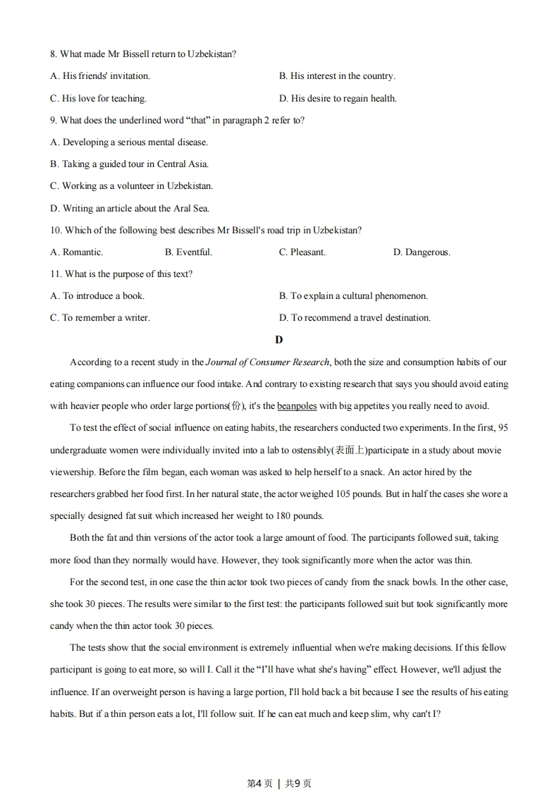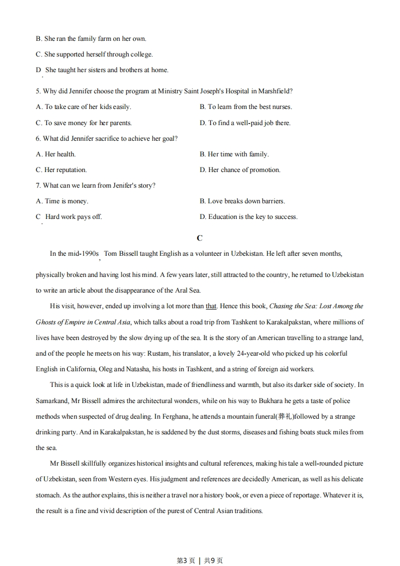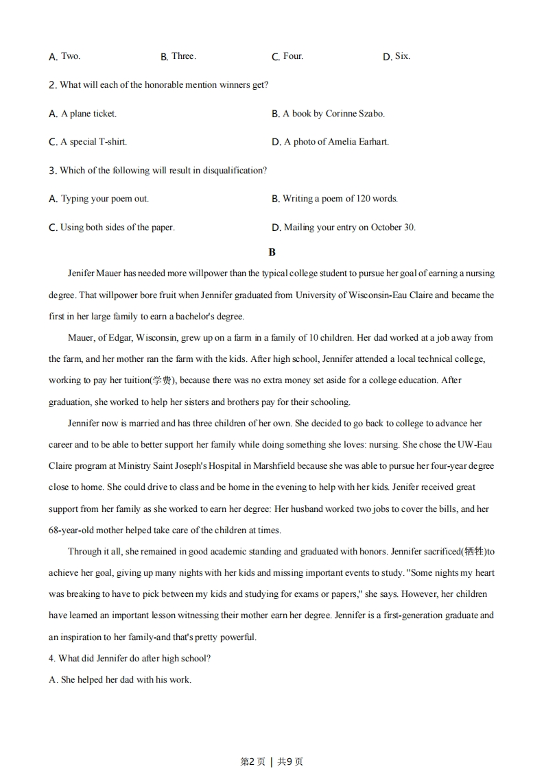 2020年普通高等学校招生全国统一考试·新高考I卷英语注意事项:1.答卷前,考生务必将自己的姓名、准考证号填写在答题卡上。2.回答选择题时,选出每小题答案后,用铅笔把答题卡上对应题目的答案标号涂黑。如需改动,用橡皮擦干净后,再选涂其他答案标号。回答非选择题时,将答案写在答题卡上,写在本试卷上无效。3.考试结束后,将本试卷和答题卡一并交回。第一部分阅读(共两节,满分50分)第一节(共15小题:每小题2.5分,满分37.5分)阅读下列短文,从每题所给的A、B、C、D四个选项中选出最佳选项。APOETRY CHALLENGEWrite a poem about how courage,determination,and strength have helped you face challenges in your life.Prizes3 Grand Prizes:Trip to Washington,D.C.for each of three winners,a parent and one other person of thewinner's choice.Trip includes round-trip air tickets,hotel stay for two nights,and tours of the National Air and SpaceMuseum and the office of National Geographic World.6 First Prizes:The book Sky Pioneer:A Photobiography of Amelia Earhart signed by author Corinne Szabo andpilot Linda Finch50 Honorable Mentions:Judges will choose up to 50 honorable mention winners,who will each receive aT-shirt in memory of Earhart's final flight.RulesFollow all rules carefully to prevent disqualification.Write a poem using 100 words or fewer.Your poem can be any format,any number of lines.Write by hand or type on a single sheet of paper.You may use both the front and back of the paper.On the same sheet of paper,write or type your name,address,telephone number,and birth date.Mail your entry to us by October 31 this year.1.How many people can each grand prize winner take on the free trip?第1页|共9页A.Two.B.Three.C.Four.D.Six.2.What will each of the honorable mention winners get?A.A plane ticket.B.A book by Corinne Szabo.C.A special T-shirt.D.A photo of Amelia Earhart.3.Which of the following will result in disqualification?A.Typing your poem out.B.Writing a poem of 120 words.C.Using both sides of the paper.D.Mailing your entry on October 30.Jenifer Mauer has needed more willpower than the typical college student to pursue her goal of earning a nursingdegree.That willpower bore fruit when Jennifer graduated from University of Wisconsin-Eau Claire and became thefirst in her large family to earn a bachelor's degree.Mauer,of Edgar,Wisconsin,grew up on a farm in a family of 10 children.Her dad worked at a job away fromthe farm,and her mother ran the farm with the kids.After high school,Jennifer attended a local technical college,working to pay her tuition(),because there was no extra money set aside for a college education.Aftergraduation,she worked to help her sisters and brothers pay for their schooling.Jennifer now is married and has three children of her own.She decided to go back to college to advance hercareer and to be able to better support her family while doing something she loves:nursing.She chose the UW-EauClaire program at Ministry Saint Joseph's Hospital in Marshfield because she was able to pursue her four-year degreeclose to home.She could drive to class and be home in the evening to help with her kids.Jenifer received greatsupport from her family as she worked to earn her degree:Her husband worked two jobs to cover the bills,and her68-year-old mother helped take care of the children at times.Th