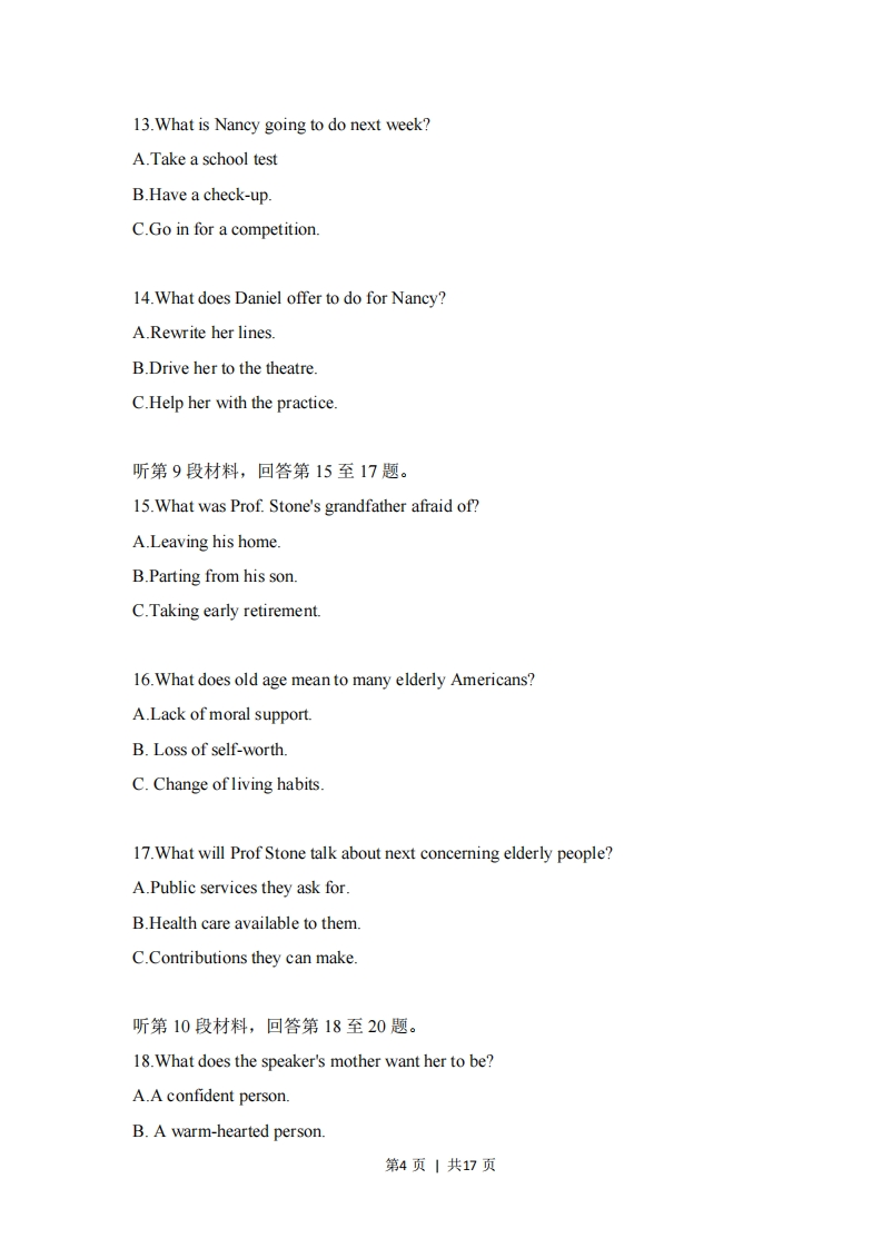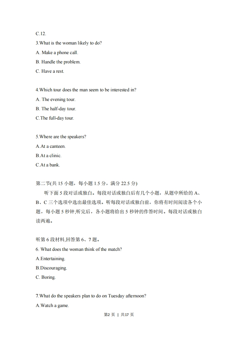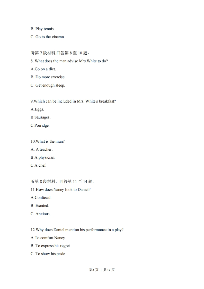 2021年普通高等学校招生全国统一考试(全国乙卷)英语注意事项:1.答卷前,考生务必将自己的姓名、准考证号填写在答题卡上。2.回答选择题时,选出每小题答案后,用铅笔把答题卡上对应题目的答案标号涂黑。如需改动,用橡皮擦干净后,再选涂其他答案标号。回答非选择题时,将答案写在答题卡上,写在本试卷上无效。3.考试结束后,将本试卷和答题卡一并交回。第一部分听力(共两节,满分30分)做题时,先将答案标在试卷上。录音内容结束后,你将有两分钟的时间将试卷上的答案转涂到答题卡上。第一节(共5小题:每小题1.5分,满分7.5分)听下面5段对话。每段对话后有一个小题,从题中所给的A、B、C三个选项中选出最佳选项。听完每段对话后,你都有10秒钟的时间来回答有关小题和阅读下一小题。每段对话仅读一遍。例:How much is the shirt?A.19.15B.f9.18C.9.15.答案是C。1.What is the man doing?A.Asking the way.B.Giving directionsC.Correcting a mistake.2.What dress size does the woman want?A.8.B.10.第1页|共17页C.123.What is the woman likely to do?A.Make a phone call.B.Handle the problem.C.Have a rest.4.Which tour does the man seem to be interested in?A.The evening tour.B.The half-day tour.C.The full-day tour.5.Where are the speakers?A.At a canteen.B.At a clinic.C.At a bank.第二节(共15小题,每小题1.5分,满分22.5分)听下面5段对话或独白。每段对话或独白后有几个小题,从题中所给的A、B、C三个选项中选出最佳选项。听每段对话或独白前,你将有时间阅读各个小题,每小题5秒钟:听完后,各小题将给出5秒钟的作答时间。每段对话或独白读两遍。听第6段材料,回答第6、7题。6.What does the woman think of the match?A.Entertaining.B.Discouraging.C.Boring.7.What do the speakers plan to do on Tuesday afternoon?A.Watch a game.第2页|共17页B.Play tennis.C.Go to the cinema.听第7段材料,回答第8至10题。8.What does the man advise Mrs.White to do?A.Go on a diet.B.Do more exercise.C.Get enough sleep.9.Which can be included in Mrs.White's breakfast?A.Eggs.B.Sausages.C.Porridge.10.What is the man?A.A teacher.B.A physician.C.A chef.听第8段材料,回答第11至14题。11.How does Nancy look to Daniel?A.Confused.B.Excited.C.Anxious.12.Why does Daniel mention his performance in a play?A.To comfort Nancy.B.To express his regretC.To show his pride.第3页|共17页
