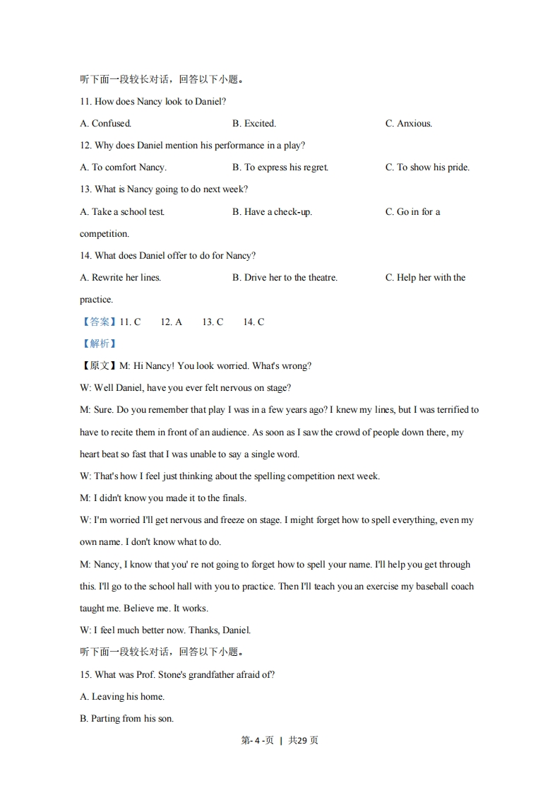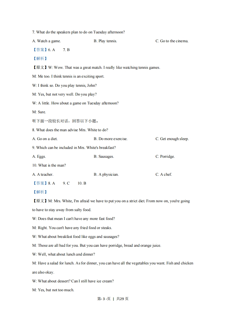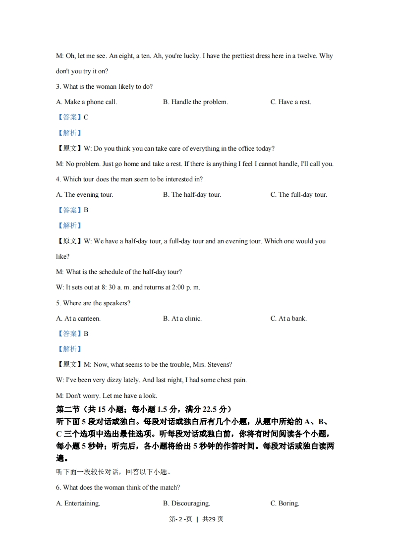 2021年全国高考乙卷英语试题注意事项:1、答卷前,考生务必将自己的姓名、准考证号填写在答题卡上。2.回答选释题时,选出每小题答案后,用铅笔把答题卡上对应题目的答案标号涂黑。如需改动,用橡皮擦干净后,再选涂其他答案标号。回答非选择题时,将答案写在答题卡上,写在本试卷上无效。3.考试结束后,将本试卷和答题卡一并交回。第一部分听力(共两节,满分30分)做题时,先将答案标在试卷上。录音内容结束后,你将有两分钟的时间将试卷上的答案转涂到答题卡上。第一节(共5小题;每小题1.5分,满分7.5分)听下面5段对话。每段对话后有一个小题,从题中所给的A、B、C三个选项中选出最佳选项。听完每段对话后,你都有10秒钟的时间来回答有关小题和阅读下一小题。每段对话仅读一遍。例:How much is the shirt?A.£19.15.B.£9.18C.£9.15答案是C。1.What is the man doing?A.Asking the way.B.Giving directions.C.Correcting a mistake.【答案】A【解析】【原文】M:Excuse me,I got lost.I took a bus to city hall,,but I can't find the place.W:This is the concert hall,not city hall.To go there,you should take the bus at Grand Hotel overthere.2.What dress size does the woman want?A.8B.10C.12.【答案】C【解析】【原文】M:Can I help you?W:I'm looking for a size twelve dress.第1-页1共29页M:Oh,let me see.An eight,a ten.Ah,you're lucky.I have the prettiest dress here in a twelve.Whydon't you try it on?3.What is the woman likely to do?A.Make a phone call.B.Handle the problem.C.Have a rest.【答案】C【解析】【原文】W:Do you think you can take care of everything in the office today?M:No problem.Just go home and take a rest.If there is anything I feel I cannot handle,I'll call you.4.Which tour does the man seem to be interested in?A.The evening tour.B.The half-day tour.C.The full-day tour.【答案】B【解析】【原文】W:We have a half-day tour,.a full--day tour and an evening tour.Which one would youlike?M:What is the schedule of the half-day tour?W:It sets out at 8:30 a.m.and returns at 2:00 p.m.5.Where are the speakers?A.At a canteen.B.At a clinic.C.At a bank【答案】B【解析】【原文】M:Now,what seems to be the trouble,Mrs.Stevens?W:I've been very dizzy lately.And last night,I had some chest pain.M:Don't worry.Let me have a look.第二节(共15小题;每小题1.5分,满分22.5分)听下面5段对话或独白。每段对话或独白后有几个小题,从题中所给的A、B、C三个选项中选出最佳选项。听每段对话或独白前,你将有时间阅读各个小题,每小题5秒钟;听完后,各小题将给出5秒钟的作答时间。每段对话或独白读两遍。听下面一段较长对话,回答以下小题。6.What does the woman think of the match?A.Entertaining.B.DiscouragingC.Boring.第-2-页1共29页7.What do the speakers plan to do on Tuesday afternoon?A.Watch a game.B.Play tennis.C.Go to the cinema.【答案】6.A7.B【解析】【原文】W:Wow.That was a great match..I really like watching tennis games..M:Me too.I think tennis is an exciting sportW:I think so.Do you play tennis,John?M:Yes,but not very well.Do you play?W:A little.How about a game on Tuesday aftemoon?M:Sure.听下面一段较长对话,回答以下小题。8.What does the man advise Mrs.White to do?A.Go on a diet.B.Do more exercise.C.Get enough sleep.9.Which can be included in Mrs.White's breakfast?A.Eggs.B.SausagesC.Porridge.10.What is the man?A.A teacher.B.A physician.C.A chef.【答案】8.A9.C10.B【解析】【原文】M:Mrs.White,I'm afraid we have to put you on a strict diet.From now on,you're goingto have to stay away from salty food.W:Does that mean I can't have any more fast food?M:Right.You can't have any fried food or steaks.W:What about breakfast food like eggs and sausages?M:Those are all bad for you.But you can have porridge,bread and orange juice.W:Well.what about lunch and dinner?M:Have a salad for lunch.As for dinner,you can have all the