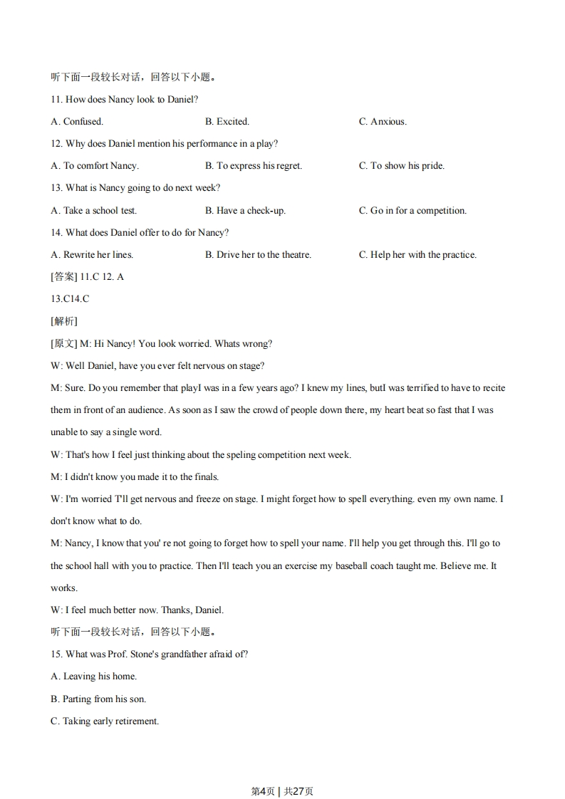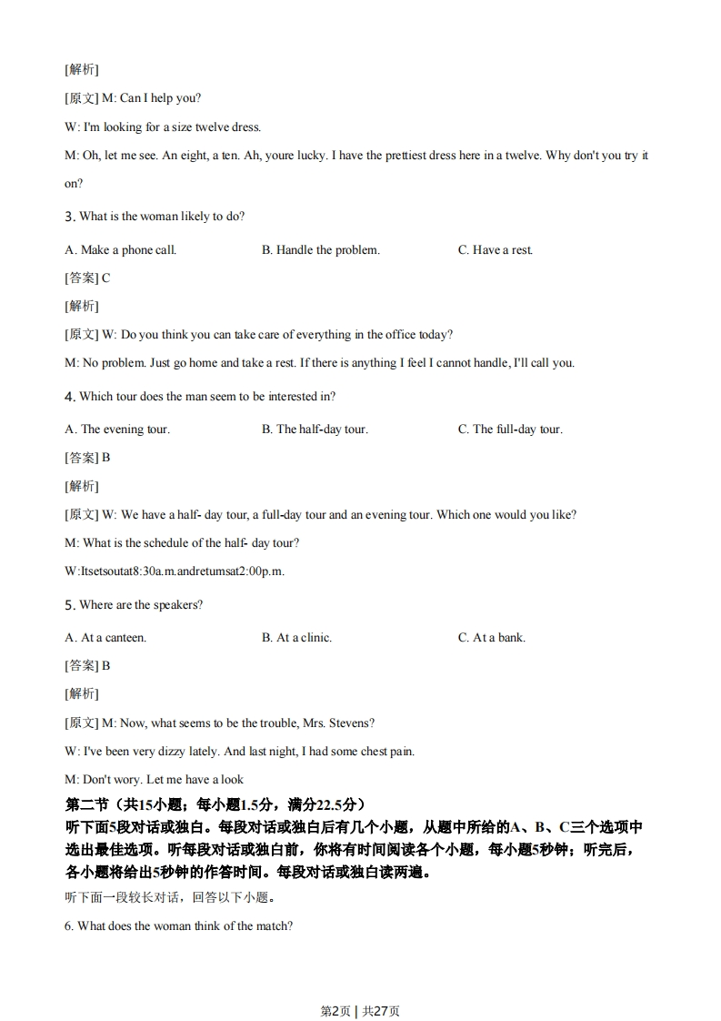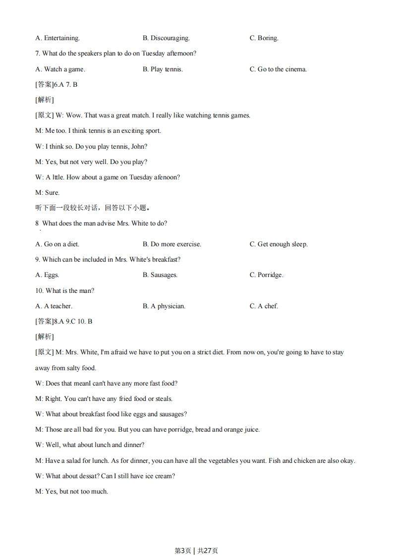 2021年普通高等学校招生全国统一考试(甲卷)英语(考区:四川、云南、贵州、广西、西藏)注意事项:1、答卷前,考生务必将自己的姓名、准考证号填写在答题卡上。2.回答选释题时,选出每小题答案后,用铅笔把答题卡上对应题目的答案标号涂黑。如需改动,用橡皮擦干净后,再选涂其他答案标号。回答非选释题时,将答案写在答题卡上,写在本试卷上无效。3.考试结束后,将本试卷和答题卡一并交回。听力部分(共两节,满分30分)做题时,先将答案标在试卷上。录音内容结束后,你将有两分钟的时间将试卷上的答案转涂到答题卡上。第一节(共5小题;每小题1.5分,满分7.5分)听下面5段对话。每段对话后有一个小题,从题中所给的A、B、C三个选项中选出最佳选项。听完每段对话后,你都有10秒钟的时间来回答有关小题和阅读下一小题。每段对话仅读一遍。例:How much is the shirt?A.£19.15.B.£9.18.C.£9.15答案是C。1.What is the man doing?A.Asking the way.B.Giving directionsC.Correcting a mistake.[答案]A[解析][M:Excuse me,I got lost.I took a bus to city hall,but I can't find the place.W:This is the conceat hall,not city hall.To go there,you should take the bus at Grand Hotel over there.2.What dress size does the woman want?A.8.B.10C.12[答案]C第1页|共27页[解析][原文]M:Can I help you?W:I'm looking for a size twelve dress.M:Oh,let me see.An eight,a ten.Ah,youre lucky.I have the prettiest dress here in a twelve.Why don't you try iton?3.What is the woman likely to do?A.Make a phone call.B.Handle the problem.C.Have a rest.[答案]C[解析][W:Do you think you can take care of everything in the office today?M:No problem.Just go home and take a rest.If there is anything I feel I cannot handle,I'll call you.4.Which tour does the man seem to be interested in?A.The evening tour.B.The half-day tour.C.The full-day tour.[答案]B[解析][W:We have a half-day tour,a full-day tour and an evening tour.Which one would you like?M:What is the schedule of the half-day tour?W:Itsetsoutat8:30a.m.andretumsat2:00p.m5.Where are the speakers?A.At a canteen.B.At a clinic.C.Ata bank.[答案]B[解析][M:Now,what seems to be the trouble,Mrs.Stevens?W:I've been very dizzy lately.And last night,I had some chest pain.M:Don't wory.Let me have a look第二节(共15小题:每小题1.5分,满分22.5分)听下面5段对话或独白。每段对话或独白后有几个小题,从题中所给的A、B、C三个选项中选出最佳选项。听每段对话或独白前,你将有时间阅读各个小题,每小题5秒钟;听完后,各小题将给出5秒钟的作答时间。每段对话或独白读两遍。听下面一段较长对话,回答以下小题。6.What does the woman think of the match?第2页|共27页A.Entertaining.B.Discouraging.C.Boring.7.What do the speakers plan to do on Tuesday aftemoon?A.Watch a game.B.Play tennis.C.Go to the cinema.[答案]6.A7.B[解析][W:Wow.That was a great match.I really like watching tennis games.M:Me too.I think tennis is an exciting sport.W:I think so.Do you play tennis,John?M:Yes,but not very well.Do you play?W:A Ittle.How about a game on Tuesday afenoon?M:Sure.听下面一段较长对话,回答以下小题。8 What does the man advise Mrs.White to do?A.Go on a diet.B.Do more exercise.C.Get enough sleep.9.Which can be included in Mrs.White's breakfast?A.Eggs.B.Sausages.C.Porridge.10.What is the man?A.A teacherB.A physician.C.A chef.[答案]8.A9.C10.B[解析][M:Mrs.White,I'm afraid we have to put you on a strict diet.From now on,you're going to have to stayaway from salty food.W:Does that meanl can't have any more fast food?M:Right.You can't have any fried food or steals.W:What about breakfast food like eggs and sausages?M:Those are all bad for you.But you can have porridge,bread and orange juice.W:Well.what about lunch and dinner?M:Have a salad for lunch.As for dinner,you can have all the vegetables y