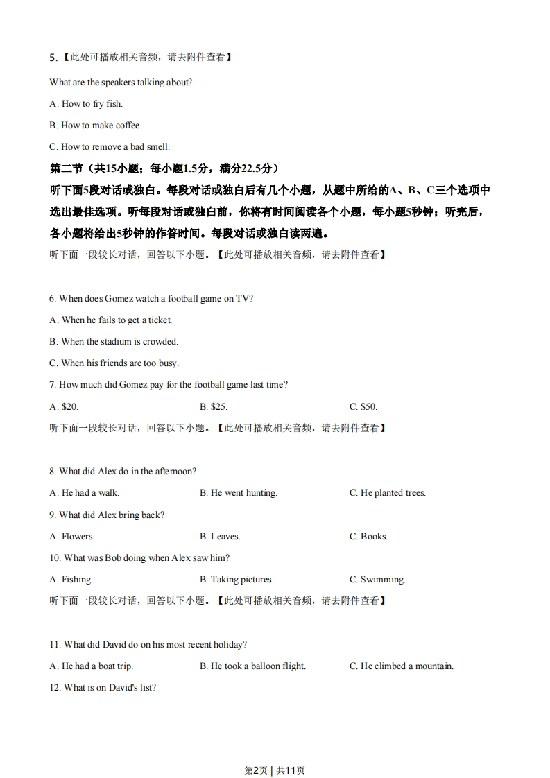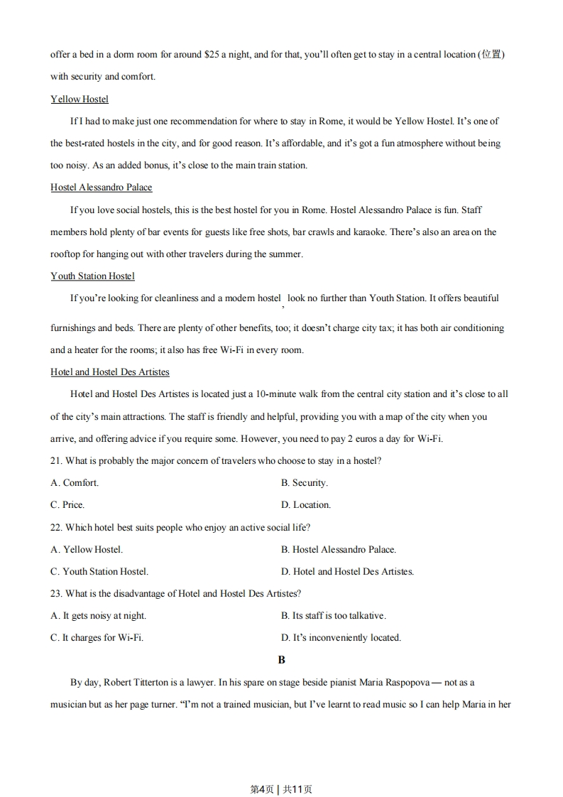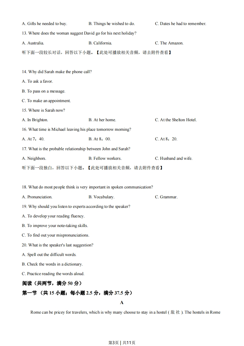 2021年普通高等学校招生全国统一考试(新高考I卷)(适用地区:山东、河北、湖北、湖南、江苏、广东、福建)英语第一部分听力(共两节,满分30分)做题时,先将答案标在试卷上。录音内容结束后,你将有两分钟的时间将试卷上的答案转涂到答题卡上。第一节(共5小题;每小题1.5分,满分7.5分)听下面5段对话。每段对话后有一个小题,从题中所给的A、B、C三个选项中选出最佳选项。听完每段对话后,你都有10秒钟的时间来回答有关小题和阅读下一小题。每段对话仅读一遍。例:How much is the shirt?A.£19.15.B.£9.18.C.£9.15.答案是C。1.【此处可播放相关音频,请去附件查看】Why did the woman go to Mallorca?A.To teach Spanish.B.To look for a job.C.To see a friend.2.【此处可播放相关音频,请去附件查看】What does the man ask the woman to do?A.Take him to hospital.B.Go to a class with him.C.Submit a report for him.3.【此处可播放相关音频,请去附件查看】Who will look after the children?A.JenniferB.SuzyC.Marie.4.【此处可播放相关音频,请去附件查看】What are the speakers going to do?A.Drive home.B.Go shopping.C.Eat out.第1页|共11页5.【此处可播放相关音频,请去附件查看】What are the speakers talking about?A.How to fry fish.B.How to make coffee.C.How to remove a bad smell.第二节(共15小题;每小题1.5分,满分22.5分)听下面5段对话或独白。每段对话或独白后有几个小题,从题中所给的A、B、C三个选项中选出最佳选项。听每段对话或独白前,你将有时间阅读各个小题,每小题5秒钟;听完后,各小题将给出5秒钟的作答时间。每段对话或独白读两遍。听下面一段较长对话,回答以下小题。【此处可播放相关音频,请去附件查看】6.When does Gomez watch a football game on TV?A.When he fails to get a ticket.B.When the stadium is crowded.C.When his friends are too busy.7.How much did Gomez pay for the football game last time?A.$20.B.$25C.$50.听下面一段较长对话,回答以下小题。【此处可播放相关音频,请去附件查看】8.What did Alex do in the aftemoon?A.He had a walk.B.He went hunting.C.He planted trees.9.What did Alex bring back?A.Flowers.B.LeavesC.Books.10.What was Bob doing when Alex saw him?A.Fishing.B.Taking pictures.C.Swimming.听下面一段较长对话,回答以下小题。【此处可播放相关音频,请去附件查看】11.What did David do on his most recent holiday?A.He had a boat trip.B.He took a balloon flight.C.He climbed a mountain12.What is on David's list?第2页|共11页A.Gifts he needed to buyB.Things he wished to do.C.Dates he had to remember.13.Where does the woman suggest David go for his next holiday?A.Australia.B.California.C.The Amazon.听下面一段较长对话,回答以下小题。【此处可播放相关音频,请去附件查看】14.Why did Sarah make the phone call?A.To ask a favorB.To pass on a messageC.To make an appointment.15.Where is Sarah now?A.In BrightonB.At her home.C.At the Shelton Hotel.16.What time is Michael leaving his place tomorrow moming?A.At7:40B.At8:00C.At8:2017.What is the probable relationship between John and Sarah?A.NeighborsB.Fellow workers.C.Husband and wife.听下面一段独白,回答以下小题。【此处可播放相关音频,请去附件查看】18.What do most people think is very important in spoken communication?A.Pronunciation.B.Vocabulary.C.Grammar.19.Why should you listen to experts according to the speaker?A.To develop your reading fluency.B.To improve your note-taking skills.C.To find out your mispronunciations.20.What is the speaker's last suggestion?A.Spell out the difficult words.B.Check the words in a dictionaryC.Practice reading the words aloud.阅读(共两节,满分50分)第一节(共15小题;每小题2.5分,满分37.5分)ARome can be pricey for travelers,which is why many choose to stay in a hostel ()The hostels in Rome第3页|共11页