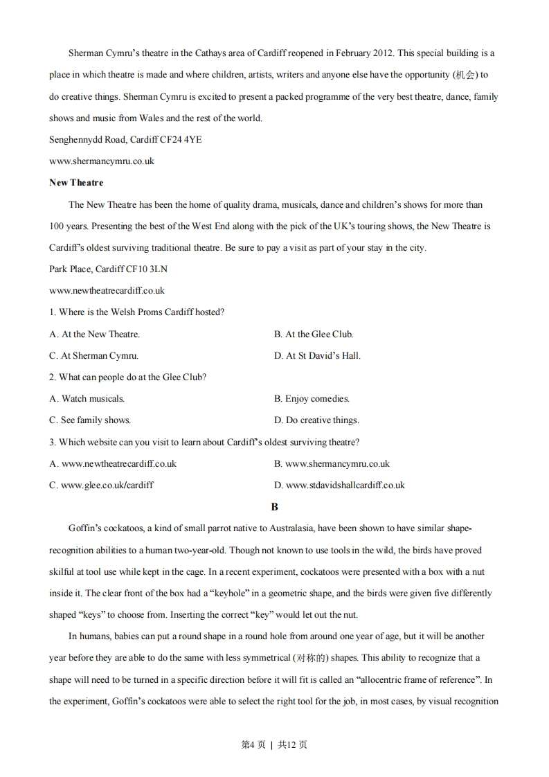 2022年普通高等学校招生全国统一考试英语注意事项:1.答卷前,考生务必将自己的姓名、准考证号填写在答题卡上。2.回答选择题时,选出每小题答案后,用铅笔把答题卡上对应题目的答案标号涂黑。如需改动,用橡皮擦干净后,再选涂其他答案标号。回答非选择题时,将答案写在答题卡上,写在本试卷上无效。3.考试结束后,将本试卷和答题卡一并交回。第一部分听力(共两节,满分30分)做题时,先将答案标在试卷上。录音内容结束后,你将有两分钟的时间将试卷上的答案转涂到答题卡上。第一节(共5小题;每小题1.5分,满分7.5分)听下面5段对话。每段对话后有一个小题,从题中所给的A、B、C三个选项中选出最佳选项。听完每段对话后,你都有10秒钟的时间来回答有关小题和阅读下一小题。每段对话仅读一遍。例:How much is the shirt?A.£19.15.B.9.18.C.9.15.答案是C。1.What does the man want to do?A.Have breakfast.B.Take a walkC.Call his office.2.What was George doing last night?A.Having a meeting.B.Flying home.C.Working on a project.3.Why does the man suggest going to the park?A.It's big.B.It's quiet.C.It's new.4.How does the woman sound?A.Annoyed.B.PleasedC.Puzzled.5.Where is the man's table?A.Near the door.B.By the window.C.In the comer.第二节(共15小题;每小题1.5分,满分22.5分)听下面5段对话或独白。每段对话或独白后有几个小题,从题中所给的A、B、C三个选项第1页|共12页中选出最佳选项。听每段对话或独白前,你将有时间阅读各个小题,每小题5秒钟;听完后,各小题将给出5秒钟的作答时间。每段对话或独白读两遍。听第6段材料,回答第6、7题。6.What are the speakers going to do tonight?A.Eat out.B.Go shopping.C.Do sports.7.What is the probable relationship between the speakers?A.Boss and secretary.B.Hostess and guestC.Husband and wife.听第7段材料,回答第8、9题。8.Why does the woman think July is the best time to move?A.Their business is slow.B.The weather is favorable.C.It's easy to hire people.9.How will they handle the moving?A.Finish it all at once.B.Have the sales section go first.C.Do one department at a time.听第8段材料,回答第10至12题。10.What did Peter learn from his grandfather?A.How to appreciate art works.B.How to deal with artists.C.How to run a museum.11.What did Peter do in Chicago?A.He studied at a college.B.He served in the army.C.He worked in a gallery.12.Whose works did Peter like best?A.Rembrandt's.B.Botticelli's.C.Rubens'.听第9段材料,回答第13至16题。13.Where does the conversation take place?A.At a library.B.In a law firm.C.On a train.14.By what time did John plan to finish his temm paper?A March.B.August.C.October.15.Why did John quit his part-time job?A.He had to catch up with his studyB.He was offered a better one.C.He got tired of it.16.What is Susan's attitude to John's problem?A.Carefree.B.Understanding.C.Forgiving第2页|共12页听第10段材料,回答第17至20题。17.What did the speaker do before the year 2012?A.A fitness coach.B.A chess player.C.A marathon runner.18.Why was the 2016 Olympics important for the speaker?A.He was motivated by Bolt.B.He broke a world record.C.He won fifth place.19.Which is the hardest for the speaker?A.Getting over an injury.B.Doing strength training.C.Representing Botswana.20.What is the speaker mainly talking about?A.His plan to go for the gold.B.His experience on the track.C.His love for his home country第二部分阅读理解(共两节,满分40分)第一节(共15小题:每小题2分,满分30分)阅读下列短文,从每题所给的A、B、C和D四个选项中,选出最佳选项。ATheatres and EntertainmentSt David's HallSt David's Hall is the award winning National Concert Hall of Wales standing at the very heart of Cardiff'sentertainment centre.With an impressive 2,000-seat concert hall,St David's Hall is home to the annual WelshProms Cardiff.It presents live entertainment,including