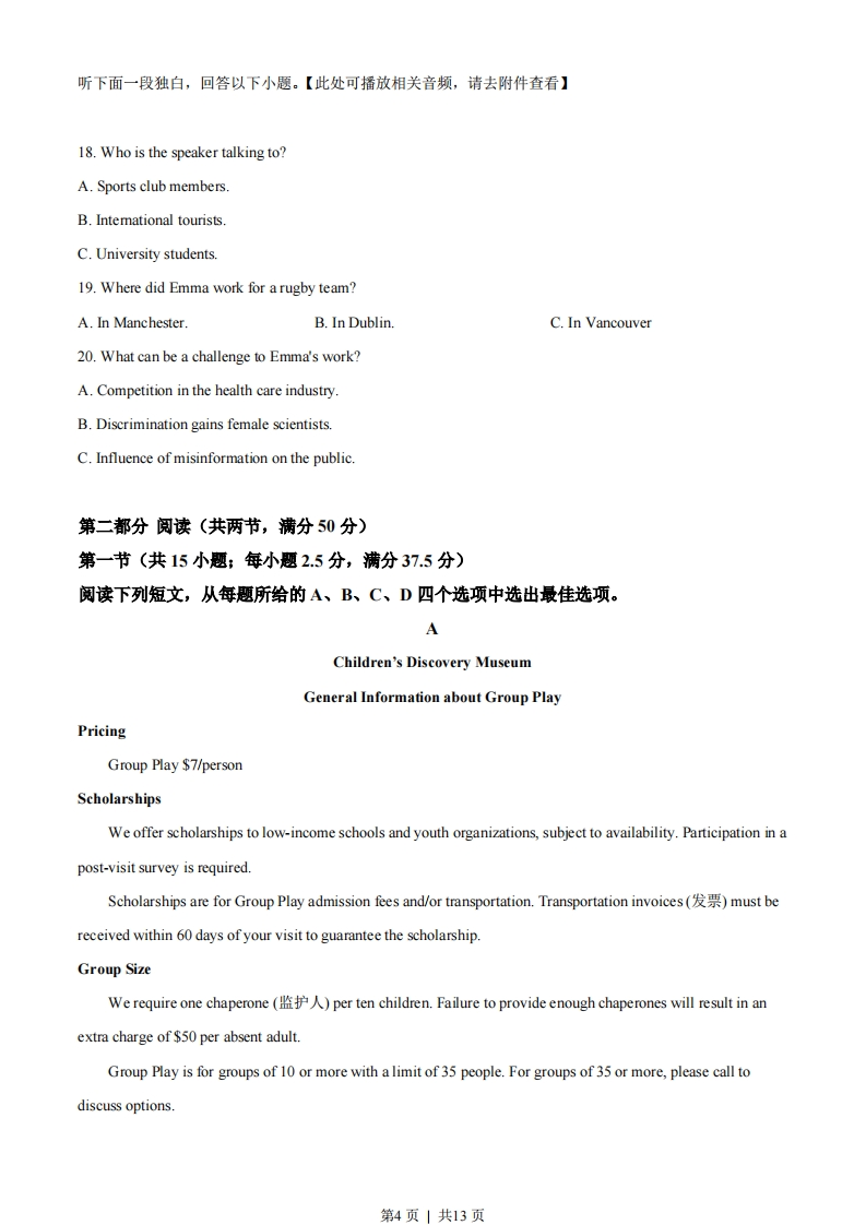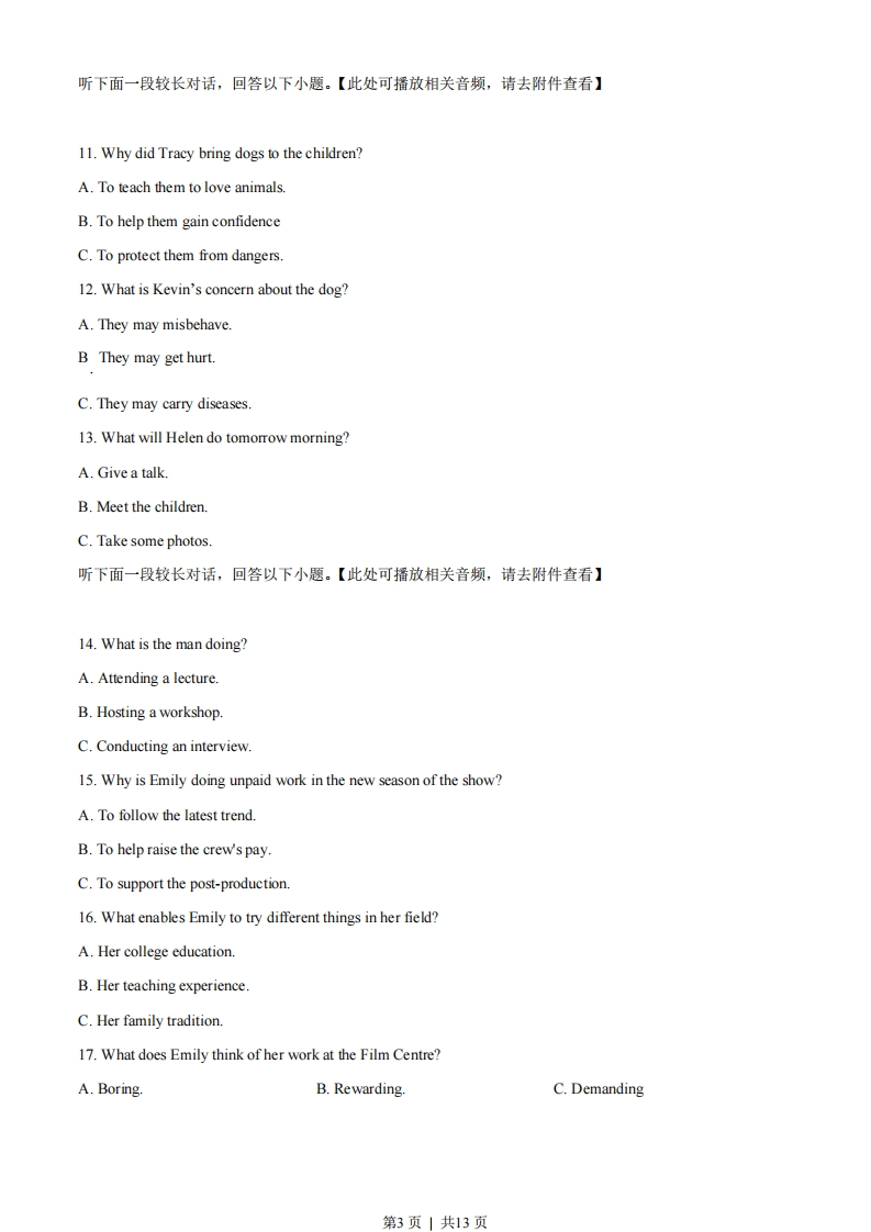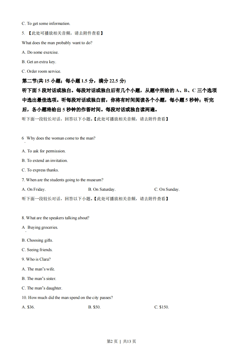 2022年普通高等学校招生全国统一考试(新高考全国Ⅱ卷)英语第一部分听力(共两节,满分30分)做题时,先将答案标在试卷上。录音内容结束后,你将有两分钟的时间将试卷上的答案转涂到答题卡上。做题时,先将答案标在试卷上。录音内容结束后,你将有两分钟的时间将试卷上的答案转涂到答题卡上。第一节(共5小题;每小题1.5分,满分7.5分)听下面5段对话。每段对话后有一个小题,从题中所给的A、B、C三个选项中选出最佳选项。听完每段对话后,你都有10秒钟的时间来回答有关小题和阅读下一小题。每段对话仅读一遍。例:How much is the shirt?A.£19.15B.£9.18.C.£9.15.答案是C。1.【此处可播放相关音频,请去附件查看】What will the speakers do next?A.Check the map.B.Leave the restaurant.C.Park the car.2.【此处可播放相关音频,请去附件查看】Where are the speakers?A.At a bus stop.B.At home.C.At the airport.3.【此处可播放相关音频,请去附件查看】What did the speakers do last week?A.They had a celebration dinnerB.They went to see a newborn baby.C.They sent a mail to their neighbors.4.【此处可播放相关音频,请去附件查看】Why does the man make the phone call?A.To cancel a weekend tripB.To make an appointment.第1页」共13页C.To get some information5.【此处可播放相关音频,请去附件查看】What does the man probably want to do?A.Do some exercise.B.Get an extra key.C.Order room service.第二节(共15小题;每小题1.5分,满分22.5分)听下面5段对话或独白。每段对话或独白后有几个小题,从题中所给的A、B、C三个选项中选出最佳选项。听每段对话或独白前,你将有时间阅读各个小题,每小题5秒钟;听完后,各小题将给出5秒钟的作答时间。每段对话或独自读两遍。听下面一段较长对话,回答以下小题。【此处可播放相关音频,请去附件查看】6 Why does the woman come to the man?A.To ask for permission.B.To extend an invitation.C.To express thanks.7.When are the students going to the museum?A.On Friday.B.On SaturdayC.On Sunday.听下面一段较长对话,回答以下小题。【此处可播放相关音频,请去附件查看】8.What are the speakers talking about?A Buying groceries.B.Choosing gifts.C.Seeing friends.9.Who is Clara?A.The man's wife.B.The man's sisterC.The man's daughter.10.How much did the man spend on the city passes?A.$36.B.$50C.$150.第2页」共13页听下面一段较长对话,回答以下小题。【此处可播放相关音频,请去附件查看】11.Why did Tracy bring dogs to the children?A.To teach them to love animals.B.To help them gain confidenceC.To protect them from dangers.12.What is Kevin's concern about the dog?A.They may misbehaveB They may get hurt.C.They may carry diseases.13.What will Helen do tomorrow morning?A.Give a talk.B.Meet the children.C.Take some photos.听下面一段较长对话,回答以下小题。【此处可播放相关音频,请去附件查看】14.What is the man doing?A.Attending a lecture.B.Hosting a workshop.C.Conducting an interview15.Why is Emily doing unpaid work in the new season of the show?A.To follow the latest trend.B.To help raise the crew's pay.C.To support the post-production.16.What enables Emily to try different things in her field?A.Her college education.B.Her teaching experience.C.Her family tradition.17.What does Emily think of her work at the Film Centre?A.Boring.B.Rewarding.C.Demanding第3页」共13页