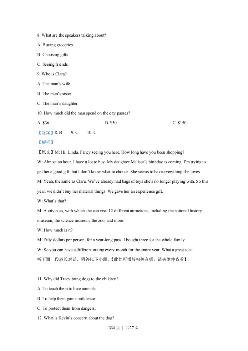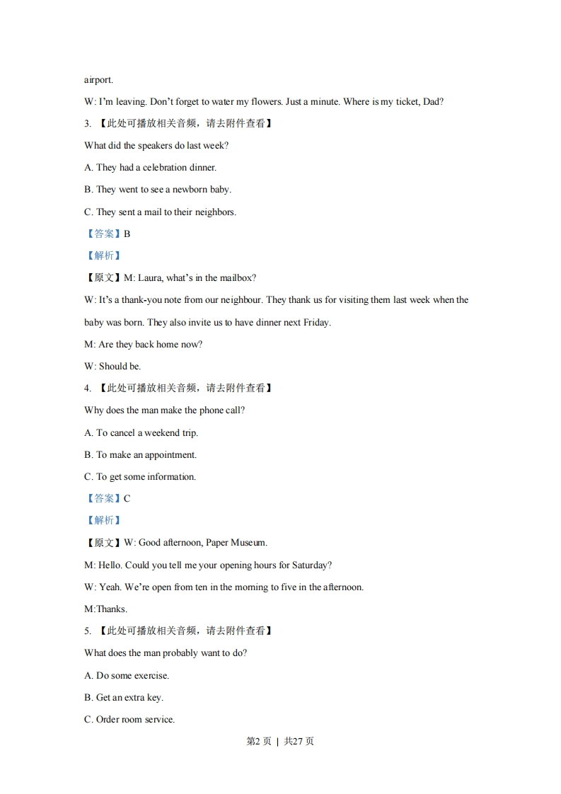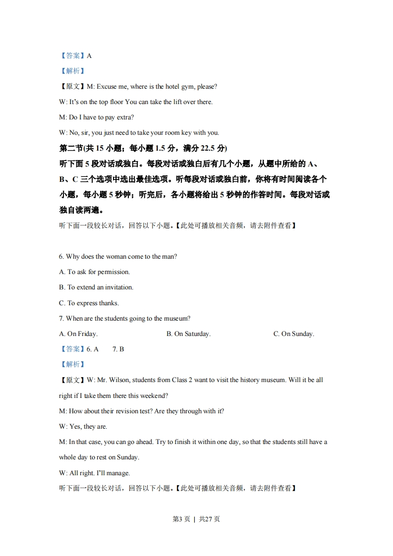 2022年普通高等学校招生全国统一考试(新高考全国Ⅱ卷)英语第一部分听力(共两节,满分30分)做题时,先将答案标在试卷上。录音内容结束后,你将有两分钟的时间将试卷上的答案转涂到答题卡上。第一节(共5小题:每小题1.5分,满分7.5分)听下面5段对话。每段对话后有一个小题,从题中所给的A、B、C三个选项中选出最佳选项。听完每段对话后,你都有10秒钟的时间来回答有关小题和阅读下一小题。每段对话仅读一遍。例:How much is the shirt?A.£19.15.B.£9.18.C.£9.15.答案是C。1.【此处可播放相关音频,请去附件查看】What will the speakers do next?A.Check the map.B.Leave the restaurant.C.Park the car.【答案】C【解析】【原文】M:We have to find a parking space..Let's drive around the block one more time.Didyou say the restaurant has no off-street parking at all?W:None.I checked it.Look,there is a space!2.【此处可播放相关音频,请去附件查看】Where are the speakers?A.At a bus stop.B.At homeC.At the airport.【答案】B【解析】【原文】M:You have to go now,Judy,or you'll miss your flight.t's an hour's drive to the第1页|共27页airport.W:I'm leaving.Don't forget to water my flowers.Just a minute.Where is my ticket,Dad?3.【此处可播放相关音频,请去附件查看】What did the speakers do last week?A.They had a celebration dinner.B.They went to see a newborn baby.C.They sent a mail to their neighbors.【答案】B【解析】【原文】M:Laura,.what's in the mailbox'?W:It's a thank-you note from our neighbour.They thank us for visiting them last week when thebaby was born.They also invite us to have dinner next Friday.M:Are they back home now?W:Should be4.【此处可播放相关音频,请去附件查看】Why does the man make the phone call?A.To cancel a weekend trip.B.To make an appointment.C.To get some information.【答案】C【解析】【原文】W:Good afternoon,Paper Museum.M:Hello.Could you tell me your opening hours for Saturday?W:Yeah.We're open from ten in the moming to five in the afternoon.M:Thanks.5.【此处可播放相关音频,请去附件查看】What does the man probably want to do?A.Do some exercise.B.Get an extra key.C.Order room service.第2页|共27页【答案】A【解析】【原文】M:Excuse me,.where is the hotel gym,please?W:It's on the top floor You can take the lift over there.M:Do I have to pay extra?W:No,sir,you just need to take your room key with you.第二节(共15小题;每小题1.5分,满分22.5分)听下面5段对话或独白。每段对话或独白后有几个小题,从题中所给的A、B、C三个选项中选出最佳选项。听每段对话或独白前,你将有时间阅读各个小题,每小题5秒钟;听完后,各小题将给出5秒钟的作答时间。每段对话或独自读两遍。听下面一段较长对话,回答以下小题。【此处可播放相关音频,请去附件查看】6.Why does the woman come to the man?A.To ask for permission.B.To extend an invitation.C.To express thanks.7.When are the students going to the museum?A.On Friday.B.On Saturday.C.On Sunday.【答案】6.A7.B【解析】【原文】W:Mr.Wilson,students from Class2 want to visit the history museum.Will it be allright if I take them there this weekend?M:How about their revision test?Are they through with it?W:Yes,they are.M:In that case,you can go ahead.Try to finish it within one day,so that the students still have awhole day to rest on SundayW:All right.I'll manage.听下面一段较长对话,回答以下小题。【此处可播放相关音频,请去附件查看】第3页|共27页