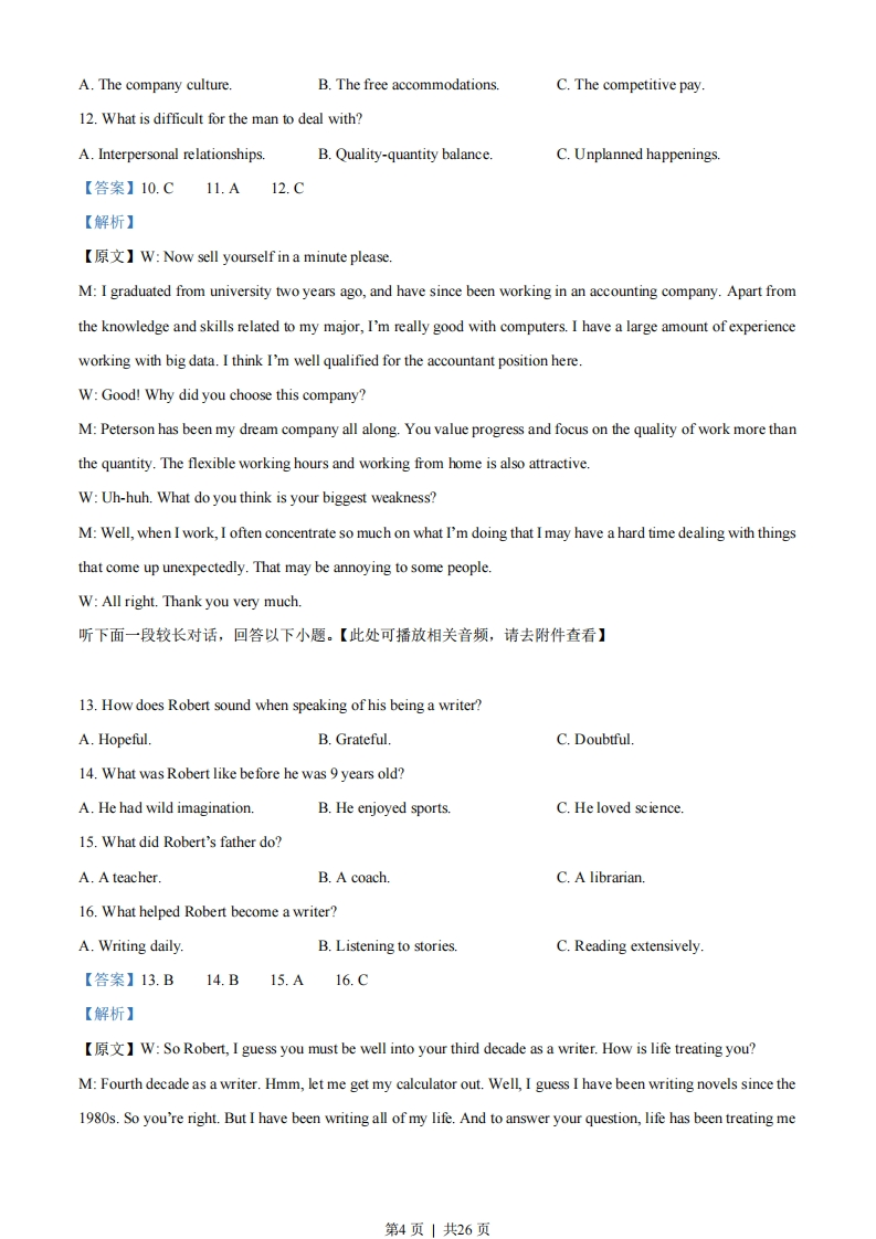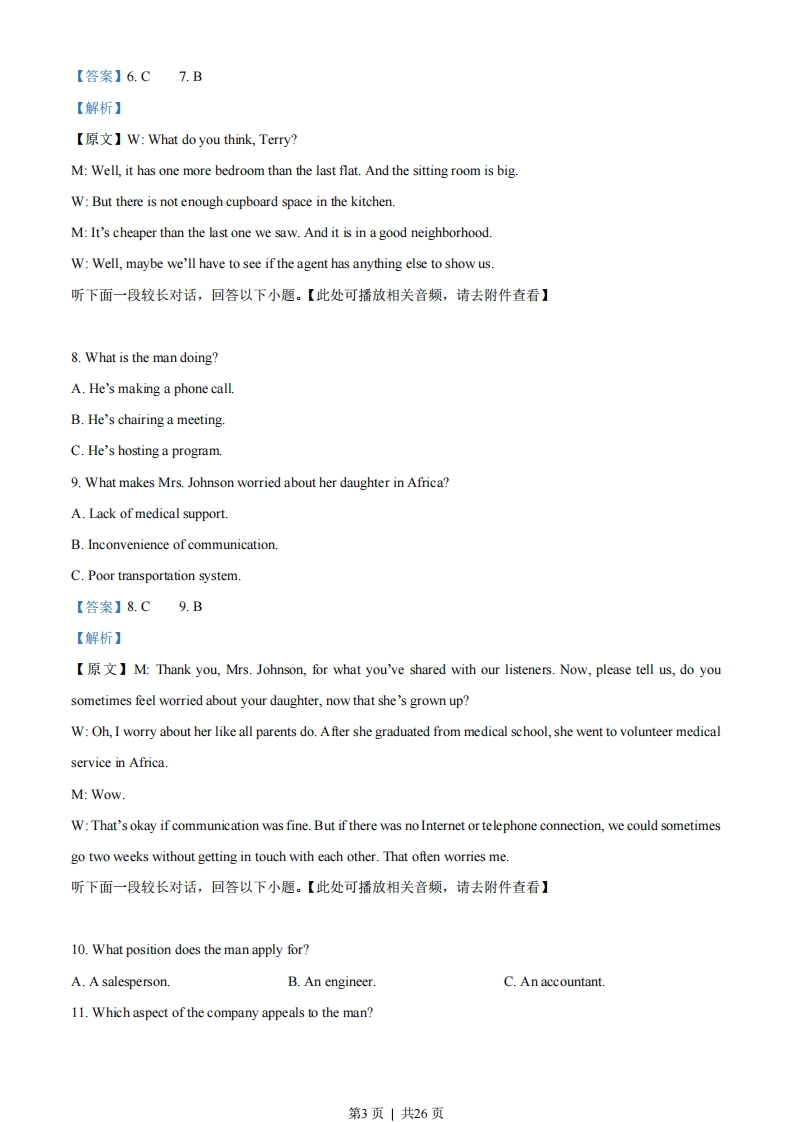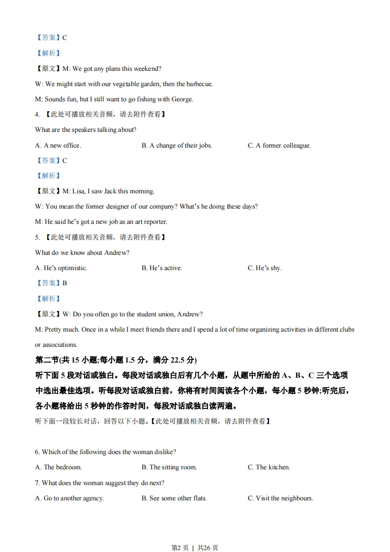 2023年普通高等学校招生全国统一考试(全国甲卷)英语学科第一部分听力(共两节,满分30分)做题时,先将答案标在试卷上。录音内容结束后,你将有两分钟的时间将试卷上的答案转涂到答题卡上。第一节(共5小题;每小题1.5分,满分1.5分)听下面5段对话。每段对话后有一个小题,从题中所给的A、B、C三个选项中选出最佳选项。听完每段对话后,你都有10秒钟的时间来回答有关小题和阅读下一小题。每段对话仅读一遍。例:How much is the shirt?A.£19.15.B.9.18.C.9.15.答案是C。1.【此处可播放相关音频,请去附件查看】Where does the conversation probably take place?A.In the book store.B.In the register office.C.In the dorm building.【答案】B【解析】【原文】W:Could you please tell me how I can get to the student domm building?M:Sure.Turn left when you walk out of this register office,pass the bookstore and you'll see it.2.【此处可播放相关音频,请去附件查看】What is the weather like now?A.Sunny.B.Cloudy.C.Rainy.【答案】A【解析】【原文】M:We couldn't ask for a better day,could we,Barbara?W:I know,Steve.There isn't a cloud in the sky.I love this time of year.M:Me,too.The flowers are beautiful but calling for rain though.3.【此处可播放相关音频,请去附件查看】What does the man want to do on the weekend?A.Do some gardeningB.Have a barbecueC.Go fishing.第1页」共26页【答案】C【解析】【原文】M:We got any plans this weekend?W:We might start with our vegetable garden,then the barbecue.M:Sounds fun,but I still want to go fishing with George.4.【此处可播放相关音频,请去附件查看】What are the speakers talking about?A.A new officeB.A change of their jobs.C.A former colleague【答案】C【解析】【原文】M:Lisa,I saw Jack this moming,W:You mean the former designer of our company?What's he doing these days?M:He said he's got a new job as an art reporter.5.【此处可播放相关音频,请去附件查看】What do we know about Andrew?A.He's optimistic.B.He's active.C.He's shy.【答案】B【解析】【原文】W:Do you often go to the student union,Andrew?M:Pretty much.Once in a while I meet friends there and I spend a lot of time organizing activities in different clubsor associations.第二节(共15小题;每小题1.5分,满分22.5分)听下面5段对话或独白。每段对话或独白后有几个小题,从题中所给的A、B、C三个选项中选出最佳选项。听每段对话或独白前,你将有时间阅读各个小题,每小题5秒钟;听完后,各小题将给出5秒钟的作答时间,每段对话或独白读两遍。听下面一段较长对话,回答以下小题。【此处可播放相关音频,请去附件查看】6.Which of the following does the woman dislike?A.The bedroom.B.The sitting room.C.The kitchen.7.What does the woman suggest they do next?A.Go to another agency.B.See some other flats.C.Visit the neighbours.第2页」共26页【答案】6.C7.B【解析】【原文】W:What do you think,.Terry?M:Well,it has one more bedroom than the last flat.And the sitting room is big.W:But there is not enough cupboard space in the kitchen.M:It's cheaper than the last one we saw.And it is in a good neighborhood.W:Well,maybe we'll have to see if the agent has anything else to show us听下面一段较长对话,回答以下小题。【此处可播放相关音频,请去附件查看】8.What is the man doing?A.He's making a phone call.B.He's chairing a meeting.C.He's hosting a program.9.What makes Mrs.Johnson worried about her daughter in Africa?A.Lack of medical support.B.Inconvenience of communication.C.Poor transportation system.【答案】8.C9.B【解析】M:Thank you,Mrs.Johnson,for what you've shared with our listeners.Now,please tell us,do yousometimes feel worried about your daughter,now that she's grown up?W:Oh,I worry about her like all parents do.After she graduated from medical school,she went to volunteer medicalservice in Africa.M:Wow.W:That's oka