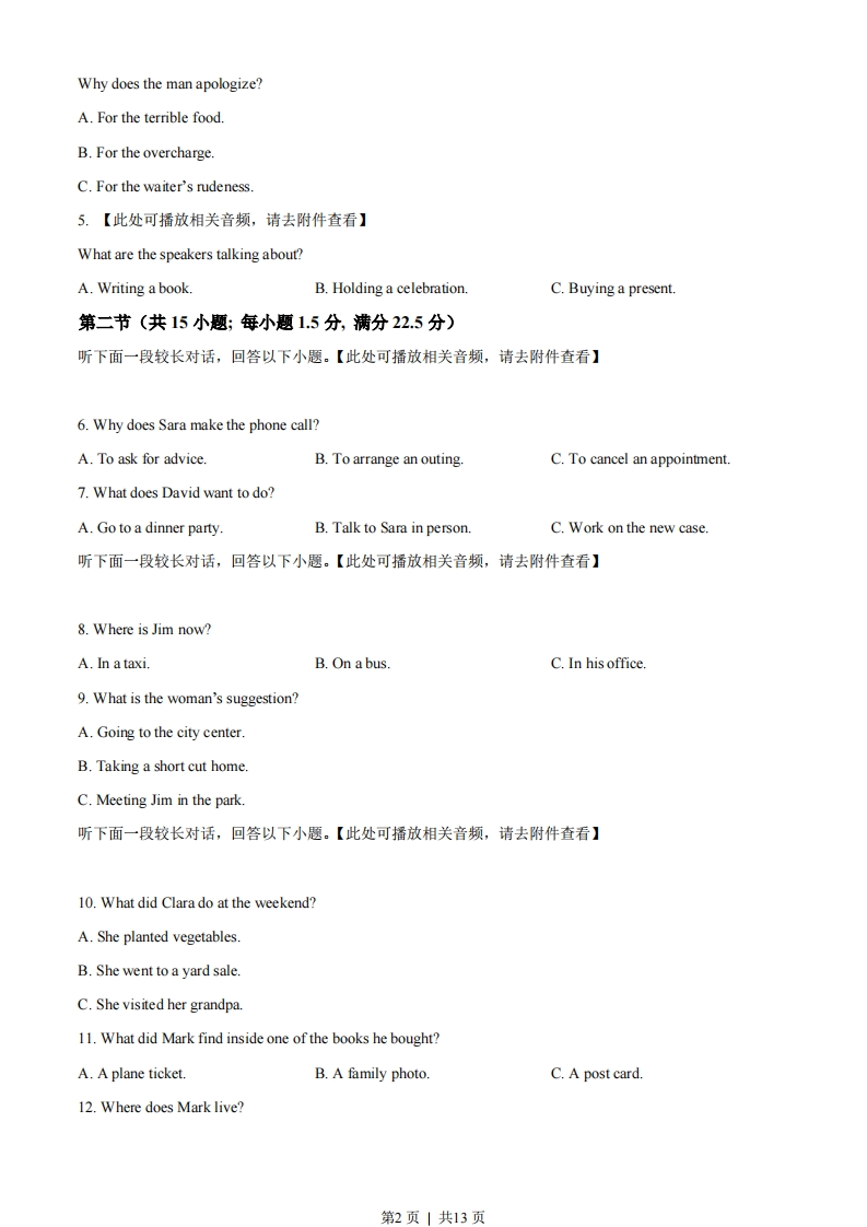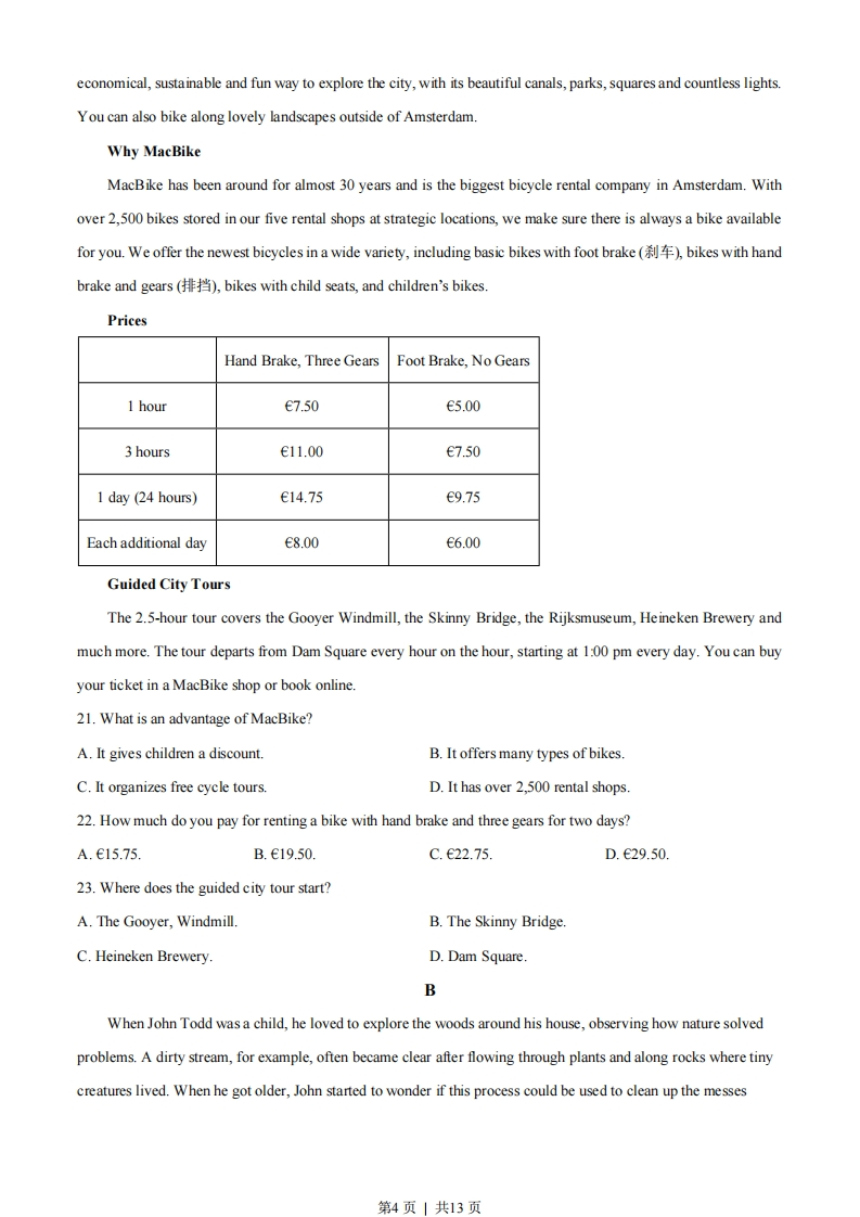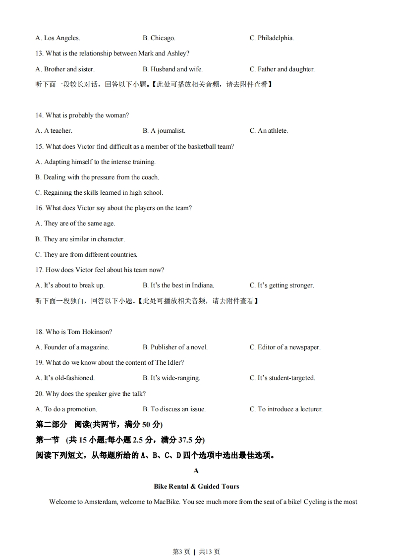 2023年普通高等学校招生全国统一考试(新课标全国I卷)英语学科本试卷共12页。考试结束后,将本试卷和答题卡一并交回。注意事项:1.答题前,考生先将自己的姓名、准考证号码填写清楚,将条形码准确粘贴在考生信息条形码粘贴区。2.选择题必须使用2B铅笔填涂;非选择题必须使用0.5毫米黑色字迹的签字笔书写,字体工整、笔迹清楚。3.请按照题号顺序在答题卡各题目的答题区域内作答,超出答题区域书写的答案无效:在草稿纸、试卷上答题无效。4.作图可先使用铅笔画出,确定后必须用黑色字迹的签字笔描黑。5.保持卡面清洁,不要折叠,不要弄破、弄皱,不准使用涂改液、修正带、刮纸刀。第一部分听力(1-20小题)在笔试结束后进行。(共5小题:每小题1.5分,满分7.5分)听下面5段对话。每段对话后有一个小题,从题中所给的A、B、C三个选项中选出最佳选项。听完每段对话后,你都有10秒钟的时间来回答有关小题和阅读下一小题。每段对话仅读一遍。例:How much is the shirt?A.£19.15B.f9.18C.9.15.答案是C。1.【此处可播放相关音频,请去附件查看】What will Jack probably do this weekend?A.Go camping.B.Visit a friendC.Watch a film.2.【此处可播放相关音频,请去附件查看】What does the woman ask the man to do?A.Take care of her bags.B Pack the food for her.C.Check the train schedule3.【此处可播放相关音频,请去附件查看】When will the man see Bob?A.This FridayB.This SaturdayC.Next Monday4.【此处可播放相关音频,请去附件查看】第1页」共13页Why does the man apologize?A.For the terrible food.B.For the overcharge.C.For the waiter's rudeness.5.【此处可播放相关音频,请去附件查看】What are the speakers talking about?A.Writing a book.B.Holding a celebration.C.Buying a present.第二节(共15小题;每小题1.5分,满分22.5分)听下面一段较长对话,回答以下小题。【此处可播放相关音频,请去附件查看】6.Why does Sara make the phone call?A.To ask for advice.B.To arrange an outing.C.To cancel an appointment.7.What does David want to do?A.Go to a dinner partyB.Talk to Sara in personC.Work on the new case听下面一段较长对话,回答以下小题。【此处可播放相关音频,请去附件查看】8.Where is Jim now?A.In a taxi.B.On a bus.C.In his office.9.What is the woman's suggestion?A.Going to the city center.B.Taking a short cut home.C.Meeting Jim in the park.听下面一段较长对话,回答以下小题。【此处可播放相关音频,请去附件查看】10.What did Clara do at the weekend?A.She planted vegetablesB.She went to a yard sale.C.She visited her grandpa.11.What did Mark find inside one of the books he bought?A.A plane ticket.B.A family photo.C.A post card.12.Where does Mark live?第2页」共13页A.Los Angeles.B.Chicago.C.Philadelphia.13.What is the relationship between Mark and Ashley?A.Brother and sister.B.Husband and wife.C.Father and daughter.听下面一段较长对话,回答以下小题。【此处可播放相关音频,请去附件查看】14.What is probably the woman?A.A teacherB.A joumalistC.An athlete15.What does Victor find difficult as a member of the basketball team?A.Adapting himself to the intense training.B.Dealing with the pressure from the coach.C.Regaining the skills leamed in high school.16.What does Victor say about the players on the team?A.They are of the same age.B.They are similar in character.C.They are from different countries.17.How does Victor feel about his team now?A.It's about to break upB.It's the best in IndianaC.It's getting stronger.听下面一段独白,回答以下小题。【此处可播放相关音频,请去附件查看】18.Who is Tom Hokinson?A.Founder of a magazine.B.Publisher of a novel.C.Editor of a newspaper.19.What do we know about the content of The Idler?A.It's old-fashioned.B.It's wide-ranging.C.It's student-targeted.20.Why does the speaker give the talk?A.To do a promotion.B.To discuss an issue.C.To introduce a lecturer.第二部分阅读(共两节,满分50分)第一节(共15小题:每小题2.5分,满分37.5分)阅读下列短文,从每题所给的A、B、C、D四个选项中选出最佳选项。ABike Rental Guided ToursWelcome to Amsterdam,welcome to Mac Bike.You see much