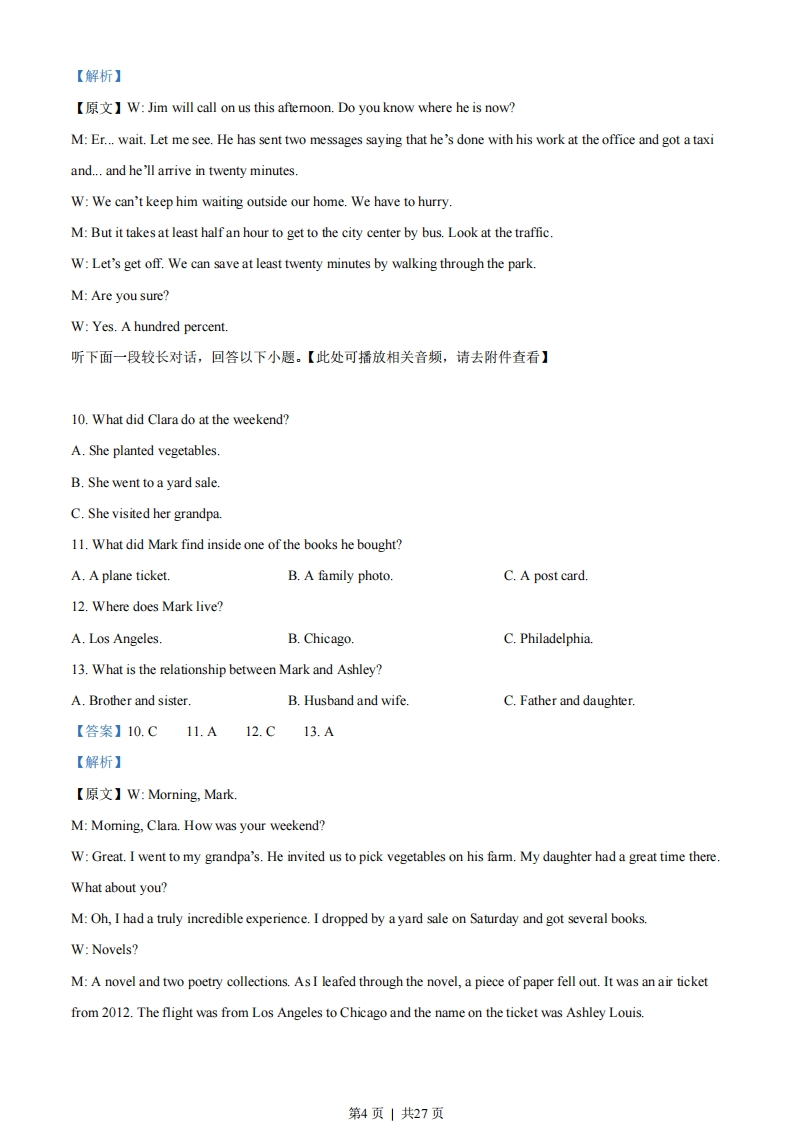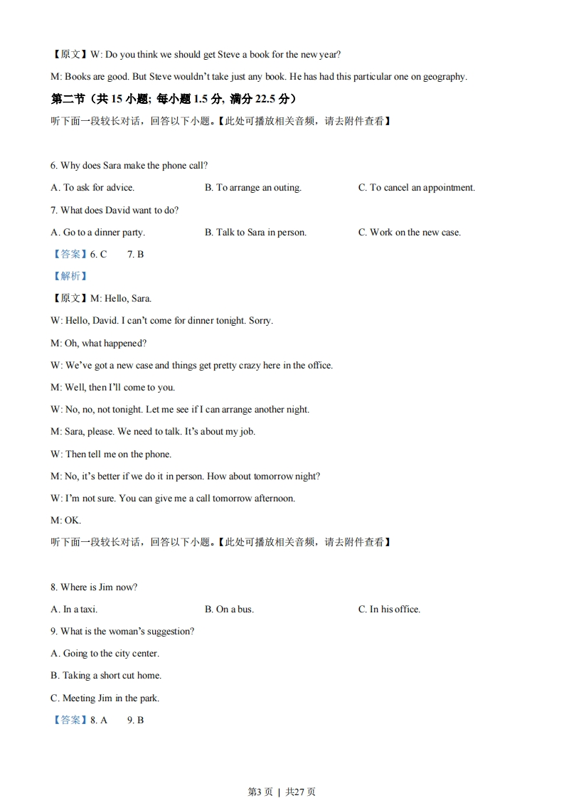 2023年普通高等学校招生全国统一考试(新课标全国I卷)英语学科本试卷共12页。考试结束后,将本试卷和答题卡一并交回。注意事项:1.答题前,考生先将自己的姓名、准考证号码填写清楚,将条形码准确粘贴在考生信息条形码粘贴区。2.选择题必须使用2B铅笔填涂;非选择题必须使用0.5毫米黑色字迹的签字笔书写,字体工整、笔迹清楚。3.请按照题号顺序在答题卡各题目的答题区域内作答,超出答题区域书写的答案无效:在草稿纸、试卷上答题无效。4.作图可先使用铅笔画出,确定后必须用黑色字迹的签字笔描黑。5.保持卡面清洁,不要折叠,不要弄破、弄皱,不准使用涂改液、修正带、刮纸刀。第一部分听力(1-20小题)在笔试结束后进行。(共5小题:每小题1.5分,满分7.5分)听下面5段对话。每段对话后有一个小题,从题中所给的A、B、C三个选项中选出最佳选项。听完每段对话后,你都有10秒钟的时间来回答有关小题和阅读下一小题。每段对话仅读一遍。例:How much is the shirt?A.£19.15B.f9.18C.9.15.答案是C。1.【此处可播放相关音频,请去附件查看】What will Jack probably do this weekend?A.Go camping.B.Visit a friend.C.Watch a film.【答案】C【解析】【原文】W:Jack,are you going camping with your friends this weekend?M:It depends.If it's sunny,we'll go.W:The weatherman says it's going to rain.M:In that case,we'll go to the cinema instead.2.【此处可播放相关音频,请去附件查看】What does the woman ask the man to do?A.Take care of her bags.第1页」共27页B.Pack the food for her.C.Check the train schedule.【答案】A【解析】【原文】W:Excuse me,could you mind my bags for a moment?I want to buy some food at the conveniencestoreM:No problem.But be quick.It was announced that my train would arrive in 10 minutes.3.【此处可播放相关音频,请去附件查看】When will the man see Bob?A.This Friday.B.This Saturday.C.Next Monday.【答案】B【解析】【原文】W:Mark came out of hospital last Friday.Have you got a chance to visit him?M:I plan to see him this SaturdayW:Aren't you going to the conference then?M:No.It has been rescheduled for next Monday4.【此处可播放相关音频,请去附件查看】Why does the man apologize?A.For the terrible food.B.For the overcharge.C.For the waiter's rudeness.【答案】B【解析】M:Sorry,Miss.We made a terrible mistake adding up the bill.Here is the ten dollars we have to return toyou.W:Oh,I didn't notice that.It's OK.Don't blame the waiter.He's been really nice.5.【此处可播放相关音频,请去附件查看】What are the speakers talking about?A.Writing a book.B.Holding a celebration.C.Buying a present.【答案】C【解析】第2页」共27页【原文】W:Do you think we should get Steve a book for the new year?M:Books are good.But Steve wouldn't take just any book.He has had this particular one on geography.第二节(共15小题;每小题1.5分,满分22.5分)听下面一段较长对话,回答以下小题。【此处可播放相关音频,请去附件查看】6.Why does Sara make the phone call?A.To ask for adviceB.To arrange an outing.C.To cancel an appointment7.What does David want to do?A.Go to a dinner party.B.Talk to Sara in person.C.Work on the new case.【答案】6.C7.B【解析】【原文】M:Helo,SaraW:Hello,David.I can't come for dinner tonight.Sorry.M:Oh,what happened?W:We've got a new case and things get pretty crazy here in the office.M:Well,then I'll come to you.W:No,no,not tonight.Let me see if I can arrange another night.M:Sara,please.We need to talk.It's about my job.W:Then tell me on the phone.M:No,it's better if we do it in person.How about tomorrow night?W:I'm not sure.You can give me a call tomorrow afternoon.M:OK听下面一段较长对话,回答以下小题。【此处可播放相关音频,请去附件查看】8.Where is Jim now?A.In a taxi.B.On a bus.C.In his office.9.What is the woman's suggestion?A.Going to the city center.B.Taking a short cut homeC.Meeting Jim in the park.【答案】8.A9.B第3页」共27页