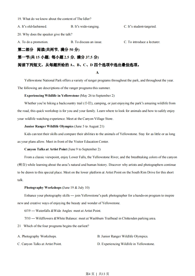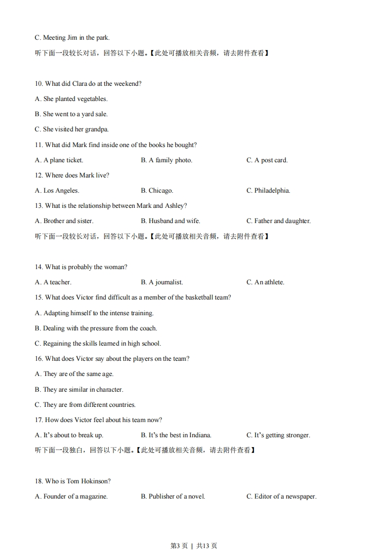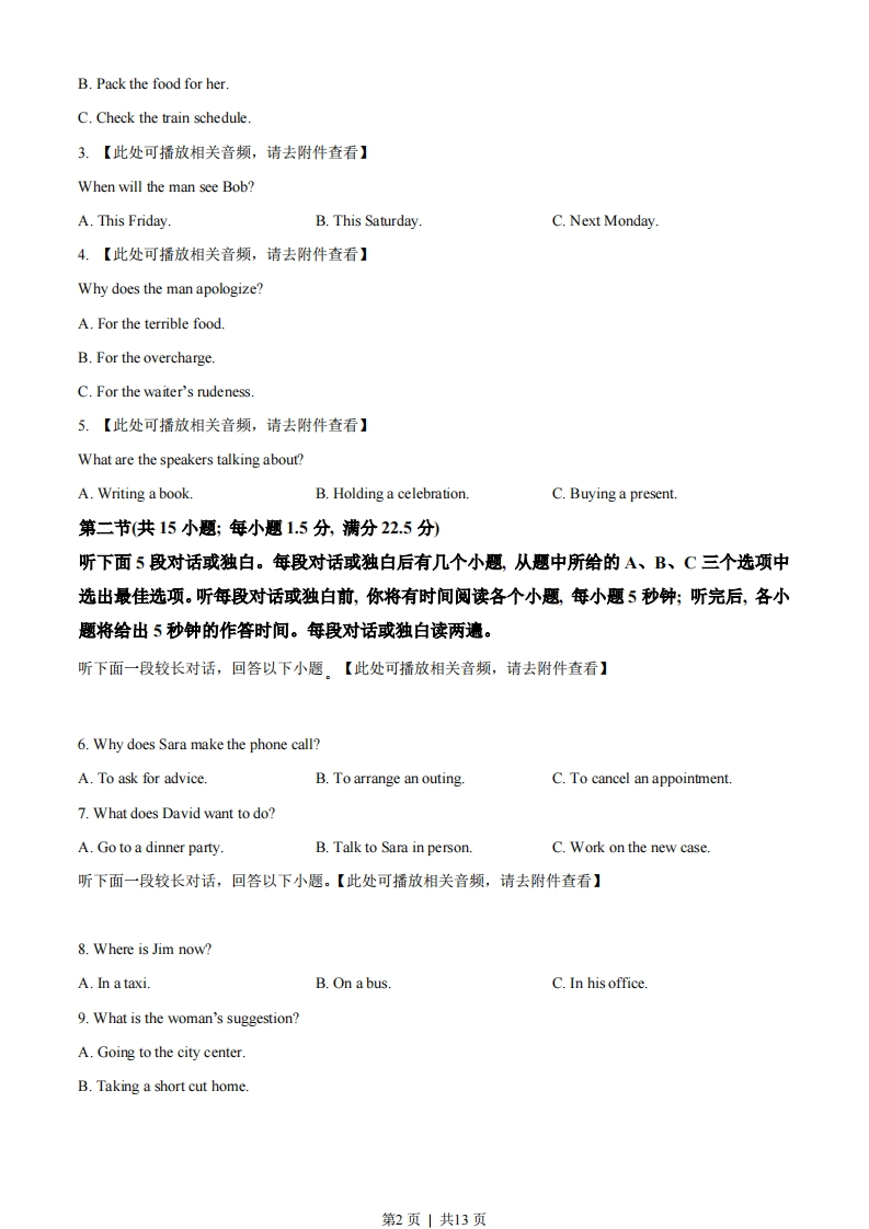 2023年普通高等学校招生全国统一考试(新课标全国Ⅱ卷)英语学科本试卷共12页。考试结束后,将本试卷和答题卡一并交回。注意事项:1.答题前,考生先将自己的姓名、准考证号码填写清楚,将条形码准确粘贴在考生信息条形码粘贴区。2.选择题必须使用2B铅笔填涂;非选择题必须使用0.5毫米黑色字迹的签字笔书写,字体工整、笔迹清楚。3.请按照题号顺序在答题卡各题目的答题区域内作答,超出答题区域书写的答案无效:在草稿纸、试卷上答题无效。4.作图可先使用铅笔画出,确定后必须用黑色字迹的签字笔描黑。5.保持卡面清洁,不要折叠,不要弄破、弄皱,不准使用涂改液、修正带、刮纸刀。英语听力注意事项:英语听力共两节,20小题,每小题1.5分,满分30分。第一部分听力(共两节,满分30分)做题时,先将答案标在试卷上。录音内容结束后,你将有两分钟的时间将试卷上的答案转涂到答题卡上。第一节(共5小题;每小题1.5分,满分75分)听下面5段对话。每段对话后有一个小题,从题中所给的A、B、C三个选项中选出最佳选项。听完每段对话后,你都有10秒钟的时间来回答有关小题和阅读下一小题。每段对话仅读一遍。例:How much is the shirt?A.£19.15.B.9.18.C.9.15.答案是C。1.【此处可播放相关音频,请去附件查看】What will Jack probably do this weekend?A.Go camping.B.Visit a friend.C.Watch a film.2.【此处可播放相关音频,请去附件查看】What does the woman ask the man to do?A.Take care of her bags第1页」共13页B.Pack the food for herC.Check the train schedule.3.【此处可播放相关音频,请去附件查看】When will the man see Bob?A.This Friday.B.This Saturday.C.Next Monday4.【此处可播放相关音频,请去附件查看】Why does the man apologize?A.For the terrible foodB.For the overcharge.C.For the waiter's rudeness.5.【此处可播放相关音频,请去附件查看】What are the speakers talking about?A.Writing a bookB.Holding a celebration.C.Buying a present.第二节(共15小题;每小题1.5分,满分22.5分)听下面5段对话或独白。每段对话或独白后有几个小题,从题中所给的A、B、C三个选项中选出最佳选项。听每段对话或独白前,你将有时间阅读各个小题,每小题5秒钟;听完后,各小题将给出5秒钟的作答时间。每段对话或独白读两遗。听下面一段较长对话,回答以下小题【此处可播放相关音频,请去附件查看】6.Why does Sara make the phone call?A.To ask for advice.B.To arrange an outingC.To cancel an appointment.7.What does David want to do?A.Go to a dinner party.B.Talk to Sara in person.C.Work on the new case.听下面一段较长对话,回答以下小题。【此处可播放相关音频,请去附件查看】8.Where is Jim now?A.In a taxi.B.On a bus.C.In his office.9.What is the woman's suggestion?A.Going to the city center.B.Taking a short cut home.第2页」共13页C.Meeting Jim in the park.听下面一段较长对话,回答以下小题。【此处可播放相关音频,请去附件查看】10.What did Clara do at the weekend?A.She planted vegetables.B.She went to a yard sale.C.She visited her grandpa.11.What did Mark find inside one of the books he bought?A.A plane ticket.B.A family photo.C.A post card.12.Where does Mark live?A.Los AngelesB.Chicago.C.Philadelphia.13.What is the relationship between Mark and Ashley?A.Brother and sisterB.Husband and wife.C.Father and daughter.听下面一段较长对话,回答以下小题。【此处可播放相关音频,请去附件查看】14.What is probably the woman?A.A teacher.B.A joumalistC.An athlete.15.What does Victor find difficult as a member of the basketball team?A.Adapting himself to the intense training.B.Dealing with the pressure from the coach.C.Regaining the skills leamed in high school.16.What does Victor say about the players on the team?A.They are of the same age.B.They are similar in character.C.They are from different countries.17.How does Victor feel about his team now?A.It's about to break up.B.It's the best in Indiana.C.It's getting stronger.听下面一段独白,回答以下小题。【此处可播放相关音频,请去附件查看】18.Who is Tom Hokinson?A.Founder of a magazine.B.Publisher of a novel.C.Editor of a newspaper.第3页」共13页