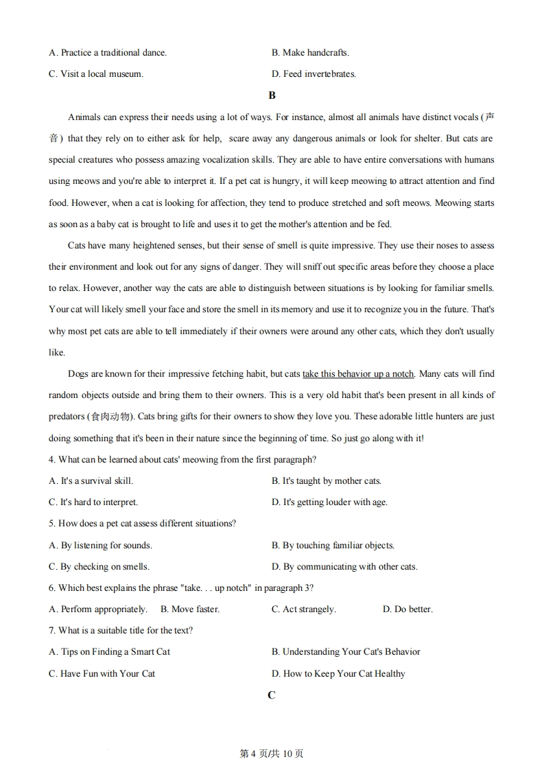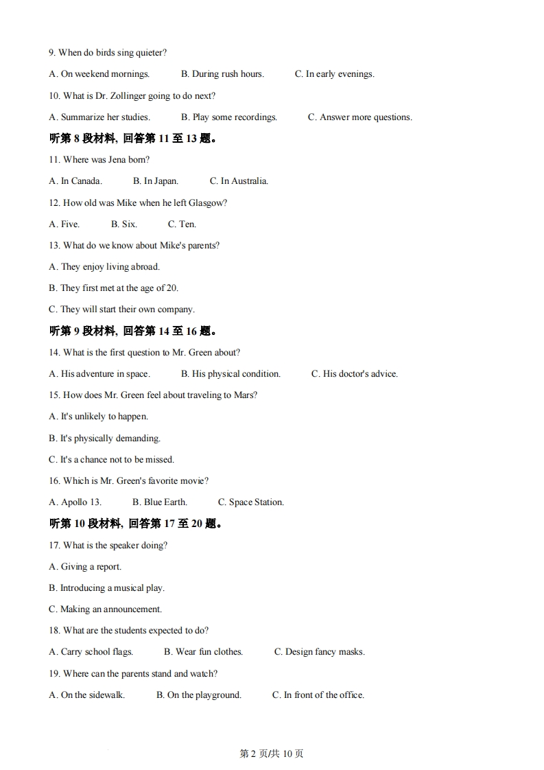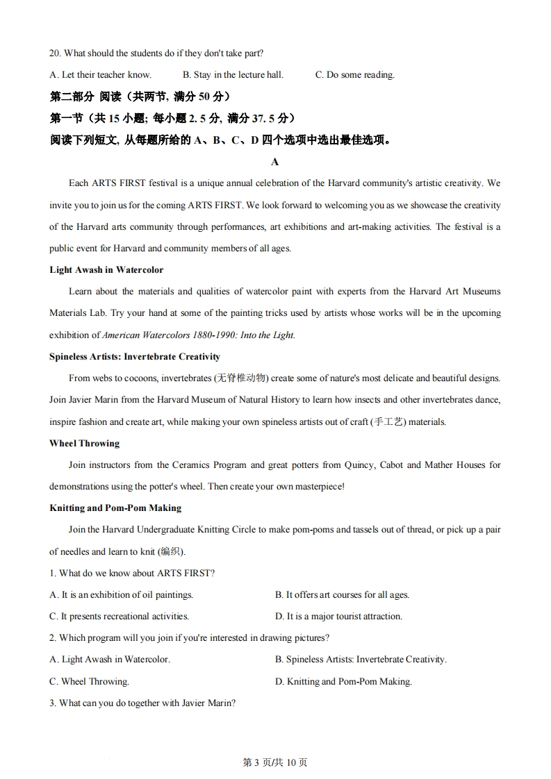 2024年普通高等学校招生全国统一考试(全国甲卷)英语学科第一部分听力(共两节,满分30分)第一节(共5小题;每小题1.5分,满分7.5分)听下面5段对话。每段对话后有一个小题,从题中所给的A、B、C三个选项中选出最佳选项。听完每段对话后,你都有10秒钟的时间来回答有关小题和阅读下一小题。每段对话仅读一遍。1.Where are the speakers going?A.A new restaurant.B.A convenience store.C.Their office.2.When is the class presentation according to Vicky?A.On Thursday.B.On Wednesday.C.On Tuesday3.Why does the woman make the call?A.To check the priceB.To make an apologyC.To cancel her order.4.What is the probable relationship between the speakers?A.Husband and wife.B.Boss and employee.C.Salesperson and customer.5.What are the speakers mainly talking about?A.Their move to a new place.B.Tom's friends at school.C.A sports center.第二节(共15小题;每小题1.5分,满分22.5分)听下面5段对话或独白。每段对话或独白后有几个小题,从题中所给的A、B、C三个选项中选出最佳选项。听每段对话或独白前,你将有时间阅读各个小题,每小题5秒钟;听完后,各小题将给出5秒钟的作答时间。每段对话或独白读两遍。听第6段材料,回答第6、7题。6.What does the girl tell her dad?A.She decides to quit college.B.She worries about her academic abilityC.She is unpopular with her classmates.7.How does the father help his daughter?A By telling a funny joke.B.By sharing his own story.C.By planning a school tour.听第7段材料,回答第8至10题。8.Who is the man?A.A researcher.B.A bird watcher.C.A radio host.第1页供10页9.When do birds sing quieter?A.On weekend mornings.B.During rush hours.C.In early evenings.10.What is Dr.Zollinger going to do next?A.Summarize her studies.B.Play some recordings.C.Answer more questions.听第8段材料,回答第11至13题。11.Where was Jena bom?A.In CanadaB.In Japan.C.In Australia12.How old was Mike when he left Glasgow?A.Five.B.Six.C.Ten.13.What do we know about Mike's parents?A.They enjoy living abroad.B.They first met at the age of 20.C.They will start their own company听第9段材料,回答第14至16题。14.What is the first question to Mr.Green about?A.His adventure in space.B.His physical condition.C.His doctor's advice.15.How does Mr.Green feel about traveling to Mars?A.It's unlikely to happen.B.It's physically demanding.C.It's a chance not to be missed.16.Which is Mr.Green's favorite movie?A.Apollo 13.B.Blue EarthC.Space Station.听第10段材料,回答第17至20题。17.What is the speaker doing?A.Giving a report.B.Introducing a musical play.C.Making an announcement.18.What are the students expected to do?A.Carry school flags.B.Wear fun clothesC.Design fancy masks.19.Where can the parents stand and watch?A.On the sidewalkB.On the playground.C.In front of the office.第2页供10页20.What should the students do if they don't take part?A.Let their teacher know.B.Stay in the lecture hall.C.Do some reading.第二部分阅读(共两节,满分50分)第一节(共15小题:每小题2.5分,满分37.5分)阅读下列短文,从每题所给的A、B、C、D四个选项中选出最佳选项。AEach ARTS FIRST festival is a unique annual celebration of the Harvard community's artistic creativity.Weinvite you to join us for the coming ARTS FIRST.We look forward to welcoming you as we showcase the creativityof the Harvard arts community through performances,art exhibitions and art-making activities.The festival is apublic event for Harvard and community members of all ages.Light Awash in WatercolorLearn about the materials and qualities of watercolor paint with