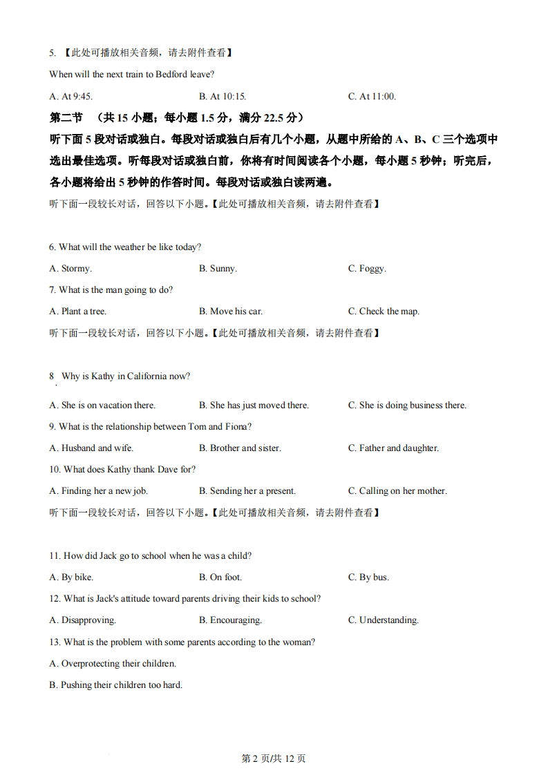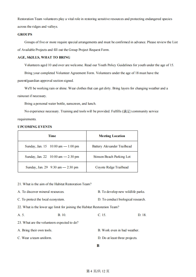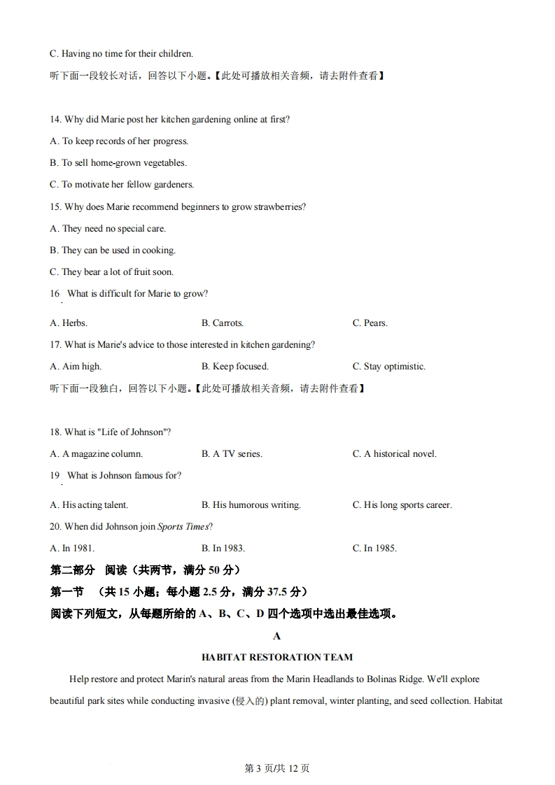 2024年普通高等学校招生全国统一考试(新课标I卷)英语姓名准考证号全卷共12页,满分150分,考试时间120分钟。考生注意:1.答题前,请务必将自己的姓名、准考证号用黑色字迹的签字笔或钢笔分别填写在试题卷和答题纸规定的位置上。2.答题时,请按照答题纸上“注意事项”的要求,在答题纸相应的位置上规范作答,在本试题卷上的作答一律无效。第一部分听力(共两节,满分30分)做题时,先将答案标在试卷上。录音内容结束后,你将有两分钟的时间将试卷上的答案转涂到答题纸上。第一节(共5小题;每小题1.5分,满分7.5分)听下面5段对话。每段对话后有一个小题,从题中所给的A、B、C三个选项中选出最佳选项。听完每段对话后,你都有10秒钟的时间来回答有关小题和阅读下一小题。每段对话仅读一遍。例:How much is the shirt?A.19.15.B.9.18.C.9.15.答案是C。1.【此处可播放相关音频,请去附件查看】What is Kate doing?A.Boarding a flight.B.Arranging a trip.C.Seeing a friend off.2.【此处可播放相关音频,请去附件查看】What are the speakers talking about?A.A pop starB.An old song.C.A radio program3.【此处可播放相关音频,请去附件查看】What will the speakers do today?A.Go to an art showB.Meet the man's aunt.C.Eat out with Mark.4.【此处可播放相关音频,请去附件查看】What does the man want to do?A.Cancel an orderB.Ask for a receiptC.Reschedule a delivery第1页供12页5.【此处可播放相关音频,请去附件查看】When will the next train to Bedford leave?A.At9:45B.At10:15C.At11:00第二节(共15小题:每小题1.5分,满分22.5分)听下面5段对话或独白。每段对话或独白后有几个小题,从题中所给的A、B、C三个选项中选出最佳选项。听每段对话或独白前,你将有时间阅读各个小题,每小题5秒钟;听完后,各小题将给出5秒钟的作答时间。每段对话或独白读两遍。听下面一段较长对话,回答以下小题。【此处可播放相关音频,请去附件查看】6.What will the weather be like today?A.Stormy.B.Sunny.C.Foggy.7.What is the man going to do?A.Plant a tree.B.Move his car.C.Check the map.听下面一段较长对话,回答以下小题。【此处可播放相关音频,请去附件查看】8 Why is Kathy in California now?A.She is on vacation there.B.She has just moved there.C.She is doing business there.9.What is the relationship between Tom and Fiona?A.Husband and wife.B.Brother and sister.C.Father and daughter.10.What does Kathy thank Dave for?A.Finding her a new job.B.Sending her a present.C.Calling on her mother.听下面一段较长对话,回答以下小题。【此处可播放相关音频,请去附件查看】11.How did Jack go to school when he was a child?A.By bike.B.On foot.C.By bus.12.What is Jack's attitude toward parents driving their kids to school?A.Disapproving.B.EncouragingC.Understanding.13.What is the problem with some parents according to the woman?A.Overprotecting their children.B.Pushing their children too hard.第2页供12页C.Having no time for their children.听下面一段较长对话,回答以下小题。【此处可播放相关音频,请去附件查看】14.Why did Marie post her kitchen gardening online at first?A.To keep records of her progress.B.To sell home-grown vegetables.C.To motivate her fellow gardeners.15.Why does Marie recommend beginners to grow strawberries?A.They need no special care.B.They can be used in cooking.C.They bear a lot of fruit soon.16 What is difficult for Marie to grow?A.Herbs.B.Carrots.C.Pears.17.What is Marie's advice to those interested in kitchen gardening?A.Aim highB.Keep focused.C.Stay optimistic.听下面一段独白,回答以下小题。【此处可播放相关音频,请去附件查看】18.What is "Life of Johnson"?A.A magazine column.B.A TV series.C.A historical novel.19 What is Johnson famous for?A.His acting talentB.His humorous writing.C.His long sports career.20.When did Johnson join Sports Times?A.n1981.B.In1983C.In1985.第二部分阅读(共两节,满分50分)第一节(共15小题:每小题2.5分,满分37.5分)阅读下列短文,从每题所给的A、B、C、D四个选项中选出最佳选项。AHABITAT RESTORATION TEAMHelp restore and protect Marin's natural areas from the Marin Headlands to Bolinas Ridge.We'll explorebeautiful park sites