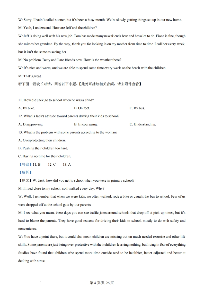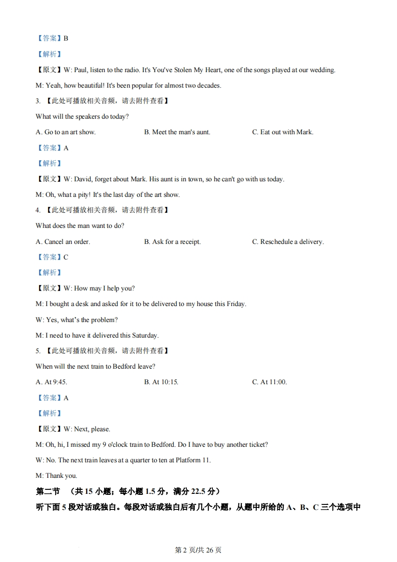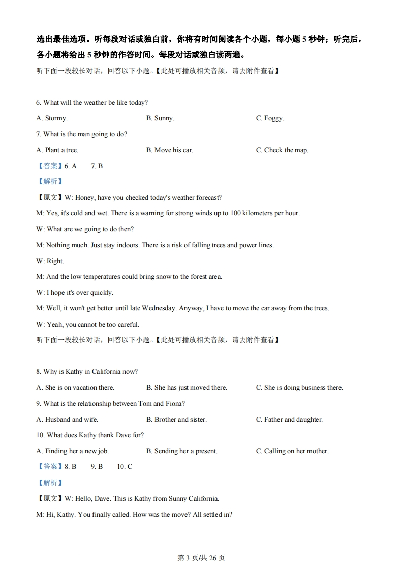 2024年普通高等学校招生全国统一考试(新课标I卷)英语姓名准考证号全卷共12页,满分150分,考试时间120分钟。考生注意:1.答题前,请务必将自己的姓名、准考证号用黑色字迹的签字笔或钢笔分别填写在试题卷和答题纸规定的位置上。2.答题时,请按照答题纸上“注意事项”的要求,在答题纸相应的位置上规范作答,在本试题卷上的作答一律无效。第一部分听力(共两节,满分30分)做题时,先将答案标在试卷上。录音内容结束后,你将有两分钟的时间将试卷上的答案转涂到答题纸上。第一节(共5小题;每小题1.5分,满分7.5分)听下面5段对话。每段对话后有一个小题,从题中所给的A、B、C三个选项中选出最佳选项。听完每段对话后,你都有10秒钟的时间来回答有关小题和阅读下一小题。每段对话仅读一遍。例:How much is the shirt?A.19.15.B.9.18.C.9.15.答案是C。1.【此处可播放相关音频,请去附件查看】What is Kate doing?A.Boarding a flight.B.Arranging a trip.C.Seeing a friend off.【答案】C【解析】【原文】M:Thanks for the wonderful weekend,Kate.W:That's okay.Bob and I are glad you came to see us.M:Oh,I have to go in.My flight will take off soon.Do contact me when you're in Sydney.W:Sure,we will.2.【此处可播放相关音频,请去附件查看】What are the speakers talking about?A.A pop star.B.An old song.C.A radio program第1页供26页【答案】B【解析】[W:Paul,listen to the radio.It's You've Stolen My Heart,one of the songs played at our wedding.M:Yeah,how beautiful!It's been popular for almost two decades3.【此处可播放相关音频,请去附件查看】What will the speakers do today?A.Go to an art showB.Meet the man's auntC.Eat out with Mark.【答案】A【解析】【原文】W:David,.forget about Mark.His aunt is in town,so he can't go with us today.M:Oh,what a pity!It's the last day of the art show.4.【此处可播放相关音频,请去附件查看】What does the man want to do?A.Cancel an orderB.Ask for a receiptC.Reschedule a delivery【答案】C【解析】【原文】W:How may I help you?M:I bought a desk and asked for it to be delivered to my house this Friday.W:Yes,what's the problem?M:I need to have it delivered this Saturday5.【此处可播放相关音频,请去附件查看】When will the next train to Bedford leave?A.At9:45.B.At10:15.C.At11:00.【答案】A【解析】【原文】W:Next,please.M:Oh,hi,I missed my 9 o'clock train to Bedford.Do I have to buy another ticket?W:No.The next train leaves at a quarter to ten at Platform 11.M:Thank you.第二节(共15小题;每小题1.5分,满分22.5分)听下面5段对话或独白。每段对话或独白后有几个小题,从题中所给的A、B、C三个选项中第2页供26页选出最佳选项。听每段对话或独白前,你将有时间阅读各个小题,每小题5秒钟;听完后,各小题将给出5秒钟的作答时间。每段对话或独白读两遍。听下面一段较长对话,回答以下小题。【此处可播放相关音频,请去附件查看】6.What will the weather be like today?A.StormyB.Sunny.C.Foggy.7.What is the man going to do?A.Plant a treeB.Move his car.C.Check the map.【答案】6.A7.B【解析】【原文】W:Honey,.have you checked today's weather forecast??M:Yes,it's cold and wet.There is a waming for strong winds up to 100 kilometers per hour.W:What are we going to do then?M:Nothing much.Just stay indoors.There is a risk of falling trees and power lines.W:Right.M:And the low temperatures could bring snow to the forest area.W:I hope it's over quicklyM:Well,it won't get better until late Wednesday.Anyway,I have to move the car away from the trees.W:Yeah,you cannot be too careful.听下面一段较长对话,回答以下小题。【此处可播放相关音频,请去附件查看】8.Why is Kathy in California now?A.She is on vacation thereB.She has just moved there.C.She is doing business there.9.What is the relationship between Tom and Fiona?A.Husband and wifeB.Brother and sister.C.Father and daughter.10.What does Kathy thank Dave for?A.Finding her a new job.B.Sending her a present.C.Calling on her mother.【答案】8.B9.B10.C【解析】【原文】W:Hello,Dave.This is Kath