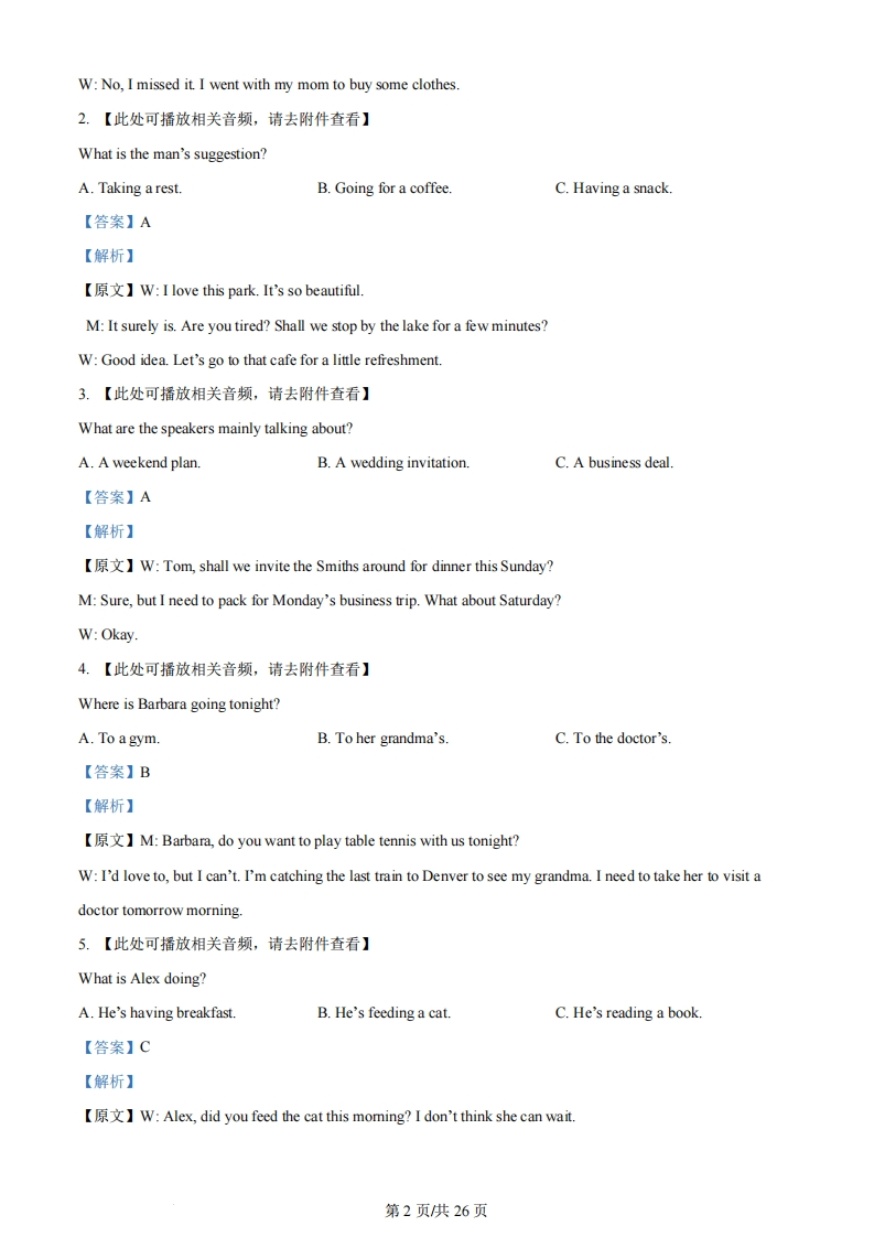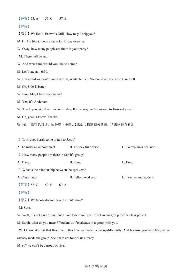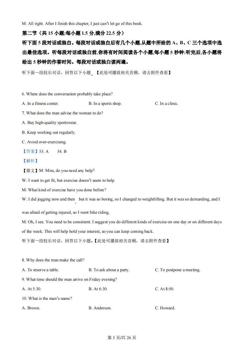绝密★启用前2024年普通高等学校招生全国统一考试英语本试卷共12页。考试结束后,将本试卷和答题卡一并交回。注意事项:1.答题前,考生先将自己的姓名、准考证号码填写清楚,将条形码准确粘贴在考生信息条形码粘贴区。2.选择题必须使用2B铅笔填涂;非选择题必须使用0.5毫米黑色字迹的签字笔书写,字体工整、笔迹清楚。3.请按照题号顺序在答题卡各题目的答题区域内作答,超出答题区域书写的答案无效:在草稿纸、试卷上答题无效。4.作图可先使用铅笔画出,确定后必须用黑色字迹的签字笔描黑。5.保持卡面清洁,不要折叠,不要弄破、弄皱,不准使用涂改液、修正带、刮纸刀。第一部分听力(1一20小题)在笔试结束后进行。注意事项:英语听力共两节,20小题,每小题1.5分,满分30分。第一部分听力(共两节,满分30分)做题时,先将答案标在试卷上。录音内容结束后,你将有两分钟的时间将试卷上的答案转涂到答题卡上。第一节(共5小题;每小题1.5分,满分7.5分)听下面5段对话。每段对话后有一个小题,从题中所给的A、B、C三个选项中选出最佳选项。听完每段对话后,你都有10秒钟的时间来回答有关小题和阅读下一小题。每段对话仅读一遍。例:How much is the shirt?A.£19.15.B.9.18.C.9.15.答案是C。1.【此处可播放相关音频,请去附件查看】What did the woman do yesterday evening?A.She watched TV.B.She went shopping.C.She attended a show.【答案】B【解析】【原文】M:Did you watch the talent show on TV last night?第1页供26页W:No,I missed it.I went with my mom to buy some clothes.2.【此处可播放相关音频,请去附件查看】What is the man's suggestion?A.Taking a rest.B.Going for a coffee.C.Having a snack.【答案】A【解析】【原文】W:I love this park.It's so beautiful,M:It surely is.Are you tired?Shall we stop by the lake for a few minutes?W:Good idea.Let's go to that cafe for a little refreshment.3.【此处可播放相关音频,请去附件查看】What are the speakers mainly talking about?A.A weekend plan.B.A wedding invitation.C.A business deal.【答案】A【解析】【原文】W:Tom,shall we invite the Smiths around for dinner this Sunday?M:Sure,but I need to pack for Monday's business trip.What about Saturday?W:Okay.4.【此处可播放相关音频,请去附件查看】Where is Barbara going tonight?A.To a gymB.To her grandma's.C.To the doctor's.【答案】B【解析】【原文】M:Barbara,do you want to play table tennis with us tonight?W:I'd love to,but I can't.I'm catching the last train to Denver to see my grandma.I need to take her to visit adoctor tomorrow morning.5.【此处可播放相关音频,请去附件查看】What is Alex doing?A.He's having breakfast.B.He's feeding a cat.C.He's reading a book【答案】C【解析】【原文】W:Alex,did you feed the cat this moming?Idon't think she can wait.第2页供26页M:All right.After I finish this chapter,I just can't let go of this book.第二节(共15小题;每小题1.5分,满分22.5分)听下面5段对话或独白。每段对话或独白后有几个小题,从题中所给的A、B、C三个选项中选出最佳选项。听每段对话或独白前,你将有时间阅读各个小题,每小题5秒钟:听完后,各小题将给出5秒钟的作答时间。每段对话或独白读两遍。听下面一段较长对话,回答以下小题【此处可播放相关音频,请去附件查看】6.Where does the conversation probably take place?A.In a fitness center.B.In a sports shop.C.In a clinic.7.What does the man advise the woman to do?A.Buy high-quality sportswearB.Keep working out regularly.C.Avoid over-exercising.【答案】53.A54.B【解析】【原文】M:Miss,do you need any help?W:I want to get fit,but exercise doesn't seem to help.M:What kind of exercise have you done before?W:I did jogging now and then but it was so boring,so I changed to weightlifting.But it was so demanding,and Iwas afraid of getting injured,so I went bike riding.M:Oh,I see.You need to be consistent.I suggest you do different kinds of exercise on one day or on different daysof the week.This will help hold your interest,so you can keep coming back.听下面一段较长对话,回答以下小题。【此处可播放相关音频,请去附件查看】8.Why does the man make the call?A.To reserve a table.B.To ask about a party.C.To postpone a meeting.9.What time should the man arrive on Friday