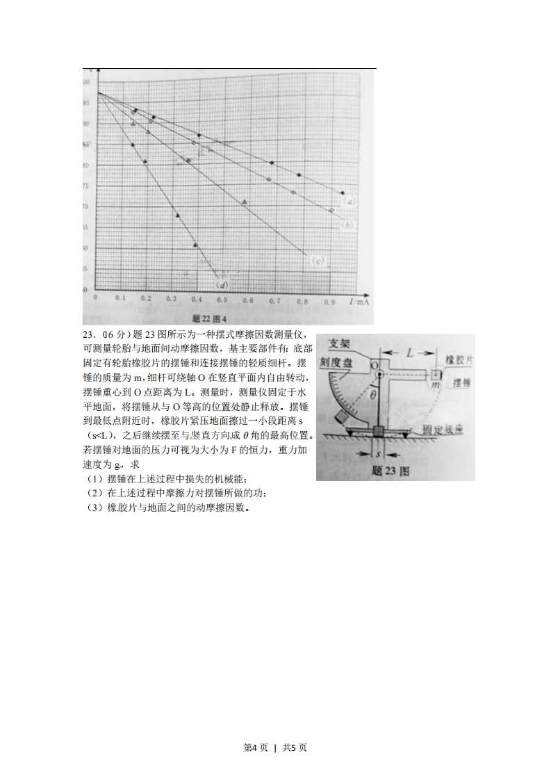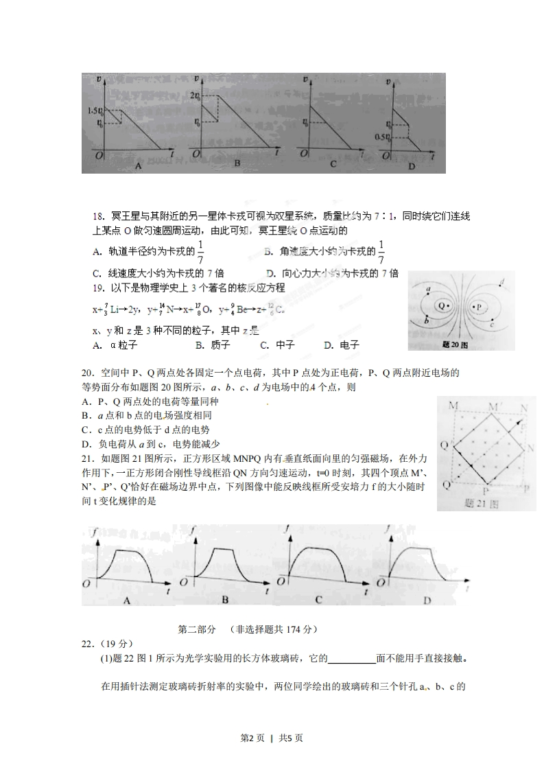 2012年普通高等学校招生全国统一考试(重庆卷)理综物理【试卷总评】试题依据高考大纲,覆盖高中物理全部内容,重点考查高中物理的主干知识,难度适宜,效度好,信度高,具有一定的区分度。第一部分(选择题共126分)14.装有砂粒的试管竖直静浮于水面,如图所示。将试管竖直提起少许,然后由静止释放并开始计时,在一定时间内试管在竖直方向近似做简谐运动。若取竖直向上为正方向,则以下描述试管振动的图象中可能正确的是15.如图所示,理想变压器的原线圈接入u=11000√2s100πt的交变电压,副线圈通过电阻r=6Q的导线对“220V880w”的电器R供电,该电器正常工作。由此可知A.原、副线圈的匝数比为50:1B.交变电压的频率为100HzC.副线圈中电流的有放值为4AD.变压器的输入功率为880W16题图为加利略设计的一种测温装置示意图,玻璃管的上端与导热良好的玻璃泡连通,下端插入水中,玻璃泡中封闭有一定量的空气。若玻璃管内水柱上升,则外界大气的变化可能是A.温度降低,压强增大玻璃泡空气外界B.温度升高,压强不变C.温度升高,压强减小玻璃管D.温度不变,压强减小17.质量为m的人站在质量为2m的平板小车上,以共同的速度在水平地面上沿直线前行,车所受地面阻力的大小与车对地面压力的大小成正比。当车速为时,人从车上以相对于地面大小为的速度水平向后跳下。跳离瞬间地面阻力的冲量忽略不计,则能正确表示车运动的一t图象为第1页1共5页etD18.冥王星与其附近的另一星体卡戎可视为双星系统,质量此约为7:1,同时绕它们连线上某点0做匀速圆周运动,由此可知,冥王星绕0点运动的A教道牛径约为木成的月.角速度大小约为卡戎的C.线速度大小约为卡戎的7倍D.向心力大小约为卡戎的7倍19.以下是物理学史上3个著名的核反应方程x+gLi→2y,y+4N→x+0,y4?Be→z+2C+Px、y和z是3种不同的粒子,其中z是A.C粒子B.质子C.中子D.电子题20图20.空间中P、Q两点处各固定一个点电荷,其中P点处为正电荷,P、Q两点附近电场的等势面分布如题图20图所示,a、b、c、d为电场中的4个点,则A.P、Q两点处的电荷等量同种B.a点和b点的电场强度相同C.c点的电势低于d点的电势D.负电荷从a到c,电势能减少21.如题图21图所示,正方形区域MNPQ内有垂直纸面向里的匀强磁场,在外力作用下,一正方形闭合刚性导线框沿QN方向匀速运动,0时刻,其四个顶点MN、P'、Q恰好在磁场边界中点,下列图像中能反映线框所受安培力f的大小随时间t变化规律的是题21图第二部分(非选择题共174分)22.(19分)(1)题22图1所示为光学实验用的长方体玻璃砖,它的面不能用手直接接触。在用插针法测定玻璃砖折射率的实验中,两位同学绘出的玻璃砖和三个针孔a.、b、c的第2页1共5页位置相同,且插在c位置的针正好挡住插在、b位置的针的像,但最后一个针孔的位置不同,分别为d、e两点,如题22图2所示,计算折射率时,用(填“d”或e”)点得到的值较小,用(填“d”或“e”)点得到的值误差较小。玻璃砖磨砂面.C光学面磨砂面de题22图1题22图2(2)某中学生课外科技活动小组利用铜片、锌片和家乡盛产的柑橘作了果汁电池,他们测量这种电池的电动势E和内阻,并探究电极间距对E和r的影响。实验器材如题22图3所示。①测量E和r的实验方案为:调节滑动变阻器,改变电源两端的电压U和流过电源的电流I,依据公式利用测量数据作出片U-I图像,得出E和.②将电压表视为理想表,要求避免电流表分压作用对测量结果的影响,请在题22图3中用笔画线代替导线连接电路。③实验中依次减小铜片与锌片的间距,分别得到相应桌汁电池的U1图像如题22图4(见下页)中(a)、(b)、(c)、(d)所示,由此可知:可贰在该实验中,随电极间距的减小,电源电动势(填增题22图3大减小或“不变),电源内阻(填增大”减小或不变”)。曲线(c)对应的电源电动势E=,内阻=2,当外电路总电阻为25002时,该电源的输出功率2=mW.(均保留三位有效数字)第3页1共5页