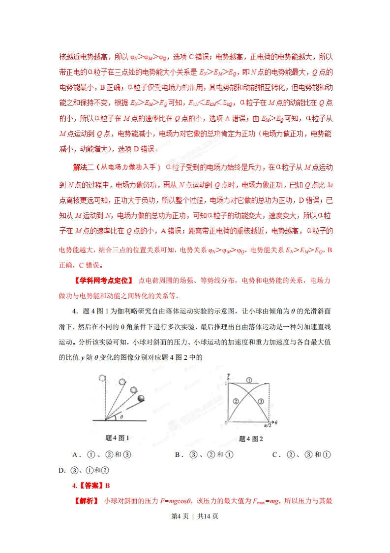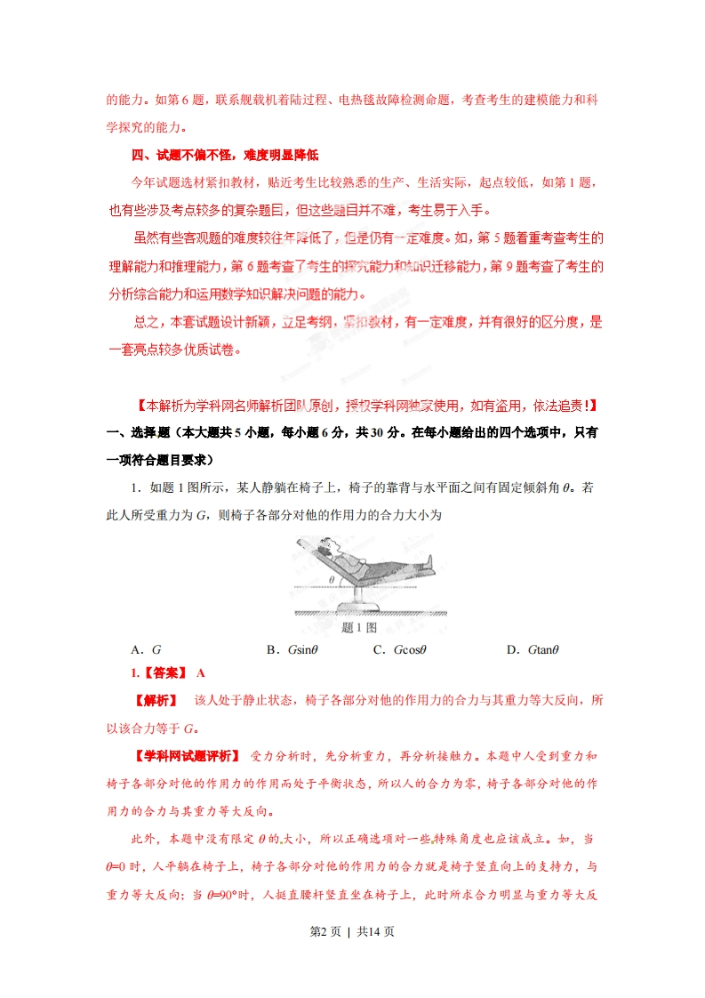 2013年普通高等学校招生全国统一考试理科综合(重庆卷)物理(精编版)今年是重庆新课标改革后高考的第一年。正如《考试说明》,物理试卷的分数和结构较往年都有很大变化:物理总分从120分调整为110分:原来均为必答题,今年改为必做题(包括必修1、必修2、选修3-1、选修3-2和选修3-5)和选做题(包括选修3-3和选修3-4),试卷提供了两个选做题(均是一个选择题和一个计算题),要求考生任选其一来做:选择题的题量与分值也发生变化,由原来的8个减少到5个(每小题仍是6分),总分值由48分减到30分。2013年重庆高考物理试题,立足《考试说明》,难度适中,注重对考生学科知识和各种能力的考查,是一套创新性较强、亮点较多的高考卷。一、考点分布还算全面,分值分布比较合理试卷抓住了学科主干知识:必修1、必修2模块主要考查了直线运动、追及相遇问题、力的平衡、牛顿运动定律、匀速圆周运动等,共计约44分,占40%:选修31、32主要主考查了带电粒子在电场中运动问题、电路故厚检测、重尔效应、电磁兹感应中单导体棒切害割磁感线运动约37分,约占34%;选修35考查了核反应方程、动量守恒,约11分,占10%;选考模块3-3和3-4各计12分,约占11%,分别考查了气体、热力学定律、气体状态方程和简谐横波的波长、光的折射、折射率。但是,也有一些常见的核心考点没有考查到,如天体运动、带电粒子在复合场中的运动、交变电流、变压器等。二、强调基础,注重能力试题注重考查学科基础知识,并将对考生能力的考查渗透到各个试题中。如第6题,重在考查考生应用基础知识和基本技能分析问题和解决问题的能力第9题注重考查了考生创新的思维过程,而不仅仅是思维的结果。三、贴近敏材,联系生活、生产实际11道试题中,有4道题(第2、3、4、5题)源于教程,但考核角度新颖。如,第2题的核反应方程源于人教版选修3-5“重核的裂变”一节,第3题以ā粒子散射模型为背景,考查了静电场知识,这也兼顾考查了考生对ā粒子散射的理解,第4题结合教材上“伽利略的斜面实验”,进行拓展延伸,不仅再现了伽利略将实验和逻辑推理相结合的科学探究方法的精髓,还考查了考生对牛顿运动定律和图象的掌握情况,可以说是一道源于教材,而又不拘泥于教材的好题。另有3道题(第1、6、10题),联系生活、生产实际命题,注重考查考生解决实际问题第1页|共14页的能力。如第6题,联系舰载机着陆过程、电热毯故障检测命题,考查考生的建模能力和科学探究的能力。四、试题不偏不怪,难度明显降低今年试题选材紧扣教材,贴近考生比较熟悉的生产、生活实际,起点较低,如第1题,也有些涉及考点较多的复杂题目,但这些题目并不难,考生易于入手。虽然有些客观题的难度较往年泽低了,但是仍有一正难度。如,第5题着重考查考生的理解能力和推理能力,第6题考查了考生的探究能力和唤如识迁移能力,第9题考查了考生的分析综合能力和运用数学知识解决问题的能力。总之,本套试题设计新颖,立足考纲,紧扣敢材,有一定难度,并有很好的区分度,是一套亮点较多优质试卷。【本解析为学科网名师解析团队原创,授权学科网驰家使用,如有盗用,依法追责!】一、选择题(本大题共5小题,每小题6分,共30分。在每小题给出的四个选项中,只有一项符合题目要求)1.如题1图所示,某人静躺在椅子上,椅子的靠背与水平面之间有固定倾斜角0。若此人所受重力为G,则椅子各部分对他的作用力的合力大小为题1图A.GB.GsinC.Gcos0D.Gtan1.【答案】A【解析】该人处于静止状态,椅子各部分对他的作用力的合力与其重力等大反向,所以该合力等于G。【学科网试题评析】受力分析时,先分析重力,再分析接触力。本题中人受到重力和椅子各部分对他的作用力的作用而处于平衡状态,所以人的合力为零,椅子各部分对他的作用力的合力与其重力等大反向。此外,本题中没有限定0的大小,所以正确进项对一些特殊角度也应该成立。如,当=0时,人平躺在椅子上,椅子各部分对他的作用力的合力就是椅子竖直向上的支持力,与重力等大反向:当=90°时,人挺直腰杆竖直坐在椅子上,此时所求合力明显与重力等大反第2页|共14页向。四个选择中,0=0或90°时,均等于G的只有选项A。【学科网考点定位】受力分析、共点力的平衡2,铀是常用的一种核燃料,若它的原子核发生了如下的裂变反应:U+h→a+b+2n,则a+b可能是A.Xe+KB.Ba+KrC.Ba+SrD.s Xe+Sr2.【答案】D【解析】重核裂变反应方程的书写应遵循质量数守恒和电荷数守恒,题述核反应方程左边反应物的质量数和电荷数分别伪236和92,生成物中“+b”整体的质量数和电荷数应该分别伪234和92,只有选项D符合要求。【学科网试题评析】一切核反应(包括画核裂变、轻核聚变、各种衰变和人工核转变等)的过程满足质量数守恒、电荷数宁恒、动量守恒和能量守恒四个守恒定律,而书写核反应方程时应遵循质量数守恒和电荷数守恒。【学科网考点定位】重核裂变反应方程的书写3.如题3图所示,高速运动的“粒子被位于O点的重原子核散射,实线表示粒子运动的轨迹,M、N和Q为轨迹上的三点,N点离核最近,Q点比M点离核更远,则N0o题3图A.a粒子在M点的速率比在Q点的大B.三点中,a粒子在N点的电势能最大C.在重核产生的电场中,M点的电势比Q点的低D.a粒子从M点运动到Q点,电场力对它做的总功为负功3.【答案】B【解析】解法一(从等势线分布入手):重核带正电荷