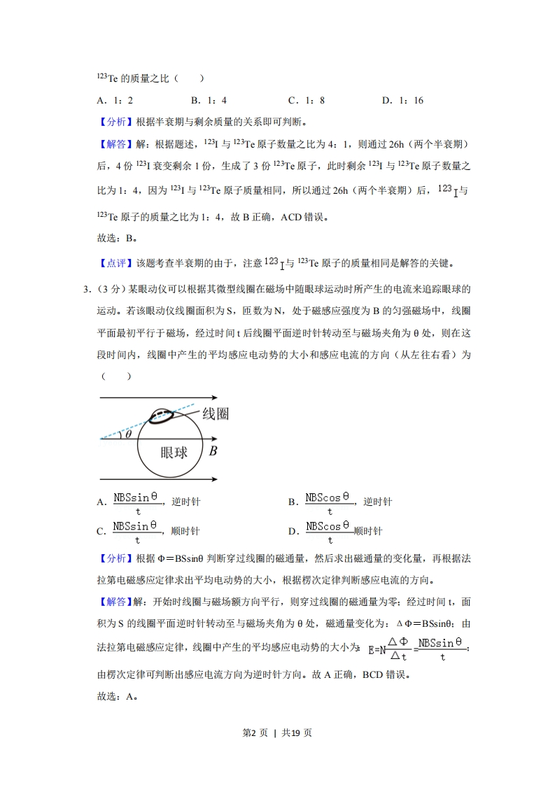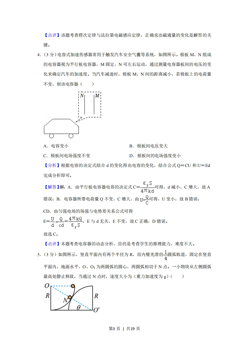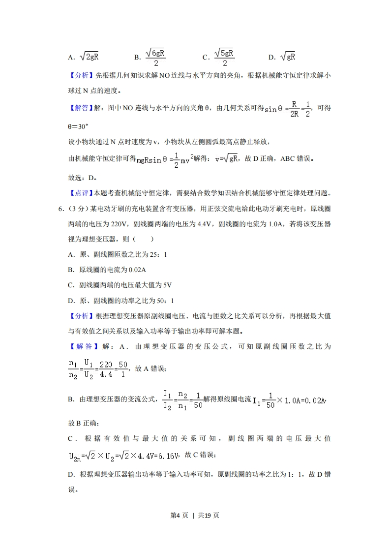 2021年重庆市新高考物理试卷事考答案与试题佩析一、单选题1.(3分)如图所示,人游泳时若某时刻手掌对水的作用力大小为F,该力与水平方向的夹角为30°,则该力在水平方向的分力大小为()30A.2FB.√3FC.FD.2【分析】以F为对角线,分别沿水平和竖直方向为邻边做平行四边,求水平分力。【解答】解:根据平行四边形定则,可知沿水平方向和竖直方向将手掌对水的作用力分解,如图所示:30°则该力在水平方向的分力大小为:FPc0e30°,故ABC错误,D正确,2故选:D。【点评】合力与分力共同作用效果相同,是等效替代的关系,满足平行四边形定则。2.(3分)放射性元素123I会衰变为稳定的123Te,半衰期约为13h,可以用于检测人体的甲状腺对碘的吸收。若某时刻12与123Te的原子数量之比为4:1,则通过26h后12打与第1页|共19页123Te的质量之比()A.1:2B.1:4C.1:8D.1:16【分析】根据半衰期与剩余质量的关系即可判断。【解答】解:根据题述,121与123Te原子数量之比为4:1,则通过26h(两个半衰期)后,4份123I衰变剩余1份,生成了3份123Te原子,此时剩余123I与123Te原子数量之比为1:4,因为1231与123Te原子质量相同,所以通过26h(两个半衰期)后,123r与123Te原子的质量之比为1:4,故B正确,ACD错误。故选:B。【点评】该题考查半衰期的由于,注意1231与123Te原子的质量相同是解答的关键。3.(3分)某眼动仪可以根据其微型线圈在磁场中随眼球运动时所产生的电流来追踪眼球的运动。若该眼动仪线圈面积为S,匝数为N,处于磁感应强度为B的匀强磁场中,线圈平面最初平行于磁场,经过时间t后线圈平面逆时针转动至与磁场夹角为日处,则在这段时间内,线圈中产生的平均感应电动势的大小和感应电流的方向(从左往右看)为线圈.10眼球BA.NBSsin日,逆时针B.BSc0s日,逆时针ttC.NBSsine,顺时针D.仍Sc0s9顺时针t【分析】根据中=BSsi0判断穿过线圈的磁通量,然后求出磁通量的变化量,再根据法拉第电磁感应定律求出平均电动势的大小,根据楞次定律判断感应电流的方向。【解答】解:开始时线圈与磁场额方向平行,则穿过线圈的磁通量为零:经过时间,面积为S的线圈平面逆时针转动至与磁场夹角为0处,磁通量变化为:△中=BSsi0:由法拉第电磁感应定律,线圈中产生的平均感应电动势的大小为E=N△t△ΦBSsin9t由楞次定律可判断出感应电流方向为逆时针方向。故A正确,BCD错误。故选:A。第2页|共19页【点评】该题考查楞次定律与法拉第电磁感应定律,正确求出磁通量的变化是解答的关键。4.(3分)电容式加速传感器常用于触发汽车安全气囊等系统,如图所示。极板M、N组成的电容器视为平行板电容器,M固定,N可左右运动,通过测量电容器板间的电压的变化来确定汽车的加速度。当汽车减速时,极板M、N间的距离减小,若极板上的电荷量不变,则该电容器(A.电容变小B.极板间电压变大C.极板间电场强度不变D.极板间的电场强度变小【分析】根据电容的决定式结合d的变化得出电容的变化,结合公式Q=CU和U=Ed完成分析即可。【解答】解:A.由平行板电容器电容的决定式C=E,S可得,d减小,C增大,故A4πk错误:B。电容器所带电荷量Q不变,C增大,由=Q可得,U变小,故B错误:CD.由匀强电场的场强与电势差关系公式可得E=卫Q=4TkQd cd ESE与d无关,E不变,故C正确,D错误。故选C。【点评】本题考查电容器的动态分析,目的是考查学生的推理能力,难度不大。5.(3分)如图所示,竖直平面内有两个半径为R,而内壁光滑的1圆弧轨道,固定在竖直平面内,地面水平,O、O1为两圆弧的圆心,两圆弧相切于N点。一小物块从左侧圆弧最高处静止释放,当通过N点时,速度大小为(重力加速度为g)()第3页|共19页