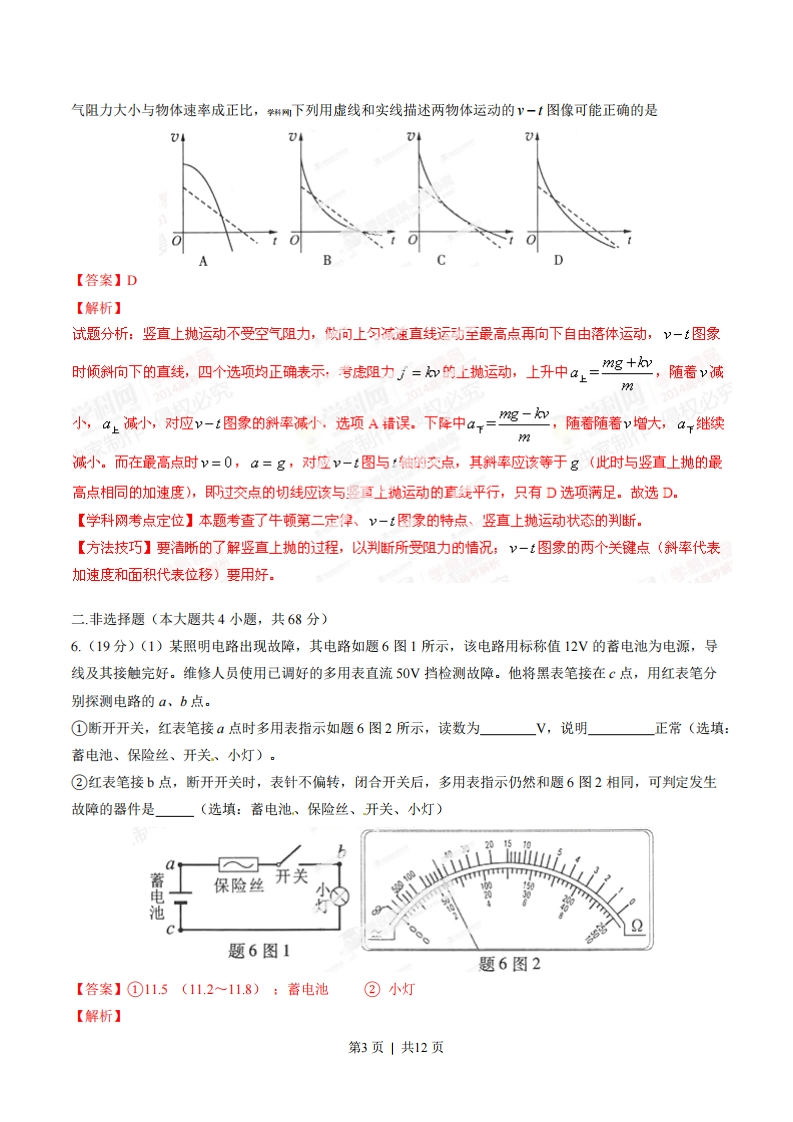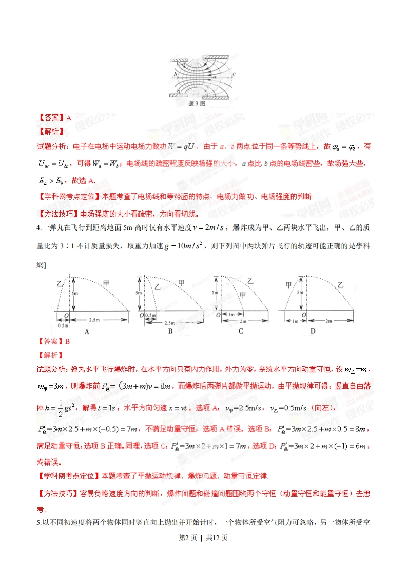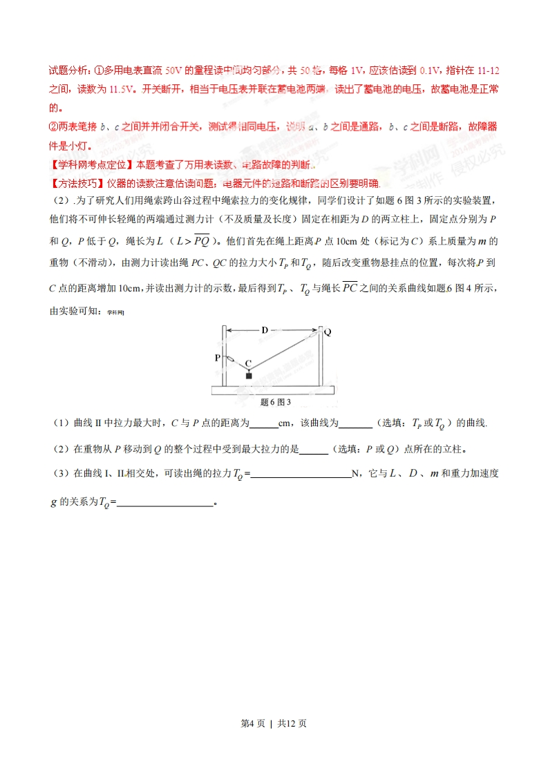 2014年高考重庆卷理科综合物理部分(110分)一、选择题(本大题共5小题,每小题6分,共30分.在每小题给出的四个备选项中,只有一项符合题目要求)1.碘131的半衰期约为8天,若某药物含有质量为m的碘131,经过32天后,该药物中碘131的含量大约还有A..17m17m17mB.C.D.481632*网1【答案】C【解析】试题分析:放射性物质发生衰变时,由原子核的衰变公式m。=三,其中=二=2=4为半衰期的2次数,解得m=,故选C16独家制【学科网考点定位】本题考查了原子核的衰变规律、半意期的计蓟【方法技巧】原子物理部分主要知识加强记忆。2.某车以相同的功率在两种不同的水平路面上行驶,受到的阻力分别为车重的k和k倍,最大速率分别为y和2,学利网则A.v2=kVB.2=C,=上网D.y2=k2%k2【答案】B【解析】试题分析:汽车的阻力分别为方=mg:方=8,当汽车以相同功率启动达到最大速度时,有F=寸,万店=在以故选B.散由P=可知最大速度v==,则上=占=点,有%三014【学科网考点定位】本题考查了机车的启动视律、腾时功率的计算层权【方法技巧】从汽车的两种启动(以恒定功率启动和以恒定加速度启动)中找到运动的特点。3.如题3图所示为某示波管内的聚焦电场,实线和虚线分别表示电场线和等势线,两电子分别从、b两点运动到c点,學科網设电场力对两电子做的功分别为W和W。,a、b点的电场强度大小分别为E。和E。,则A.W。=W,E。>E。B.W。≠W,E。>E。C.W。=W,E。E,故选A【学科网考点定位】本题考查了电场线和等玲面的特点、电场力做功、电场强度的判断【方法技巧】电场强度的大小看疏密,方向看切线。4.一弹丸在飞行到距离地面5m高时仅有水平速度v=2m/s,爆炸成为甲、乙两块水平飞出,甲、乙的质量比为3:1.不计质量损失,取重力加速g=10m/s2,则下列图中两块弹片飞行的轨迹可能正确的是學科網]甲m0.5m2.5mBD【答案】B【解析】试题分析:弹丸水平飞行爆炸时,在水平方向只有内力作用,外力为零,系统水平方向动量守恒,设2=,?甲=3,则爆炸前Pa=(3m十m=8m,而爆炸后两弹片都做平抛运动,由平抛规律可得:竖直自由落体为=号g2,解得1=1s,水平方向匀速x=W.选项A:ye=25m/s,2=0.5m/s(向左),P%=3m×2.5+m×(-0.5)=7m,不满足动量守恒,选项A错误.选项B:P%=3m×2.5+m×0.5=8m,满足动量守恒:选项B正确.同理,选项C:P%=3m×2+m×1=7m,选项D:P%=3m×2+m×(-1)=6m,均错误。【学科网考点定位】本题考查了平抛运动机律、爆炸问题、动量宁恒定律【方法技巧】容易负略速度方向的判断,爆炸问题和送撞问题围绕两个守恒(动量守恒和能量守恒)去思考。5.以不同初速度将两个物体同时竖直向上抛出并开始计时,一个物体所受空气阻力可忽略,另一物体所受空第2页|共12页气阻力大小与物体速率成正比,科网下列用虚线和实线描述两物体运动的v一1图像可能正确的是04【答案】D【解析】试题分析:竖直上抛运动不受空气阻力,做向上匀减速直线运动至最高点再向下自由落体运动,y一t图象时倾斜向下的直线,四个选项均正确表示,考虑阻力/=,的上抛运动,上升中a,=3+-,随着y减小,4上减小,对应v-:图象的斜率减小,选项A请误。下降中a,=8一,随着随着v增大,a,继续减小。而在最高点时v=0,α=g,对应v一t图与轴的交点,其斜率应该等于g(此时与竖直上抛的最高点相同的加速度),即过交点的切线应该与竖道上抛运动的直线平行,只有D选项满足。故选D。【学科网考点定位】本题考查了牛顿第二定律、y一图象的特点、竖直上抛运动状态的判断。【方法技巧】要清晰的了解竖直上抛的过程,以判断所受阻力的情况:y一图象的两个关键点(斜率代表加速度和面积代表位移)要用好。二.非选择题(本大题共4小题,共68分)6.(19分)(1)某照明电路出现故障,其电路如题6图1所示,该电路用标称值12V的蓄电池为电源,导线及其接触完好。维修人员使用己调好的多用表直流50V挡检测故障。他将黑表笔接在c点,用红表笔分别探测电路的a、b点。①断开开关,红表笔接a点时多用表指示如题6图2所示,读数为V,说明」正常(选填:蓄电池、保险丝、开关、小灯)。②红表笔接b点,断开开关时,表针不偏转,闭合开关后,多用表指示仍然和题6图2相同,可判定发生故障的器件是(选填:蓄电池、保险丝、开关、小灯)a蓄保险丝电、令3333111是3是王乙池题6图1题6图2【答案】①11.5(11.2~11.8):蓄电池②小灯【解析】第3页|共12页