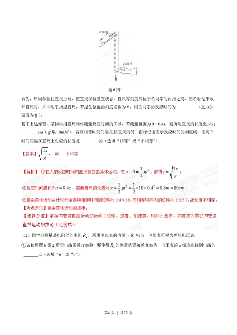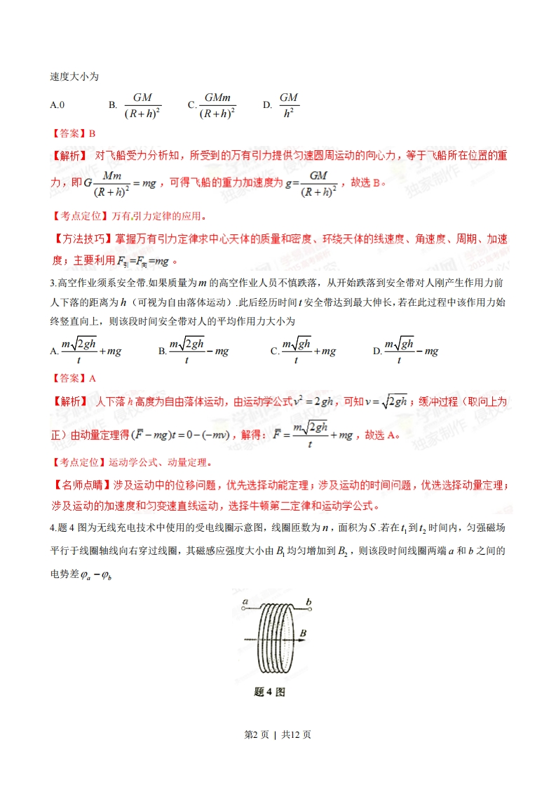 2015年普通高等学校招生全国统一考试(重庆卷)理科综合物理试题(110分)一选择题(本大题共5个小题,每小题6分,共30分。在每小题给出的四个备选项中,只有一项符合题目要求)1.题1图中曲线α、b、c、d为气泡室中某放射物质发生衰变放出的部分粒子的经迹,气泡室中磁感应强度方向垂直纸面向里。以下判断可能正确的是题1图A.a、b为B粒子的经迹B.a、b为y粒子的经迹C.c、d为a粒子的经迹D.c、d为B粒子的经迹【答案】D【解析】y射线是不带电的光子流,在磁场中不偏转,故选项B错误。心粒子为氨核带正电,由左手定则知受到向上的洛伦兹力向上偏转,故选项A、C错误,B粒子是带负电的电子流,应向下偏转,选项D正确。故选D。【考点定位】三种放射线的性质、带电粒子在磁场中的运动。【规律总结】本题主掌握①三种射线的性质比较种类本质质量(u)电荷(e)速度(c)电离性贯穿性Q射线氨核4+20.1最强最弱,纸能挡住B射线电子1/1836-10.99较强较强,穿几mm铝板Y射线光子01最弱最强,穿几cm铅版②三种射线在匀强磁场、匀强电场、正交电场和磁场中的偏转情况比较:(1)(3)2.宇航员王亚平在“天宫1号”飞船内进行了我国首次太空授课,演示了一些完全失重状态下的物理现象。若飞船质量为m,距地面高度为h,地球质量为M,半径为R,引力常量为G,则飞船所在处的重力加第1页|共12页速度大小为GMGMmA.0C.GMB.D(R+h)(R+h)2【答案】B【解析】对飞船受力分析知,所受到的万有引力提供匀速圆周运动的向心力,等于飞船所在位置的重力,即GMmGM(R+)2=mg,可得飞船的重力加速度为g=R+,故选B。【考点定位】万有引力定律的应用。【方法技巧】掌握万有引力定律求中心天体的质量和密度、环绕天体的线速度、角速度、周期、加速度;主要利用F=F=mg。3.高空作业须系安全带如果质量为m的高空作业人员不慎跌落,从开始跌落到安全带对人刚产生作用力前人下落的距离为(可视为自由落体运动),此后经历时间t安全带达到最大伸长,若在此过程中该作用力始终竖直向上,则该段时间安全带对人的平均作用力大小为A.m2g-+mgB.m2gh-17mgC mygh-+mgmgt【答案】A【解析】人下落h高度为自由落体运动,由运动学公式V2=2gh,可知v=√2gh;缓冲过程(取向上为正)由动量定理得(F-mg)北=0-(←m,解得:F=m2g+mg,故选A。【考点定位】运动学公式、动量定理。【名师点睛】涉及运动中的位移问题,优先选择动能定理;涉及运动的时间问题,优选选择动量定理;涉及运动的加速度和匀变速直线运动,选择牛顿第二定律和运动学公式。4.题4图为无线充电技术中使用的受电线圈示意图,线圈匝数为,面积为S若在1到t2时间内,匀强磁场平行于线圈轴线向右穿过线圈,其磁感应强度大小由B均匀增加到B,,则该段时间线圈两端α和b之间的电势差p。-06题4图第2页|共12页A.恒为nS(B-B)B.从0均匀变化到nS(B,-B)52-415-4C.恒为-nS(B,-R)D.从0均匀变化到-nS(B-B)2-4t2-41【答案】C【解析】穿过线圈的磁场均匀增加,将产生大小恒定的感生电动势,由法拉第电感应定律得E=nAg=nS(B-B)而等效电源内部的电流由楞次定理知从a→b,即。点是等效电源的正极,即5-S(B2-B”a-93=-n,故选C。t-方【考点定位】法拉第电磁感应定律、楞次定律。【规律总结】电磁感应共分两种情况:动生问题(棒切割磁感线)产生的电动势E=BL,方向由右△BS手定则;感生问题(磁感应强度的变化)的电动势E=,方向由楞次定律。而电流方向都是等效△t电源内部负极流向正极的方向。5,若货物随升降机运动的ⅴ-t图像如题5图所示(竖直向上为正),则货物受到升降机的支持力F与时间t关系的图像可能是A,-1题5图【答案】B【解析】由v-t图知:过程①为向下匀加速直线运动(加速度向下,失重,F