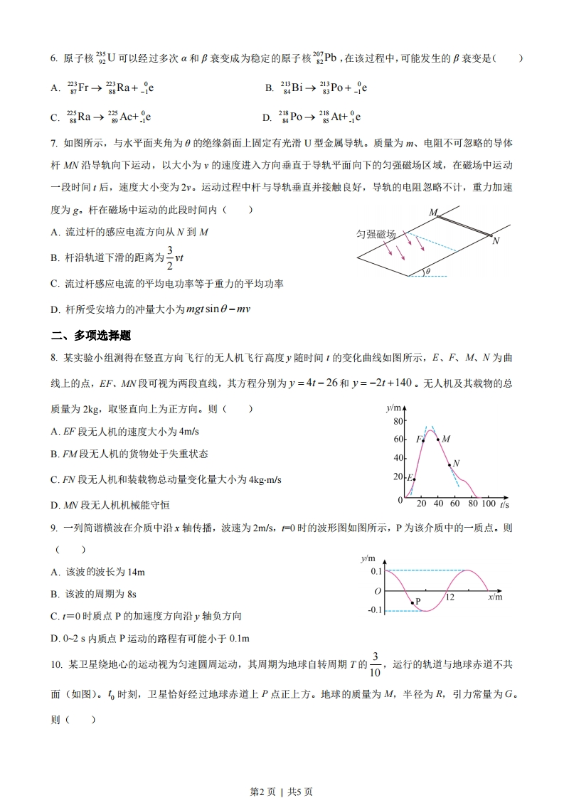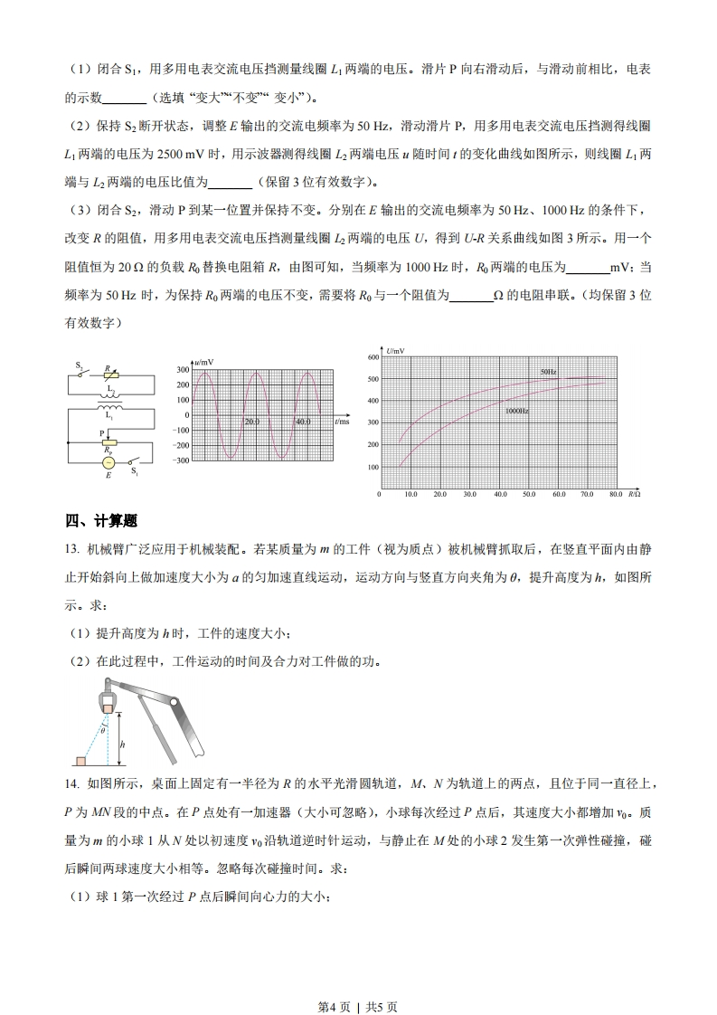 2023重庆高考物理真题一、单项选择题1.矫正牙齿时,可用牵引线对牙施加力的作用。若某颗牙齿受到牵引线的两个作用力大小均为F,夹角为α(如图),则该牙所受两牵引力的合力大小为()A.2Fsin2B.2Fcos2C.FsinaD.Fcosa2.某小组设计了一种呼吸监测方案:在人身上缠绕弹性金属线圈,观察人呼吸时处于匀强磁场中的线圈面积变化产生的电压,了解人的呼吸状况。如图所示,线圈P的匝数为N,磁场的磁感应强度大小为B,方向与线圈轴线的夹角为O。若某次吸气时,在1时间内每匝线圈面积增加了S,则轴线线圈P在该时间内的平均感应电动势为()身体轮廓NBS cos0NBS sin 0A.B.BSsin 0BScos0C.Dt3.真空中固定有两个点电荷,负电荷Q1位于坐标原点处,正电荷Q2位于x轴上,Q2的电荷量大小为Q1的8倍。若这两点电荷在x轴正半轴的=0处产生的合电场强度为0,则Q1、Q2相距()A.xB.(22-1)x0C.2xD.(2√2+1)x04.密封于气缸中的理想气体,从状态a依次经过ab、bc和cd三个热力学过程达到状态d。若该气体的体积V随热力学温度T变化的T图像如图所示,则对应的气体压强随T变化的pT图像正确的是()V0Pd00T5.某实验小组利用双缝干涉实验装置分别观察a、b两单色光的干涉条纹,发现在相同的条件下光屏上a光相邻两亮条纹的间距比b光的小。他们又将a、b光以相同的入射角由水斜射入空气,发现ā光的折射角比b光的大,则()A.在空气中传播时,a光的波长比b光的大B.在水中传播时,a光的速度比b光的大C.在水中传播时,a光的频率比b光的小D.由水射向空气时,a光的全反射临界角比b光的小第1页|共5页6.原子核5U可以经过多次α和B衰变成为稳定的原子核Pb,在该过程中,可能发生的B衰变是()A.Fr→aRa+9eB.2Bi→Po+9eC.2Ra→2Ac+.9eD.2Po→2A+9e7.如图所示,与水平面夹角为0的绝缘斜面上固定有光滑U型金属导轨。质量为m、电阻不可忽略的导体杆N沿导轨向下运动,以大小为ⅴ的速度进入方向垂直于导轨平面向下的匀强磁场区域,在磁场中运动一段时间:后,速度大小变为2v。运动过程中杆与导轨垂直并接触良好,导轨的电阻忽略不计,重力加速度为g。杆在磁场中运动的此段时间内()MA.流过杆的感应电流方向从N到M匀强磁场B.杆沿轨道下滑的距离为”3C.流过杆感应电流的平均电功率等于重力的平均功率D.杆所受安培力的冲量大小为mgt sin0-mv二、多项选释题8.某实验小组测得在竖直方向飞行的无人机飞行高度y随时间1的变化曲线如图所示,E、F、M、N为曲线上的点,EF、MW段可视为两段直线,其方程分别为y=4t-26和y=-2t+140。无人机及其载物的总质量为2kg,取竖直向上为正方向。则()y/m80A.EF段无人机的速度大小为4m/s60B.FM段无人机的货物处于失重状态40C.FN段无人机和装载物总动量变化量大小为4kgm/s20E.D.W段无人机机械能守恒20406080100店9.一列简谐横波在介质中沿x轴传播,波速为2/s,=0时的波形图如图所示,P为该介质中的一质点。则()WmA.该波的波长为14m0.1B.该波的周期为8s.P12x/m-0.1C.1=0时质点P的加速度方向沿y轴负方向D.0-2s内质点P运动的路程有可能小于0.1m310.某卫星绕地心的运动视为匀速圆周运动,其周期为地球自转周期T的,运行的轨道与地球赤道不共10面(如图)。时刻,卫星恰好经过地球赤道上P点正上方。地球的质量为M,半径为R,引力常量为G。则()第2页|共5页A.卫星距地面的高度为42-R卫星轨道、B.卫星与位于P点处物体的向心加速度大小比值为518 0xGMT)9πR赤道C.从t。时刻到下一次卫星经过P点正上方时,卫星绕地心转过的角度为20πD.每次经最短时间实现卫星距P点最近到最远的行程,卫星绕地心转过的角度比地球的多7π三、实验题11.某实验小组用单摆测量重力加速度。所用实验器材有摆球、长度可调的轻质摆线、刻度尺、50分度的游标卡尺、摄像装置等。7012345678910230123甲(1)用游标卡尺测量摆球直径d。当量爪并拢时,游标尺和主尺的零刻度线对齐。放置摆球后游标卡尺示数如图甲所示,则摆球的直径d为mm.(2)用摆线和摆球组成单摆,如图乙所示。当摆线长度1=990.1mm时,记录并分析单摆的振动视频,得到单摆的振动周期T=2.00s,由此算得重力加速度g为m/s2(保留3位有效数字)。d(3)改变摆线长度1,记录并分析单摆的振动视频,得到相应的振动周期。他们发现,分别用1和1+一作为摆长,这两种计算方法得到的重力加速度数值的差异大小△g随摆线长度I的变化曲线如图所示。由图可知,该实验中,随着摆线长度I的增加,△g的变化特点是,原因是4△g(m:s)0.300.200.10300.0600.090.01200.0150.ò1hmm12.一兴趣小组拟研究某变压器的输入和输出电压之比,以及交流电频率对输出电压的影响。题图1为实验电路图,其中L1和L2为变压器的原、副线圈,S,和S2为开关,P为滑动变阻器R,的滑片,R为电阻箱,E为正弦式交流电源(能输出电压峰值不变、频率可调的交流电)。第3页」共5页