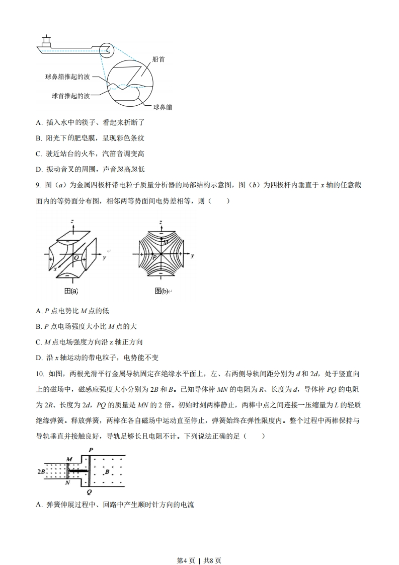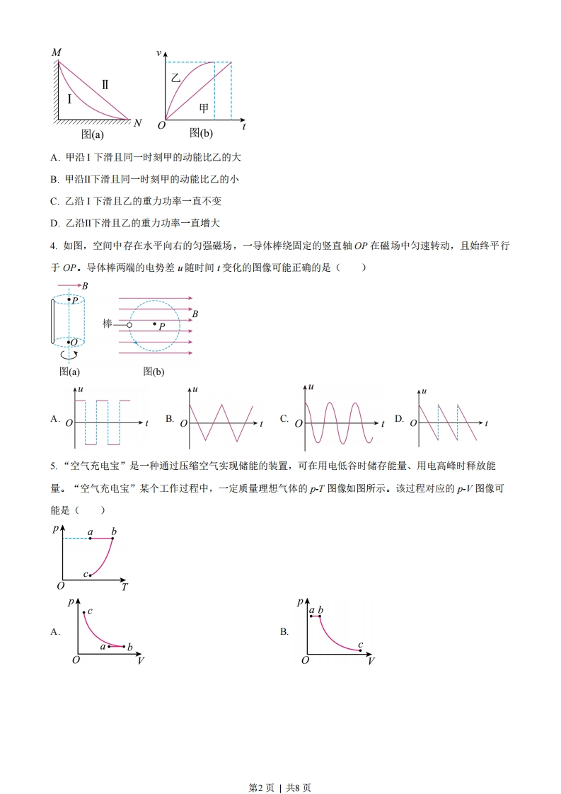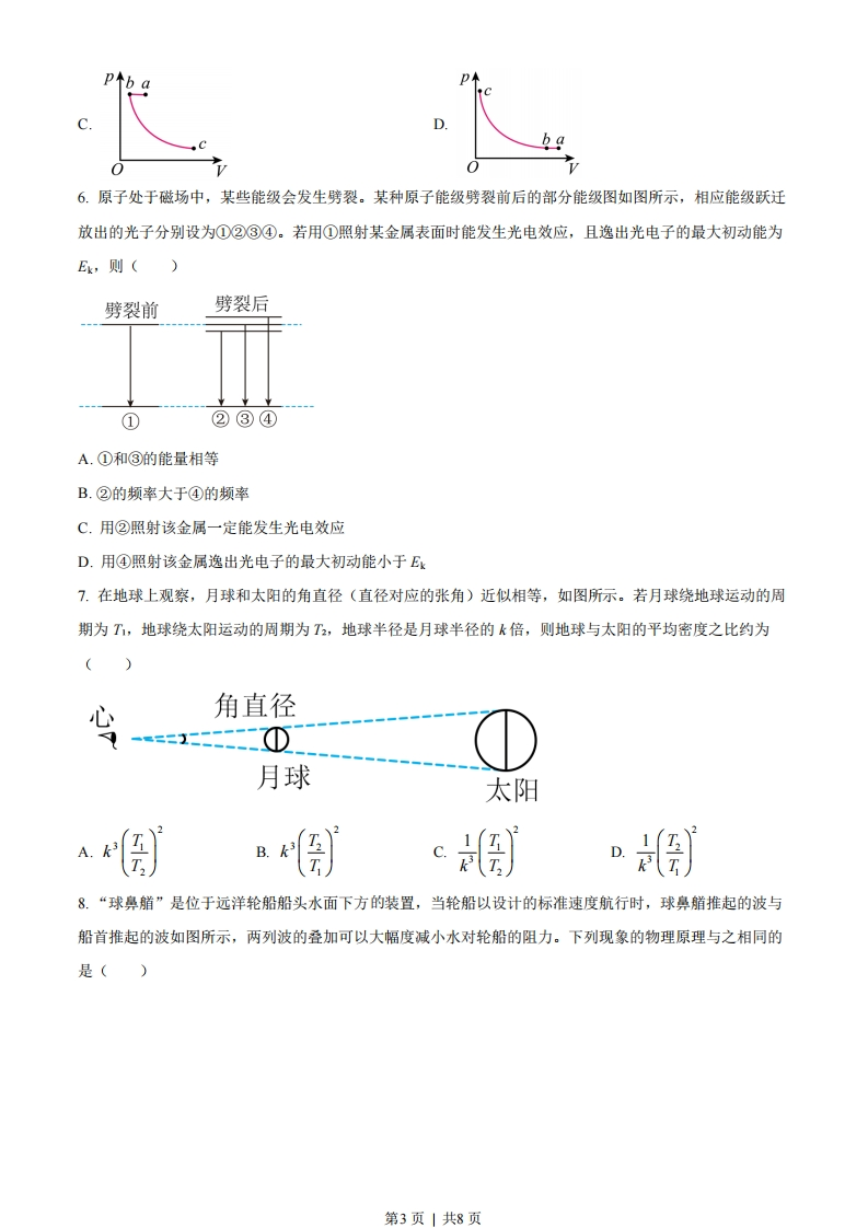 物理注意事项:1.答卷前,考生务必将自已的姓名、准考证号填写在答题卡上。2.答选择题时,选出每小题答案后,用铅笔把答题卡对应题目的答案标号涂黑。如需改动,用橡皮擦干净后,再选涂其他答案标号。答非选择题时,将答案写在答题卡上。写在本试卷上无效。3.考试结束后,将本试卷和答题卡一并交回。一、选择题:本题共10小题,共46分。在每小题给出的四个选项中,第17题只有一项符合题目要求,每小题4分;第8~10题有多项符合题目要求,每小题6分,全部选对的得6分,选对但不全的得3分,有选错的得0分。1.某同学在练习投篮,篮球在空中的运动轨迹如图中虚线所示,篮球所受合力F的示意图可能正确的是B2.安培通过实验研究,发现了电流之间相互作用力的规律。若两段长度分别为△和△,、电流大小分别为4和的平行直导线间距为:时,相互作用力的大小可以表示为△F=k2△△2。比例系数k的单位r2是()A.kg-m/(s2.A)B.kg.m/(s2.A2)C.kg.m2 (sA)D.kg-m2 (s3.A3)3.如图(a),从高处M点到地面N点有1、Ⅱ两条光滑轨道。两相同小物块甲、乙同时从M点由静止释放,沿不同轨道滑到N点,其速率v与时间1的关系如图(b)所示。由图可知,两物块在离开M点后、到达N点前的下滑过程中()第1页|共8页M乙甲77777777777777777W图(a)图b)A.甲沿I下滑且同一时刻甲的动能比乙的大B.甲沿下滑且同一时刻甲的动能比乙的小C.乙沿I下滑且乙的重力功率一直不变D.乙沿下滑且乙的重力功率一直增大4.如图,空间中存在水平向右的匀强磁场,一导体棒绕固定的竖直轴OP在磁场中匀速转动,且始终平行于OP。导体棒两端的电势差u随时间1变化的图像可能正确的是()◆B棒图(a)图b)肛j5.“空气充电宝”是一种通过压缩空气实现储能的装置,可在用电低谷时储存能量、用电高峰时释放能量。“空气充电宝”某个工作过程中,一定质量理想气体的p-T图像如图所示。该过程对应的pV图像可能是()第2页|共8页b aba6.原子处于磁场中,某些能级会发生劈裂。某种原子能级劈裂前后的部分能级图如图所示,相应能级跃迁放出的光子分别设为①②③④。若用①照射某金属表面时能发生光电效应,且逸出光电子的最大初动能为Ek,则()劈裂前劈裂后①②③④A.①和③的能量相等B.②的频率大于④的频率C.用②照射该金属一定能发生光电效应D.用④照射该金属逸出光电子的最大初动能小于Ek7.在地球上观察,月球和太阳的角直径(直径对应的张角)近似相等,如图所示。若月球绕地球运动的周期为T,地球绕太阳运动的周期为T,地球半径是月球半径的k倍,则地球与太阳的平均密度之比约为()心角直径①月球太阳c)8.“球鼻艏”是位于远洋轮船船头水面下方的装置,当轮船以设计的标准谏度航行时,球鼻艏推起的波与船首推起的波如图所示,两列波的叠加可以大幅度减小水对轮船的阻力。下列现象的物理原理与之相同的是()第3页|共8页