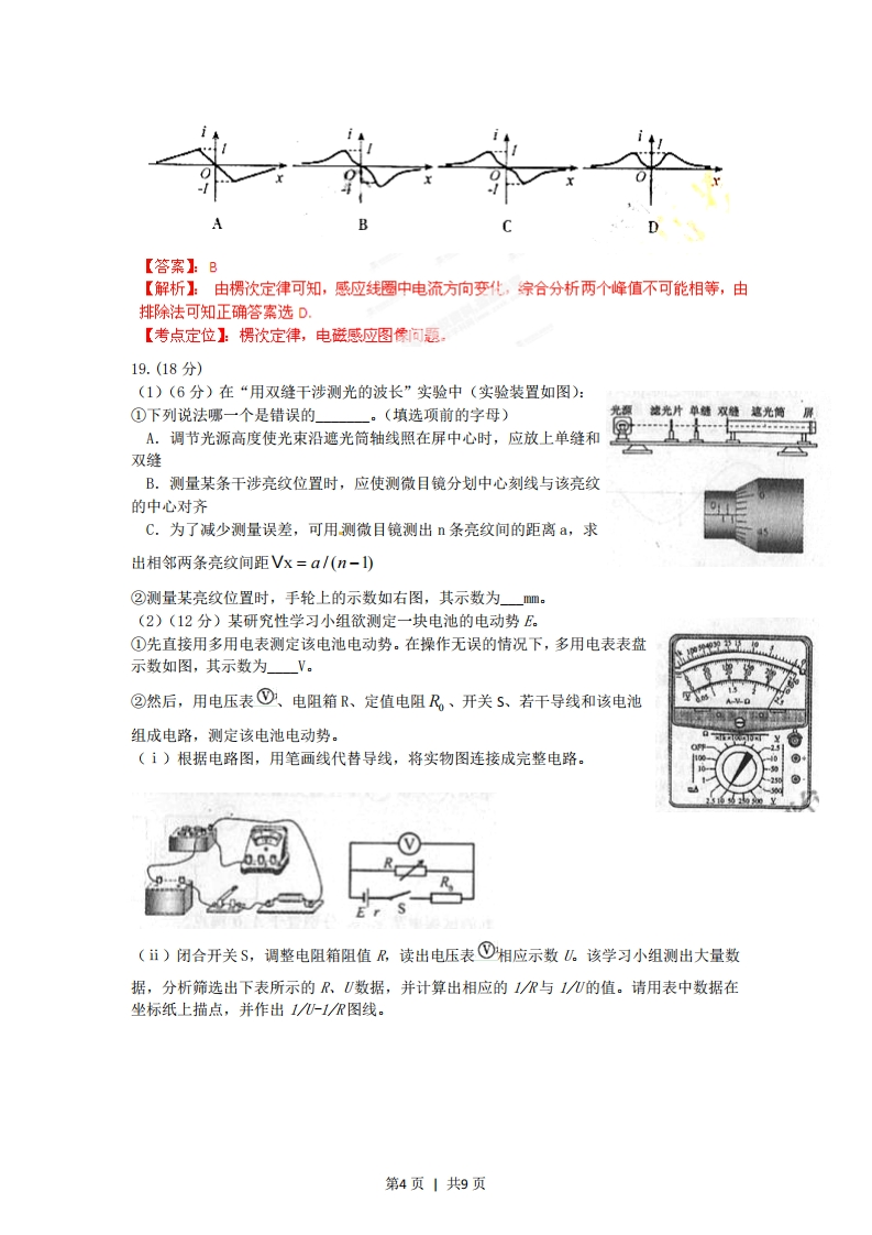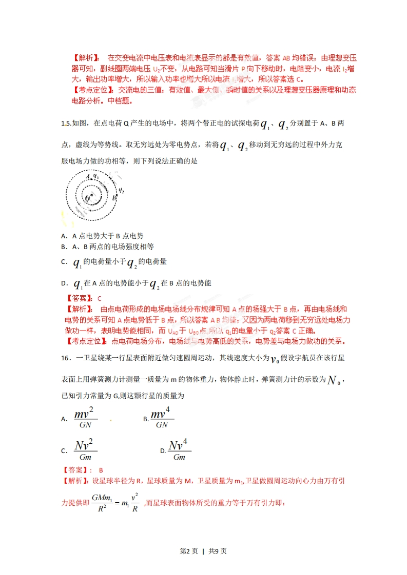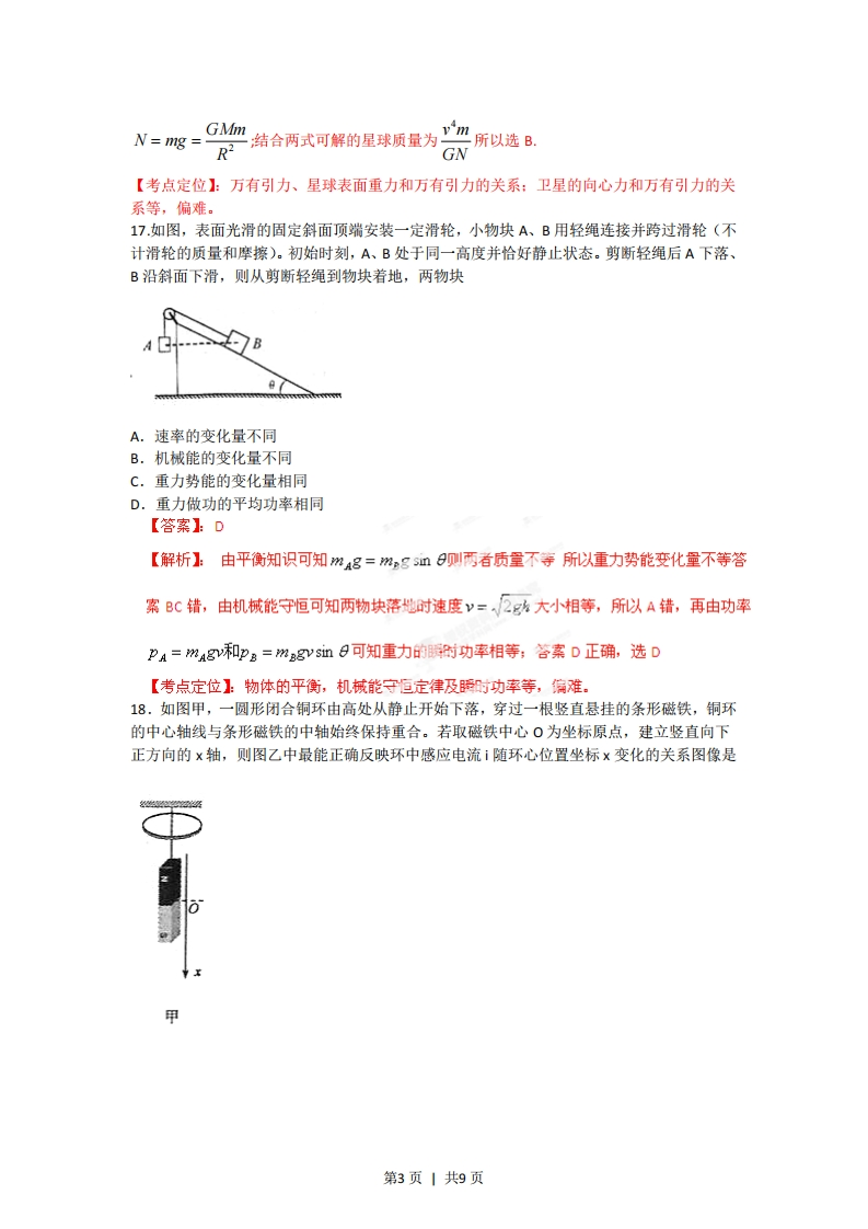 2012福建省高考理科综合物理部分解析【试卷总评】试题总体难易适度,具有了良好的区分度,发挥了选拔考试的功能,是一份不可多得的好试题,试题情景设置新,注重考查五种能力中的理解能力。13.一列简谐波沿x轴传播,t=0时刻的波形如图甲所示,此时质点P正沿y轴负方向运动,其振动图像如图乙所示,则该波的传播方向和波速分别是cm.cmA.沿x轴负方向,60m/sB.沿x轴正方向,60m/sC.沿x轴负方向,30m/sD.沿x轴正方向,30m/5【答案】A【解析】:从甲图的波动图像可知,质点P向y轴负方向运动说明波沿x轴负方向传播,从图中还可在波长为24m,周期为0.4秒,可得到波速为60m/s所以答案选A【考点定位】波动图像和振动图像,会读圈和处理波长、波速、周期三者的关系。较容易。此外整体试卷最上方需要添加【试卷总评1文字字数30-50字,简单描述即可。用红色表述。14.如图,理想变压器原线圈输入电压u=J,sin ot,副线圈电路中R。为定值电阻,R是滑动变阻器,和⑨是理想交流电压表,示数分别用J,和J,表示⊙和©是理想交流电流表,示数分别用I和I,表示。下列说法正确的是A.I,和I,表示电流的瞬间值B.U,和U,表示电压的最大值C.滑片P向下滑动过程中,J,不变、I,变大D.滑片P向下滑动过程中,U,变小、I,变小【答案】:C第1页1共9页【解析】在交变电流中电压表和电流表显示的都是有梵值,答案吧均错误;由理想变压器可知,副线圈两端电压U不变,从电路可知当滑片P向下移动时,电阻变小,电流增大,输出功率增大,所以输入功率也,增大所以电流帽大,所以答案选C【考点定位】交流电的三值:有效值、最大值、时值的关系以及理想变压器原理和动态电路分析。中档题。15.如图,在点电荷Q产生的电场中,将两个带正电的试探电荷q,、q,分别置于A、B两点,虚线为等势线。取无穷远处为零电势点,若将q,、9,移动到无穷远的过程中外力克服电场力做的功相等,则下列说法正确的是A.A点电势大于B点电势B.A、B两点的电场强度相等C.q,的电荷量小于q,的电荷量D.q,在A点的电势能小于q,在B点的电势能【答案1C【解析】:由点电荷形成的电场电场线分布规律可知A点的场强大于B点,再由电场线和电势的关系可知A点电势低于B点,所以答案AB均错:又因为两电荷移到无穷远处电场力做功一样,表明电势能相同,而U。于U点所以q:的电量小于q:答案C正确。【考点定位】点电荷电场分布,电场线与电势高低的关系,电势差与电场力做功的关系。16.一卫星绕某一行星表面附近做匀速圆周运动,其线速度大小为V。假设字航员在该行星表面上用弹簧测力计测量一质量为m的物体重力,物体静止时,弹簧测力计的示数为W。,己知引力常量为G,则这颗行星的质量为2A.mv&.2y9GNGNC.Nv2W4GmGm【答案】:B【解析】:设星球半径为R,星球质量为M,卫星质量为m卫星做圆周运动向心力由万有引力提供即GMmy=mh R2,而星球表面物体所受的重力等于万有引力即:第2页1共9页GMmN=mg=R2结合两式可解的星球质量为m所以选B.【考点定位】:万有引力、星球表面重力和万有引力的关系:卫星的向心力和万有引力的关系等,偏难。17.如图,表面光滑的固定斜面顶端安装一定滑轮,小物块A、B用轻绳连接并跨过滑轮(不计滑轮的质量和摩擦)。初始时刻,A、B处于同一高度并恰好静止状态。剪断轻绳后A下落、B沿斜面下滑,则从剪断轻绳到物块着地,两物块A.速率的变化量不同B.机械能的变化量不同C.重力势能的变化量相同D.重力做功的平均功率相同【答案1D【解析】由平衡知识可知悦4g=mgsm则两者质量不等所以重力势能变化量不等答案BC错,由机械能守恒可知两物块落她时速度v=2g大小相等,所以A错,再由功率PA=Ag和pB=?gvsin可知重力的时功率相等;答案D正确,选D【考点定位】物体的平衡,机械能守恒定律及照时功率等,偏难。18.如图甲,一圆形闭合铜环由高处从静止开始下落,穿过一根竖直悬挂的条形磁铁,铜环的中心轴线与条形磁铁的中轴始终保持重合。若取磁铁中心O为坐标原点,建立竖直向下正方向的x轴,则图乙中最能正确反映环中感应电流ⅰ随环心位置坐标x变化的关系图像是第3页1共9页