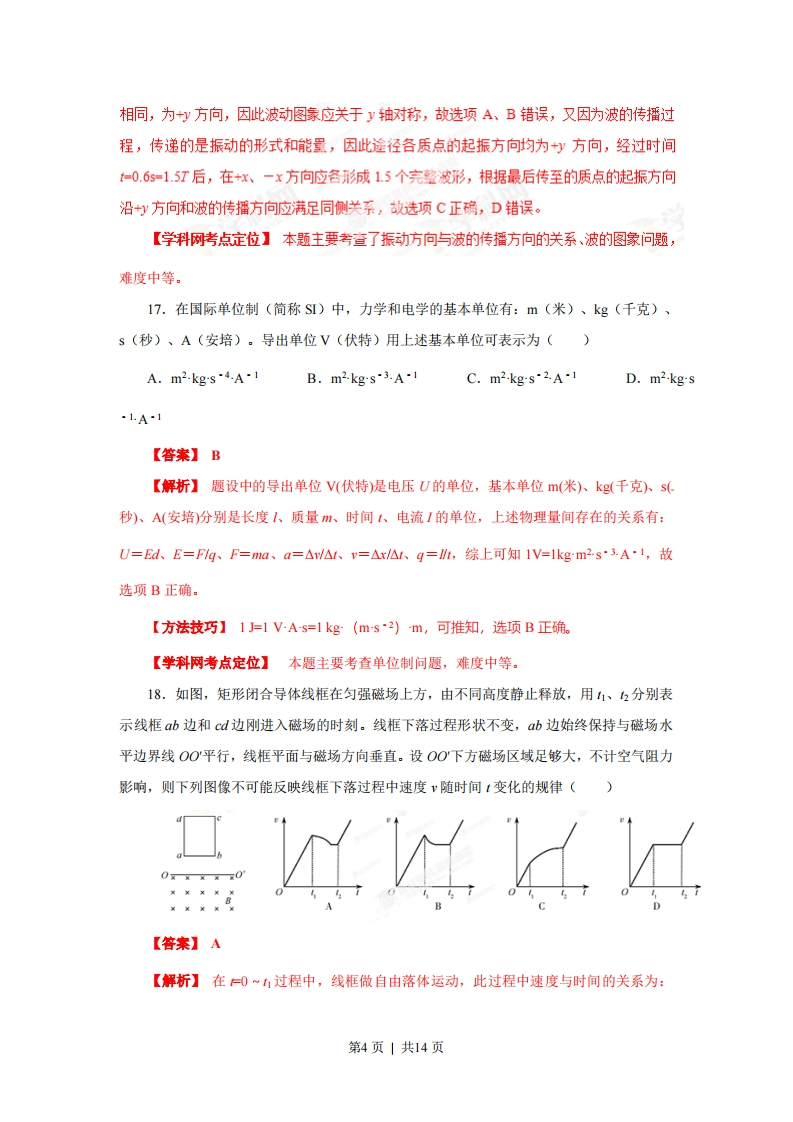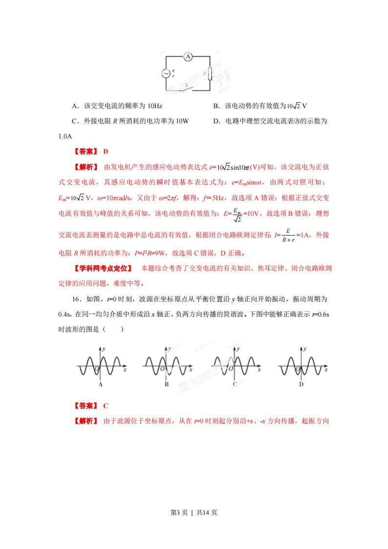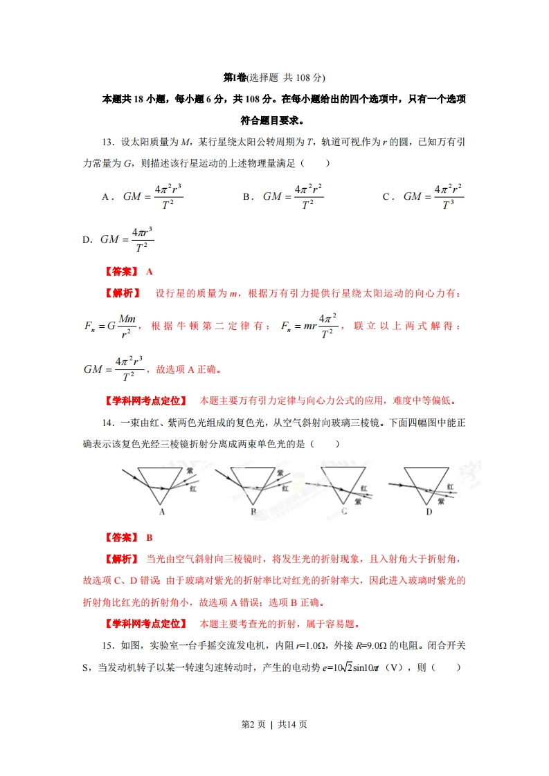 2013年全国普通高等学校统一招生考试试题(福建卷)理科综合能力测试(物理部分)【学科网试卷总评】今年的福建理综卷物理部分试题,首先,总体上来讲,紧密结合中学物理教学实际,各题的考查要求均能与新课程的教学相吻合,有效地实现人才的选拔,试卷风格特色鲜明,在坚持能力立意的基础上,注重联系实际,注重选材的多样性和公平性(选做题29、30难度相当),以基础知识、基本能力为考查重点,较好地体现了对学生物理科学素养的考查,特别是体现了高中新课程的探究性学习的理念和联系现实生活的理念,对中学物理教学起到了很好的导向作用。其次,选择题整体比较简单,第13、14题为送分题,15、16、17大部分学生能多正确求解;两道实验题,一道职白课本基本实验,一道由课本基本实验稍加变换,既能考查学生实验的掌握情况,又能考查学生的实验操作能力,如实物连线问题,整体难度也不大;计算题通过将设问以“一题多问、“难中有易”、“浅入深出”、“逐层递进方式呈现,既能保证大部分学生得到基本分数,又有利于高校选拔人才,整份试卷试题由易到难,结构合理,充分体现了对考生的人文关怀,有利于考生水平的循序渐进、正常发挥。从试卷试题考查的内容方面而言,涉及了高中物理各部分主干知识,覆盖面较较广,所考查的各知识点分数分配合理。其中所考知识点有必修1的质点的运动、1图象、国际单位制、牛顿运动定律、共点力平衡,必修2的曲线运动、平抛运动、圆周运动、天体运动、万有引力定律、动能定理(或机械能守恒定律),选修31的电场强度与电势差的关系、电场力做功、闭合电路欧姆定律、焦耳定律、带电粒子在磁场与复合场中的运动,选修32的电磁感应、交变电流,选修33的分子间作用力及分子势能与分子间距离的关系图象、波意耳定律,选修3-4的光的折射、波动图象,选修35的卢瑟福的α粒子散射实验、动量守恒定律:物理思想方法有整体法与隔离法、合成与分解法、临界法、图象法等等:实验部分有滑线变阻器的连接方式、串、并联关系、误差分析、数据处理等。从试卷试题考查能力方面而言,也是形式多样、层次性强,具体体现了《考试大纲》规定的各种能力。第14、15、221)、29、30等题考查了学生的理解能力,第13、16、17、21、222等题考查了学生的推理能力,第18、191)、20、223等题考查了学生的分析综合能力和应用数学处理问题的能力,第192等题考查了学生的知识迁移能力、解决实际问题能力和实验与探究能力,对中学物理教学有引导作用。本解析为学科网名师解析团队原创,授权学科网独家使用,如有盗用,依法追责!第1页|共14页第I卷(选择题共108分)本题共18小题,每小题6分,共108分。在每小题给出的四个选项中,只有一个选项符合题目要求。13.设太阳质量为M,某行星绕太阳公转周期为T,轨道可视作为r的圆,己知万有引力常量为G,则描述该行星运动的上述物理量满足()A.GM=4π2r372B.GM=4n2r24π22T2C.GM=73D.GM=473T2【答案】A【解析】设行星的质量为m,根据万有引力提供行星绕太阳运动的向心力有:F,=G Mm,根据牛顿第二定律有:Fn=mr4π2户,联立以上两式解得:GM=4rT2一,故选项A正确。【学科网考点定位】本题主要万有引力定律与向心力公式的应用,难度中等偏低。14.一束由红、紫两色光组成的复色光,从空气斜射向玻璃三棱镜。下面四幅图中能正确表示该复色光经三棱镜折射分离成两束单色光的是()【答案】B【解析】当光由空气斜射向三棱镜时,将发生光的折射现象,且入射角大于折射角,故选项C、D错误由于玻璃对紫光的折射率比对红光的折射率大,因此进入玻璃时紫光的折射角比红光的折射角小,故选项A错误:选项B正确。【学科网考点定位】本题主要考查光的折射,属于容易题。15.如图,实验室一台手摇交流发电机,内阻=1.02,外接R=9.02的电阻。闭合开关S,当发动机转子以某一转速匀速转动时,产生的电动势e=10W2sinl0m(V),则()第2页|共14页A.该交变电流的频率为10HzB.该电动势的有效值为10√5VC.外接电阻R所消耗的电功率为10WD.电路中理想交流电流表④的示数为1.0A【答案】D【解析】由发电机产生的感应电动势表达式e=10W互si10a(V)可知,该交流电为正弦式交变电流,其感应电动势的瞬时值基本表达式为:e=Easinot,由两式对照可知:Em=10W2V,o=l0rads,又由于a=2,解得:f=5Hz,故选项A错误:根据正弦式交变电流有效值与峰值的关系可知,该电动势的有效值为:E=E黑=0V,故选项B错误:理想2交流电流表测量的是电路中总电流的有效值,根据闭合电路欧姆定律有=。£-1A,外接R+r电阻R所消耗的功率为:P=PR=9W,故选项C错误,D正确。【学科网考点定位】本题综合考查了交变电流的有关知识、焦耳定律、闭合电路欧姆定律的应用问题,难度中等。16.如图,=0时刻,波源在坐标原点从平衡位置沿y轴正向开始振动,振动周期为0.4s,在同一均匀介质中形成沿x轴正、负两方向传播的简谐波。下图中能够正确表示=0.6s时波形的图是()快【答案】C【解析】由于波源位于坐标原点,从在0时刻起分别沿+x、x方向传播,起振方向第3页|共14页