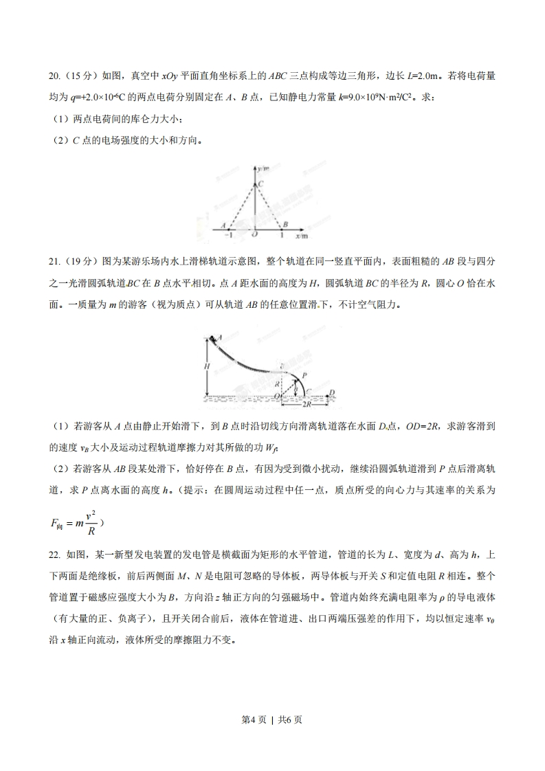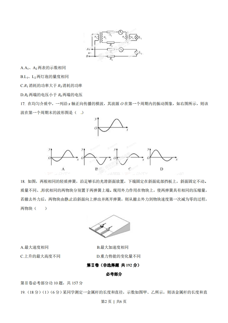2014年高考福建卷理科综合(物理部分)第I卷一、在每小题给出的四个选项中,只有一个选项符合题目要求13.如图,一束光由空气射向半圆柱体玻璃砖,0点为该玻璃砖截面的圆心,下图能正确描述其光路图的是()14.若有一颗“宜居”行星,其质量为地球的p倍,半径为地球的g倍,则该行星卫星的环绕速度是地球卫星环绕速度的()A.Vpg倍卫倍D.√pg3倍15.如右图,滑块以初速度%沿表面粗糙且足够长的固定斜面,从顶端下滑,直至速度为零。对于该运动过程,若用h、s、v、a分别表示滑块的下降高度、位移、速度和加速度的大小,t表示时间,则下列图象最能正确描述这一运动规律的是()16.图为模拟远距离输电实验电路图,两理想变压器的匝数n=42R,忽略灯丝电阻随温度的变化。当A、B端接入低压交流电源时()第1页|共6页A.A1、A2两表的示数相同B.L1、L2两灯泡的量度相同C.R1消耗的功率大于R3消耗的功率D.R两端的电压小于R两端的电压17.在均匀介质中,一列沿x轴正向传播的横波,其波源O在第一个周期内的振动图象,如右图所示,则该波在第一个周期末的波形图是()A18.如图,两根相同的轻质弹簧,沿足够长的光滑斜面放置,下端固定在斜面底部挡板上,斜面固定不动。质量不同、形状相同的两物块分别置于两弹簧上端。现用外力作用在物块上,使两弹簧具有相同的压缩量,若撤去外力后,两物块由静止沿斜面向上弹出并离开弹簧,则从撤去外力到物块速度第一次减为零的过程,两物块()A最大速度相同B.最大加速度相同C.上升的最大高度不同D.重力势能的变化量不同第Ⅱ卷(非选择题共192分)必考部分第Ⅱ卷必考部分功10题,共157分19.(18分)(1)(6分)某同学测定一金属杆的长度和直径,示数如图甲、乙所示,则该金属杆的长度和直第2页|共6页径分别为cm和mm0 cm(2)(12分)某研究性学习小组利用伏安法测定某一电池组的电动势和内阻,实验原理如图甲所示,其中,虚线框内为用灵敏电流计G改装的电流表A,V为标准电压表,E为待测电池组,S为开关,R为滑动变阻器,Ro是标称值为4.02的定值电阻。①已知灵敏电流计G的满偏电流I=100μA、内阻r2.0k2,若要改装后的电流表满偏电流为200mA,应并联一只Q(保留一位小数)的定值电阻R:②根据图甲,用笔画线代替导线将图乙连接成完整电路:电流表③某次试验的数据如下表所示:该小组借鉴“研究匀变速直线运动”试验中计算加速度的方法(逐差法),计算出电池组的内阻=Ω(保留两位小数):为减小偶然误差,逐差法在数据处理方面体现出的主要优点是④该小组在前面实验的基础上,为探究图甲电路中各元器件的识记阻值对测量结果的影响,用一己知电动势和内阻的标准电池组通过上述方法多次测量后发现:电动势的测量值与己知值几乎相同,但内阻的测量值总是偏大。若测量过程无误,则内阻测量值总是偏大的原因是。(填选项前的字母)A.电压表内阻的影响B滑动变阻器的最大阻值偏小CR的识记阻值比计算值偏小D.R的识记阻值比标称值偏大测量次数123568电压表V读数UW5.265.165.044.944.834.714.594.46160改装表A读数ImA20406080100120140第3页|共6页
