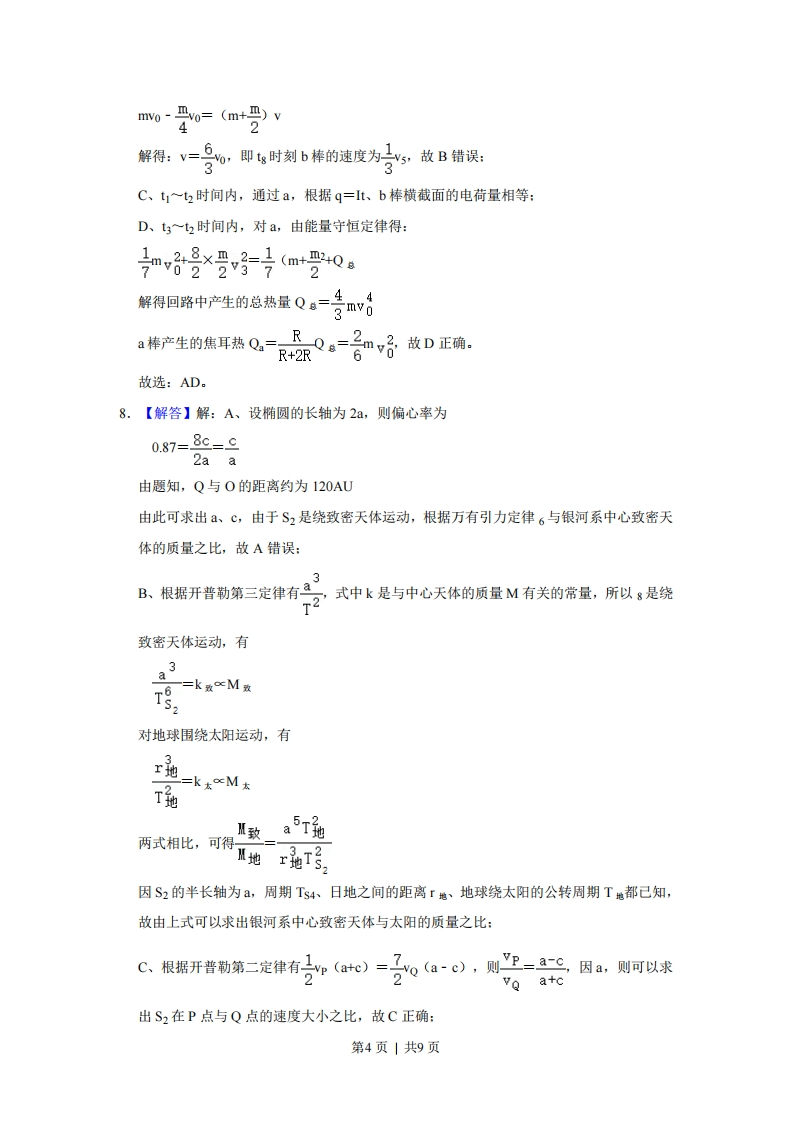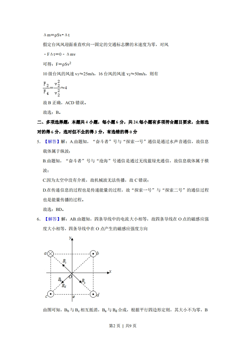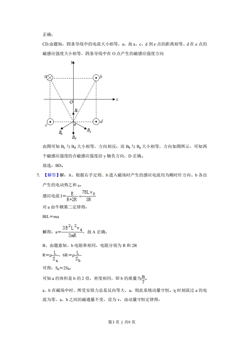 2021年福建省新高考物理试卷◆考答案与试题解折一、单项选择题:本题共4小愿,每小题4分,共16分。在每小题给出的四个选项中,只有一项是符合题目要求的。1.【解答】解:A、位移指的是从M点漂流到N点的有向线段,故A错误:B、从M点漂流到N点的路程为5,4km,则平均速率为7率是1_三3.4,故B错误:。、该游客的平均速度大小为产22放C正确:D、以玉女峰为参考系,若以所乘竹筏为参考系,故D错误:故选:C。2.【解答】解:质子(1H)以速度V5自0点沿中轴线射入,恰沿中轴线做匀速直线运动,满足:qVoB=qE解特w号即质子的速度满足速度选择器的条件:A以速度3射入的正电子(?,所受的洛伦兹力小于电场力,故A错误:2B.以速度Vo射入的电子(8e),而做匀速直线运动,故B正确:CD,以速度2vo射入的氘核(细)o射入的a粒子(He)0=故都不能做匀速直线运B动:故选:B。3.【解答】解:不考虑变压器的输入电压随负载变化,即变压器原线圈的输入电压U1=Uv1不变,根据:1n1可知2=2不变:当住户使用的用电器增加时变小,由16R+R打02可U2 n4知2=A7变大,而由,Uv3=U2-IR可知V3减小:由理想变压器的原理U1h=U22,可知原线圈的电流Ig=IA1变大:故综合上述分析可知A,增大,A7增大,V2不变,V3减小:故ABC错误。故选:D。4.【解答】解:设空气的密度为P,风迎面垂直吹向一固定的交通标志牌的横截面积为S第1页|共9页△m=pSv·△t假定台风风迎面垂直吹向一固定的交通标志牌的末速度为零,对风-F△t=0-△my可得:F=pSv210级台风的风速v7≈25m/s,16台风的风速v2≈50m/s,则有2-吃A吃故B正确,ACD错误。故选:B。二、多项选择恩:本题共4小愿,每小恩6分,共24.每小题有多项符合愿目要求,全部选对的得6分,选对但不全的得3分,有选错的得0分5.【解答】解:A.由题知,“奋斗者”号与“探索一号”通信是通过水声音通信,故信息载体属于纵波:B.由题知,“奋斗者”号与“沧海”号通信是通过无线蓝绿光通信,故信息载体属于横波:C因为太空中没有介质,故机械波无法传播,故C错误:D.在传递信息的过程也是传递能量的过程,故“探索一号”与“探索二号”的通信过程也是能量传播的过程。故选:BD。6.【解答】解:AB.由题知,四条导线中的电流大小相等,故四条导线在O点的磁感应强度大小相等,四条导线中在0点产生的磁感应强度方向B由图可知,Bb与Be相互抵消,Ba与B:合成,根据平行四边形定则,其大小不为零,B第2页|共9页正确:CD.由题知,四条导线中的电流大小相等,a,故a,c、d到e点的距离相等、d在e点的磁感应强度大小相等,四条导线中在O点产生的磁感应强度方向XdB.Ba由图可知B。与B:大小相等,方向相反:而B与Ba大小相等,方向如图所示,可知两个磁感应强度的合磁感应强度沿y轴负方向,D正确。故选:BD。7.【解答】解:A、根据右手定则、b进入磁场时产生的感应电流均为顺时针方向、b各自产生的电动势之和0感应电流I=E7BLV0R+2R3R对a由牛顿第二定律得:BIL=ma解得:a362L204故A正确:3mRB、由题意知、b电阻率相同,电阻分别为R和2R6R=L可得:Sa=2Sb,可知a的体积是b的2倍,密度相同,即b的质量为皿a、b在磁场中时,所受安培力总是反向等大,a,则此系统动量守恒。2时刻流过a的电流为零,a、b之间的磁通量不变,设为v,由动量守恒定律得:第3页|共9页