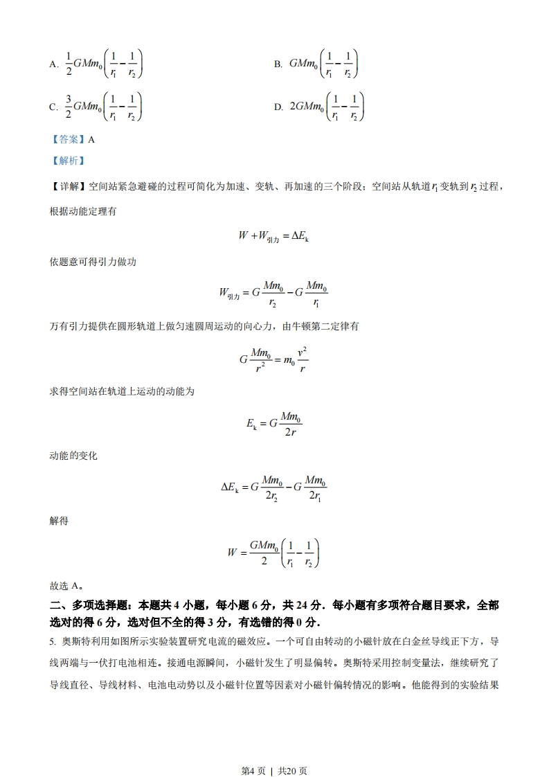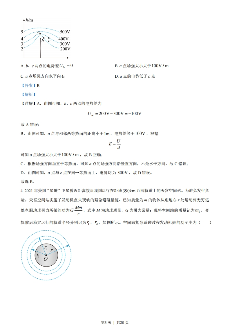 物理试卷一、单项选择题:本题共4小题,每小题4分,共16分.在每小题给出的四个选项中,只有一项是符合题目要求的.1.福建土楼兼具居住和防御的功能,承启楼是圆形土楼的典型代表,如图()所示。承启楼外楼共四层,各楼层高度如图(b)所示。同一楼层内部通过直径约50m的圆形廊道连接。若将质量为10Okg的防御物资先从二楼仓库搬到四楼楼梯口M处,再用1OOs沿廊道运送到N处,如图(c)所示。重力加速度大小取10m/s2,则()四楼2.7m三楼2.7m0001001可二楼2.7m楼3.4m(a)承启楼(b)剖面图50m(c)四楼平面图A.该物资从二楼地面被运送到四楼M处的过程中,克服重力所做的功为5400JB.该物资从M处被运送到N处的过程中,克服重力所做的功为78500JC.从M处沿圆形廊道运动到N处,位移大小为78.5mD.从M处沿圆形廊道运动到N处,平均速率为0.5m/s【答案】A【解析】【详解】A.该物资从二楼地面被运送到四楼M处的过程中,克服重力所做的功为W。=1g△h=100×10×(2.7+2.7)J=5400J故A正确:第1页」共20页B.该物资从M处被运送到N处的过程中,由于M、N高度差为零,所以克服重力做功为零,故B错误:C.从M处沿圆形廊道运动到N处,位移大小为50m,故C错误:D.从M处沿圆形廊道运动到N处,平均速率为=5=3.14x50tt100m/s=0.785m/s故D错误。故选A。2.2011年3月,日本发生的大地震造成了福岛核电站核泄漏。在泄露的污染物中含有大量放射性元素1,其衰变方程为1→Xe+9e,半衰期为8天,己知m=131.03721u,mxe=131.03186u,m。=0.000549u,则下列说法正确的是()A.衰变产生的B射线来自于3I原子的核外电子B.该反应前后质量亏损0.00535uC.放射性元素gI发生的衰变为a衰变D.经过16天,75%的1原子核发生了衰变【答案】D【解析】【详解】A.I衰变时,原子核内中子转化为质子和电子,大量电子从原子核释放出来形成B射线,故A错误:B.该反应前后质量亏损为△m=m-mxe-m。=131.03721u-131.03186u-0.000549u=0.004801u故B错误:C,放射性元素I发生的衰变为B衰变,故C错误:D.由于半衰期为8天,可知经过16天,即经过两个半衰期,75%的I原子核发生了衰变,故D正确。故选D。3.平时我们所处的地球表面,实际上存在场强大小为100V/m的电场,可将其视为匀强电场,在地面立一金属杆后空间中的等势面如图所示。空间中存在a、b、c三点,其中a点位于金属杆正上方,b、c等高。则下列说法正确的是()第2页共20页↑h/m5“。.500V、C400V3300V2200VA.b、c两点的电势差Uc=0B.a点场强大小大于100V/mC.a点场强方向水平向右D.a点的电势低于c点【答案】B【解析】【详解】A.由图可知,b、c两点的电势差为Uk=200V-300V=-100V故A错误:B.由图可知,a点与相邻两等势面的距离小于1m,电势差等于I00V,根据E-dU可知a点场强大小大于100V/m,故B正确:C.根据场强方向垂直于等势面,可知点的场强方向沿竖直方向,不是水平方向,故C错误:D.由图可知,a点与c点在同一等势面上,电势均为300V,故D错误。故选B。4.2021年美国“星链”卫星曾近距离接近我国运行在距地390m近圆轨道上的天宫空间站。为避免发生危险,天宫空间站实施了发动机点火变轨的紧急避碰措施。己知质量为m的物体从距地心”处运动到无穷远处克服地球引力所做的功为GM,式中M为地球质量,G为引力常量:现将空间站的质量记为m。,变轨前后稳定运行的轨道半径分别记为上、?,如图所示。空间站紧急避碰过程发动机做的功至少为()第3页|共20页