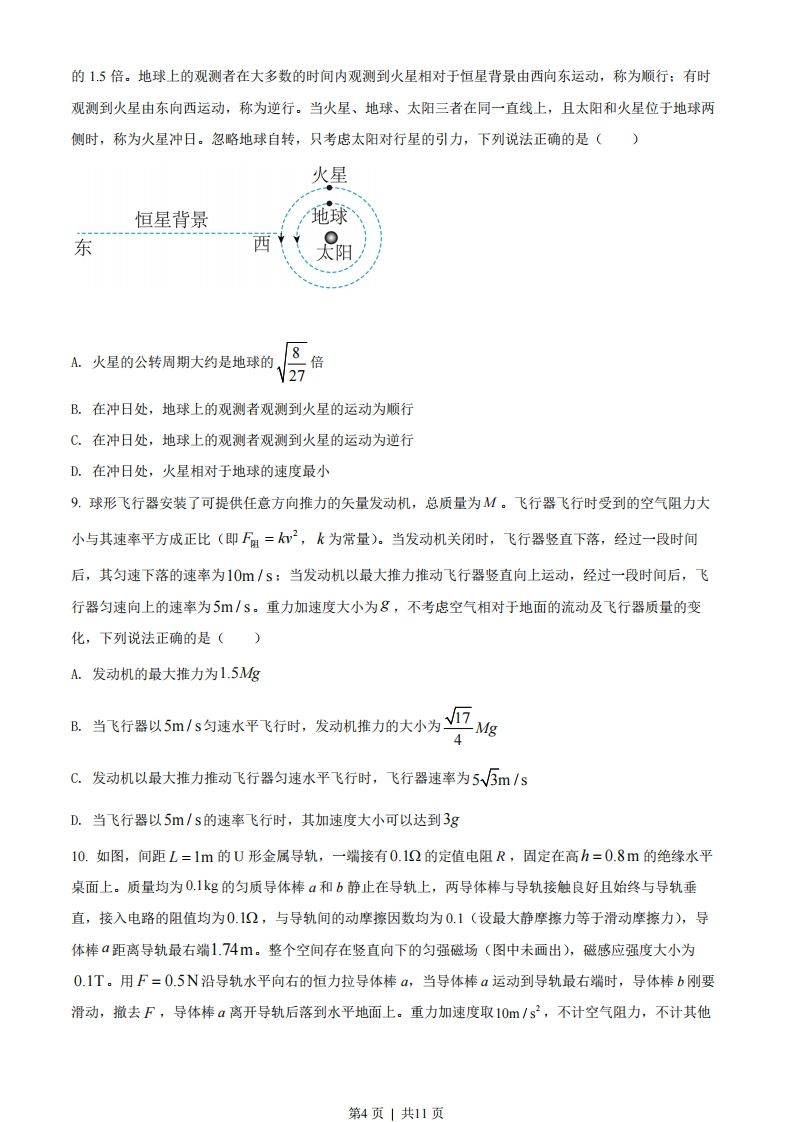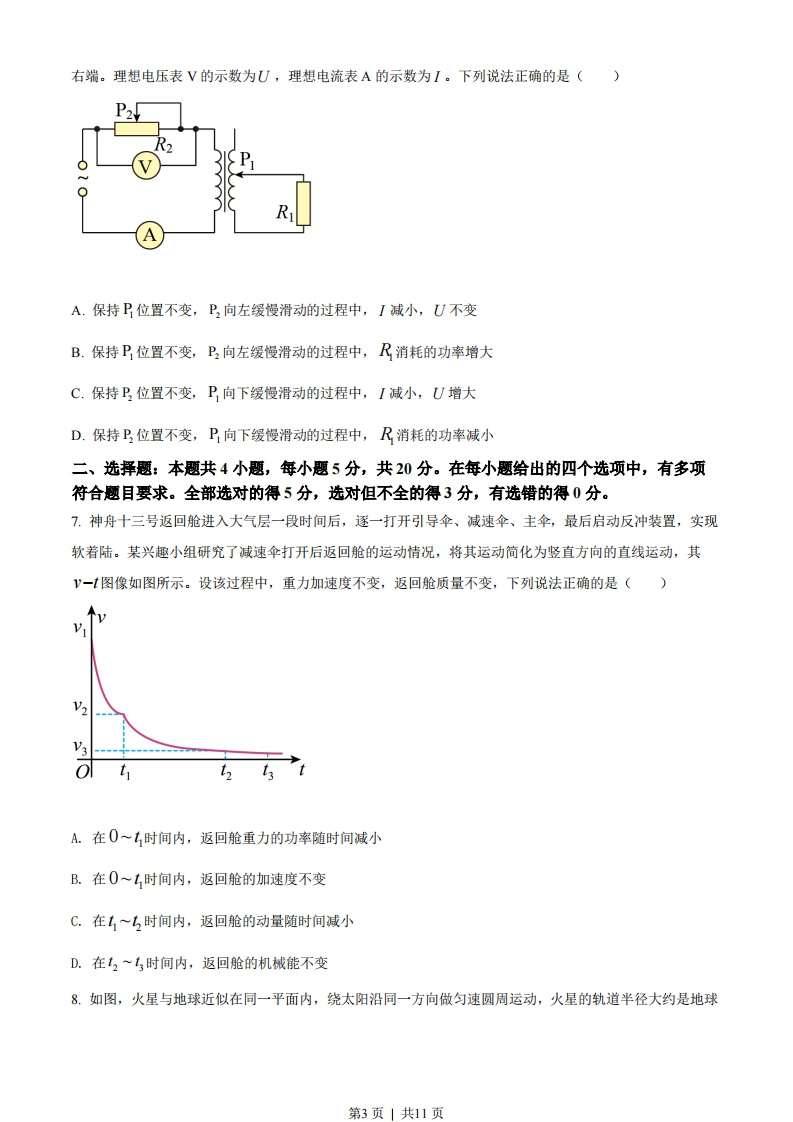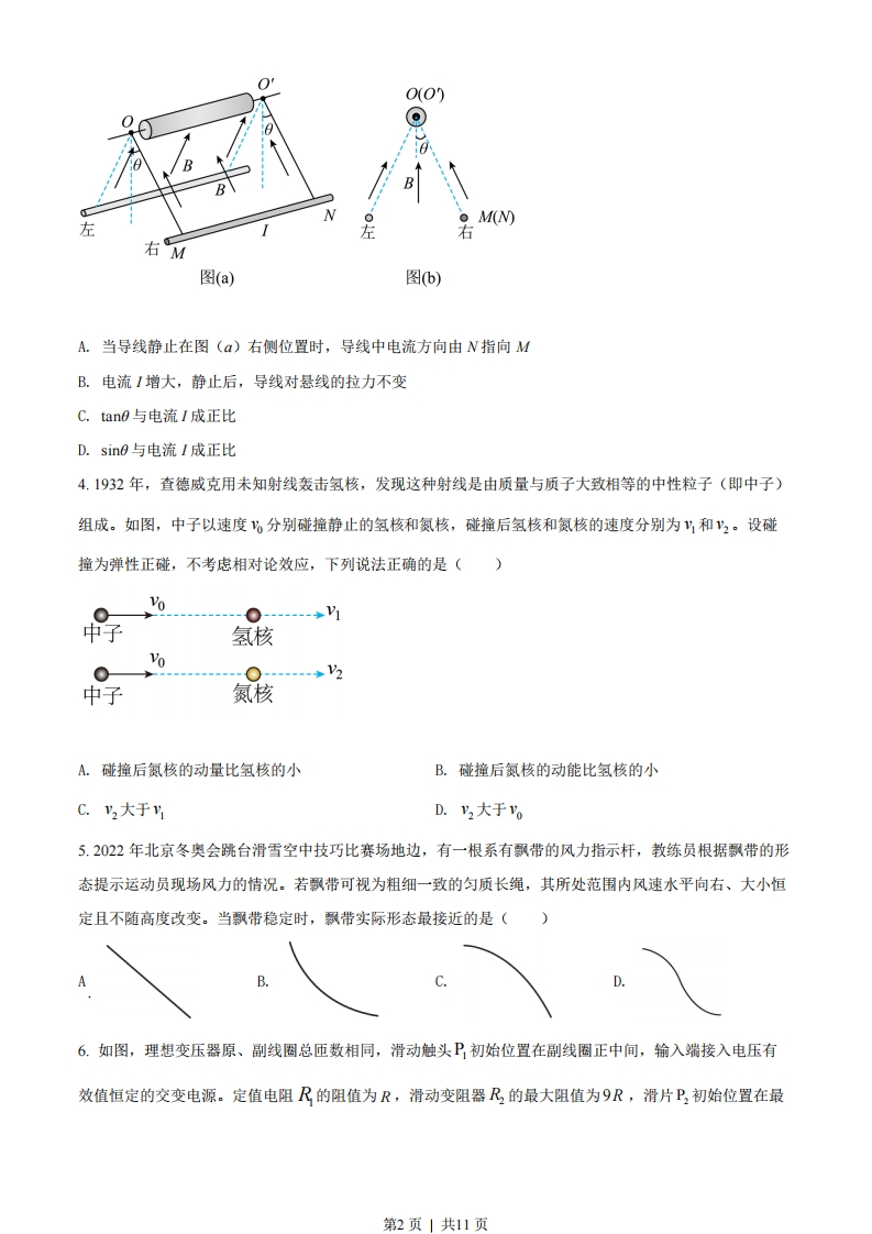 湖南省2022年普通高中学业水平选择性考试物理注意事项:1.答卷前,考生务必将自己的姓名、准考证号填写在本试卷和答题卡上。2,回答选择题时,选出每小题答案后,用铅笔把答题卡上对应题目的答案标号涂黑。如需改动,用橡皮擦干净后,再选涂其他答案标号。回答非选择题时,将答案写在答题卡上。写在本试卷上无效。3.考试结束后,将本试卷和答题卡一并交回。一、选释题:本题共6小题,每小题4分,共24分。在每小题给出的四个选项中,只有一项是符合题目要求的。1.关于原子结构和微观粒子波粒二象性,下列说法正确的是()A.卢瑟福的核式结构模型解释了原子光谱的分立特征B.玻尔的原子理论完全揭示了微观粒子运动的规律C.光电效应揭示了光的粒子性D.电子束穿过铝箔后的衍射图样揭示了电子的粒子性2.如图,四根完全相同的均匀带正电绝缘长棒对称放置在长方体的四条长边a、b、c、d上。移去a处的绝缘棒,假定另外三根绝缘棒电荷分布不变。关于长方体几何中心O点处电场强度方向和电势的变化,下列说法正确的是()Q6A.电场强度方向垂直指向a,电势减小B.电场强度方向垂直指向c,电势减小C.电场强度方向垂直指向a,电势增大D.电场强度方向垂直指向c,电势增大3.如图(a),直导线MW被两等长且平行的绝缘轻绳悬挂于水平轴OO'上,其所在区域存在方向垂直指向OO的磁场,与OO距离相等位置的磁感应强度大小相等且不随时间变化,其截面图如图(b)所示。导线通以电流,静止后,悬线偏离竖直方向的夹角为O。下列说法正确的是()第1页」共11页O00)(®B左是MW)右右M图(a)图(b)A.当导线静止在图(a)右侧位置时,导线中电流方向由N指向MB.电流I增大,静止后,导线对悬线的拉力不变C.tan0与电流I成正比D.sinO与电流I成正比4.1932年,查德威克用未知射线轰击氢核,发现这种射线是由质量与质子大致相等的中性粒子(即中子)组成。如图,中子以速度%分别碰撞静止的氢核和氮核,碰撞后氢核和氮核的速度分别为?和2。设碰撞为弹性正碰,不考虑相对论效应,下列说法正确的是()中子氢核o0---0--+2中子氮核A.碰撞后氮核的动量比氢核的小B.碰撞后氮核的动能比氢核的小C.2大于D.2大于Vo5.2022年北京冬奥会跳台滑雪空中技巧比赛场地边,有一根系有飘带的风力指示杆,教练员根据飘带的形态提示运动员现场风力的情况。若飘带可视为粗细一致的匀质长绳,其所处范围内风速水平向右、大小恒定且不随高度改变。当飘带稳定时,飘带实际形态最接近的是(6.如图,理想变压器原、副线圈总匝数相同,滑动触头P初始位置在副线圈正中间,输入端接入电压有效值恒定的交变电源。定值电阻R的阻值为R,滑动变阻器飞的最大阻值为9R,滑片P,初始位置在最第2页共11页右端。理想电压表V的示数为U,理想电流表A的示数为I。下列说法正确的是()A.保持P位置不变,P,向左缓慢滑动的过程中,I减小,U不变B.保持P位置不变,P,向左缓慢滑动的过程中,R消耗的功率增大C.保持P位置不变,P向下缓慢滑动的过程中,I减小,U增大D.保持P位置不变,P向下缓慢滑动的过程中,R消耗的功率减小二、选择题:本题共4小题,每小题5分,共20分。在每小题给出的四个选项中,有多项符合题目要求。全部选对的得5分,选对但不全的得3分,有选错的得0分。7.神舟十三号返回舱进入大气层一段时间后,逐一打开引导伞、减速伞、主伞,最后启动反冲装置,实现软着陆。某兴趣小组研究了减速伞打开后返回舱的运动情况,将其运动简化为竖直方向的直线运动,其V一图像如图所示。设该过程中,重力加速度不变,返回舱质量不变,下列说法正确的是()V3t2A.在O~1时间内,返回舱重力的功率随时间减小B.在O~t时间内,返回舱的加速度不变C.在1~古时间内,返回舱的动量随时间减小D.在12~4时间内,返回舱的机械能不变8.如图,火星与地球近似在同一平面内,绕太阳沿同一方向做匀速圆周运动,火星的轨道半径大约是地球第3页」共11页