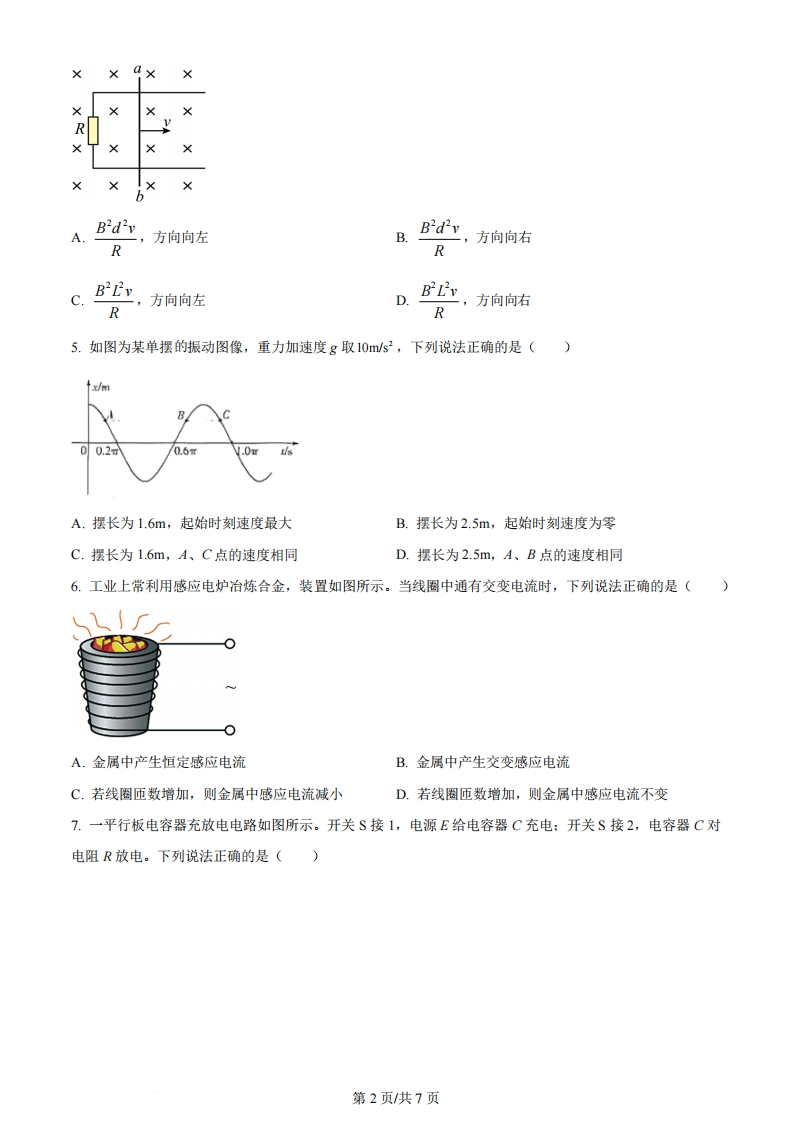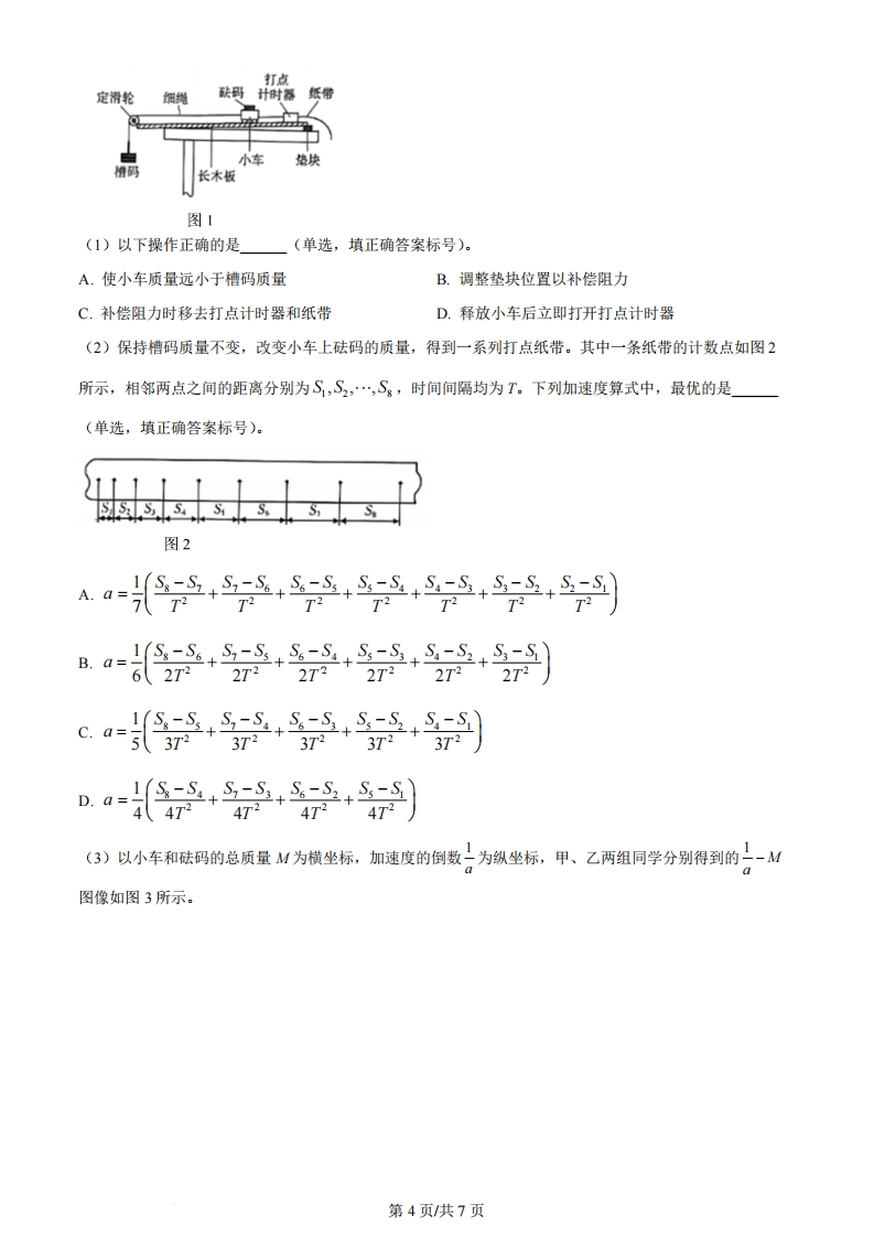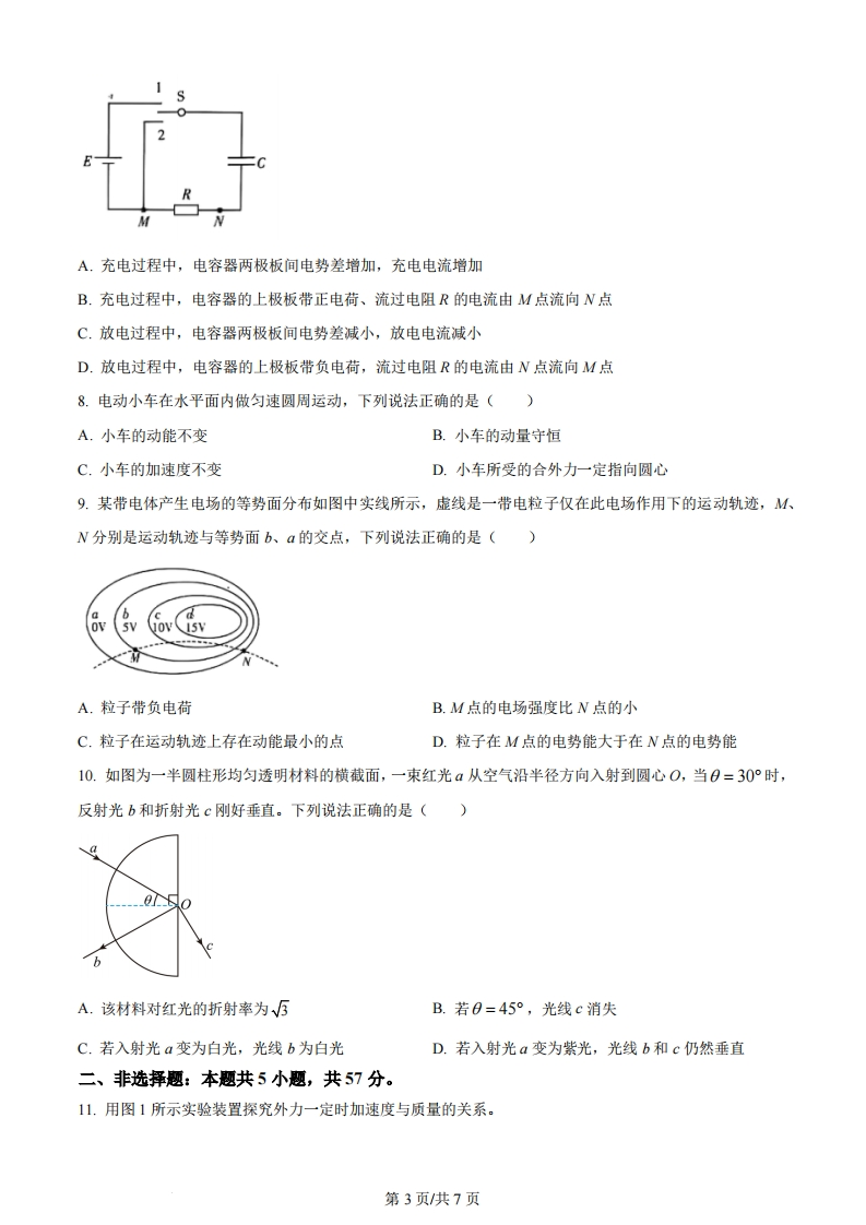 机密★启用前2024年甘肃省普通高校招生统一考试物理注意事项:1.答卷前,考生务必将自己的姓名、准考证号填写在答题卡上2.回答选择题时,选出每小题答案后,用2B铅笔把答题卡上对应题目的答案标号框涂黑。如需改动、用橡皮擦干净后,再选涂其它答案标号框。回答非选择题时,将答案写在答题卡上。写在本试卷上无效。3考试结束后,将本试卷和答题卡一并交回。一、选择题:本题共10小题,共43分。在每小题给出的四个选项中,第1~7题只有一项符合题目要求,每小题4分;第8~10题有多项符合题目要求,每小题5分,全部选对的得5分,选对但不全的得3分,有选错的得0分。1.2024年2月,我国科学家在兰州重离子加速器国家大科学装置上成功合成了新核素增05,核反应方程如下.gCd+器Ni→%Os+4X该方程中X是()A.质子B.中子C.电子D.a粒子2.小明测得兰州地铁一号线列车从“东方红广场”到“兰州大学”站的v一1图像如图所示,此两站间的距离约为()↑W(m's)2257494东方红广场兰州大学A980mB.1230mC.1430mD.1880m3.小杰想在离地表一定高度的天宫实验室内,通过测量以下物理量得到天宫实验室轨道处的重力加速度,可行的是()A.用弹簧秤测出己知质量的砝码所受的重力B.测量单摆摆线长度、摆球半径以及摆动周期C.从高处释放一个重物、测量其下落高度和时间D.测量天宫实验室绕地球做匀速圆周运动的周期和轨道半径4.如图,相距为的固定平行光滑金属导轨与阻值为R的电阻相连,处在磁感应强度大小为B、方向垂直纸面向里的匀强磁场中长度为L的导体棒ab沿导轨向右做匀速直线运动,速度大小为v。则导体棒ab所受的安培力为()第1页共7页B'd'v,方向向左BRB2dy,方向向右RB2LvBLy,方向向左,方向向右RR5.如图为某单摆的振动图像,重力加速度g取10ms2,下列说法正确的是()tx/mB00.20.61.0msA.摆长为1.6m,起始时刻速度最大B.摆长为2.5m,起始时刻速度为零C.摆长为1.6m,A、C点的速度相同D.摆长为2.5m,A、B点的速度相同6.工业上常利用感应电炉治炼合金,装置如图所示。当线圈中通有交变电流时,下列说法正确的是()0A.金属中产生恒定感应电流B.金属中产生交变感应电流C.若线圈匝数增加,则金属中感应电流减小D.若线圈匝数增加,则金属中感应电流不变7.一平行板电容器充放电电路如图所示。开关S接1,电源E给电容器C充电:开关S接2,电容器C对电阻R放电。下列说法正确的是()第2页/共7页A.充电过程中,电容器两极板间电势差增加,充电电流增加B.充电过程中,电容器的上极板带正电荷、流过电阻R的电流由M点流向N点C.放电过程中,电容器两极板间电势差减小,放电电流减小D.放电过程中,电容器的上极板带负电荷,流过电阻R的电流由N点流向M点8.电动小车在水平面内做匀速圆周运动,下列说法正确的是()A.小车的动能不变B.小车的动量守恒C.小车的加速度不变D.小车所受的合外力一定指向圆心9.某带电体产生电场的等势面分布如图中实线所示,虚线是一带电粒子仅在此电场作用下的运动轨迹,M、N分别是运动轨迹与等势面b、a的交点,下列说法正确的是()5VA.粒子带负电荷B.M点的电场强度比N点的小C.粒子在运动轨迹上存在动能最小的点D.粒子在M点的电势能大于在N点的电势能10.如图为一半圆柱形均匀透明材料的横截面,一束红光a从空气沿半径方向入射到圆心O,当0=30°时,反射光b和折射光c刚好垂直。下列说法正确的是()A.该材料对红光的折射率为√5B.若0=45°,光线c消失C.若入射光a变为白光,光线b为白光D.若入射光a变为紫光,光线b和c仍然垂直二、非选择题:本题共5小题,共57分。11.用图1所示实验装置探究外力一定时加速度与质量的关系。第3页共7页