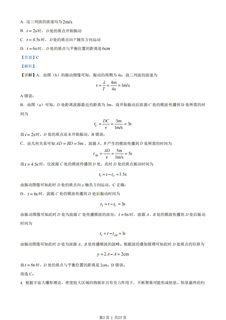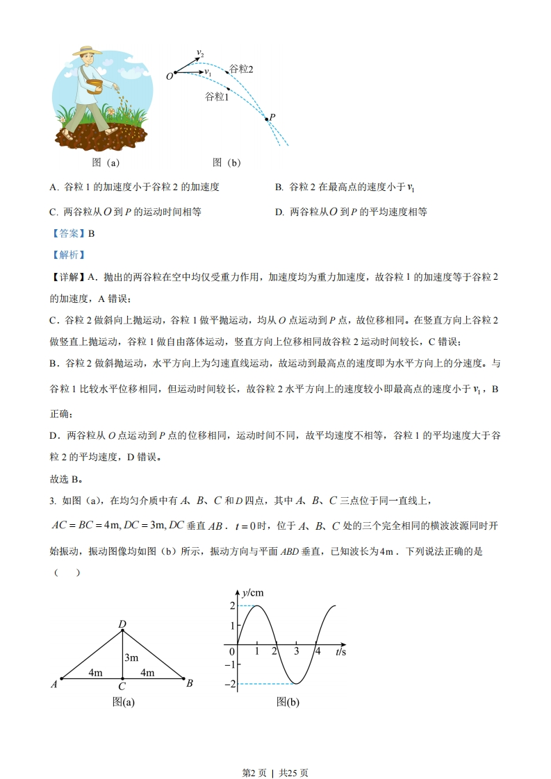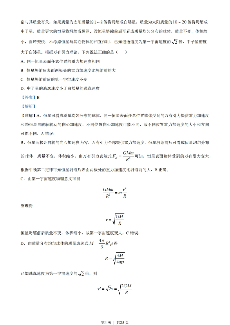 湖南省2023年普通高中学业水平选择性考试物理注意事项:1.答卷前,考生务必将自己的姓名、准考证号填写在本试卷和答题卡上2。回答选择题时,选出每小题答案后,用铅笔把答题卡上对应题目的答案标号涂黑。如需改动,用橡皮擦干净后,再选涂其他答案标号。回答非选择题时,将答案写在答题卡上。写在本试卷上无效3.考试结束后,将本试卷和答题卡一并交回.一、选释题:本题共6小题,每小题4分,共24分。在每小题给出的四个选项中,只有一项符合题目要求.1,2023年4月13日,中国“人造太阳”反应堆中科院环流器装置(EAST)创下新纪录,实现403秒稳态长脉冲高约束模等离子体运行,为可控核聚变的最终实现又向前迈出了重要的一步,下列关于核反应的说法正确的是()A.相同质量的核燃料,轻核聚变比重核裂变释放的核能更多B.氘氚核聚变的核反应方程为H+H→He+eC.核聚变的核反应燃料主要是铀235D.核聚变反应过程中没有质量亏损【答案】A【解析】【详解】A.相同质量的核燃料,轻核聚变比重核裂变释放的核能更多,A正确:B.根据质量数守恒和核电荷数守恒可知,氘氚核聚变的核反应方程为2HtH→2He+nB错误:C.核聚变的核反应燃料主要是氘核和氚核,C错误:D.核聚变反应过程中放出大量能量,有质量亏损,D错误。故选A。2.如图(),我国某些农村地区人们用手抛撒谷粒进行水稻播种。某次抛出的谷粒中有两颗的运动轨迹如图(b)所示,其轨迹在同一竖直平面内,抛出点均为O,且轨迹交于P点,抛出时谷粒1和谷粒2的初速度分别为和,,其中?方向水平,2方向斜向上。忽略空气阻力,关于两谷粒在空中的运动,下列说法正确的是()第1页」共25页、谷粒2谷粒1图(a)图(b)A.谷粒1的加速度小于谷粒2的加速度B.谷粒2在最高点的速度小于C.两谷粒从O到P的运动时间相等D.两谷粒从O到P的平均速度相等【答案】B【解析】【详解】A.抛出的两谷粒在空中均仅受重力作用,加速度均为重力加速度,故谷粒1的加速度等于谷粒2的加速度,A错误:C.谷粒2做斜向上抛运动,谷粒1做平抛运动,均从O点运动到P点,故位移相同。在竖直方向上谷粒2做竖直上抛运动,谷粒1做自由落体运动,竖直方向上位移相同故谷粒2运动时间较长,C错误:B.谷粒2做斜抛运动,水平方向上为匀速直线运动,故运动到最高点的速度即为水平方向上的分速度。与谷粒1比较水平位移相同,但运动时间较长,故谷粒2水平方向上的速度较小即最高点的速度小于?,B正确:D.两谷粒从O点运动到P点的位移相同,运动时间不同,故平均速度不相等,谷粒1的平均速度大于谷粒2的平均速度,D错误。故选B。3.如图(a),在均匀介质中有AB、C和D四点,其中AB、C三点位于同一直线上,AC=BC=4m,DC=3m,DC垂直AB.t=0时,位于A、B、C处的三个完全相同的横波波源同时开始振动,振动图像均如图(b)所示,振动方向与平面ABD垂直,己知波长为4m,下列说法正确的是()◆y/cmO0113m4m4mCB-2图(a)图(b)第2页|共25页A.这三列波的波速均为2m/sB.t=2s时,D处的质点开始振动C.t=4.5s时,D处的质点向y轴负方向运动D.t=6s时,D处的质点与平衡位置的距离是6Cm【答案】C【解析】【详解】A.由图(b)的振动图像可知,振动的周期为4s,故三列波的波速为元_4m=lmlsV=一=T 4sA错误:B.由图(a)可知,D处距离波源最近的距离为3m,故开始振动后波源C处的横波传播到D处所需的时间为lc=DC 3m=3sv Im/s故t=2s时,D处的质点还未开始振动,B错误:C.由几何关系可知AD=BD=Sm,波源A、B产生的横波传播到D处所需的时间为1-4D-5m=59y Im/s故t=4.5s时,仅波源C处的横波传播到D处,此时D处的质点振动时间为4=t-tc=1.5s由振动图像可知此时D处的质点向y轴负方向运动,C正确:D.t=6s时,波源C处的横波传播到D处后振动时间为42=t-t6=3s由根动图像可知此时D处为波源C处传播横波的波谷:1=6s时,波源A、B处的横波传播到D处后根动时间为s=t-tB=Is由根动图像可知此时D处为波源A、B处传播横波的波峰。根据波的叠加原理可知此时D处质点的位移为y=2A-A=2cm故t=6s时,D处的质点与平衡位置的距离是2cm。D错误。故选C。4.根据宇宙大爆炸理论,密度较大区域的物质在万有引力作用下,不断聚集可能形成恒星。恒星最终的归第3页共25页