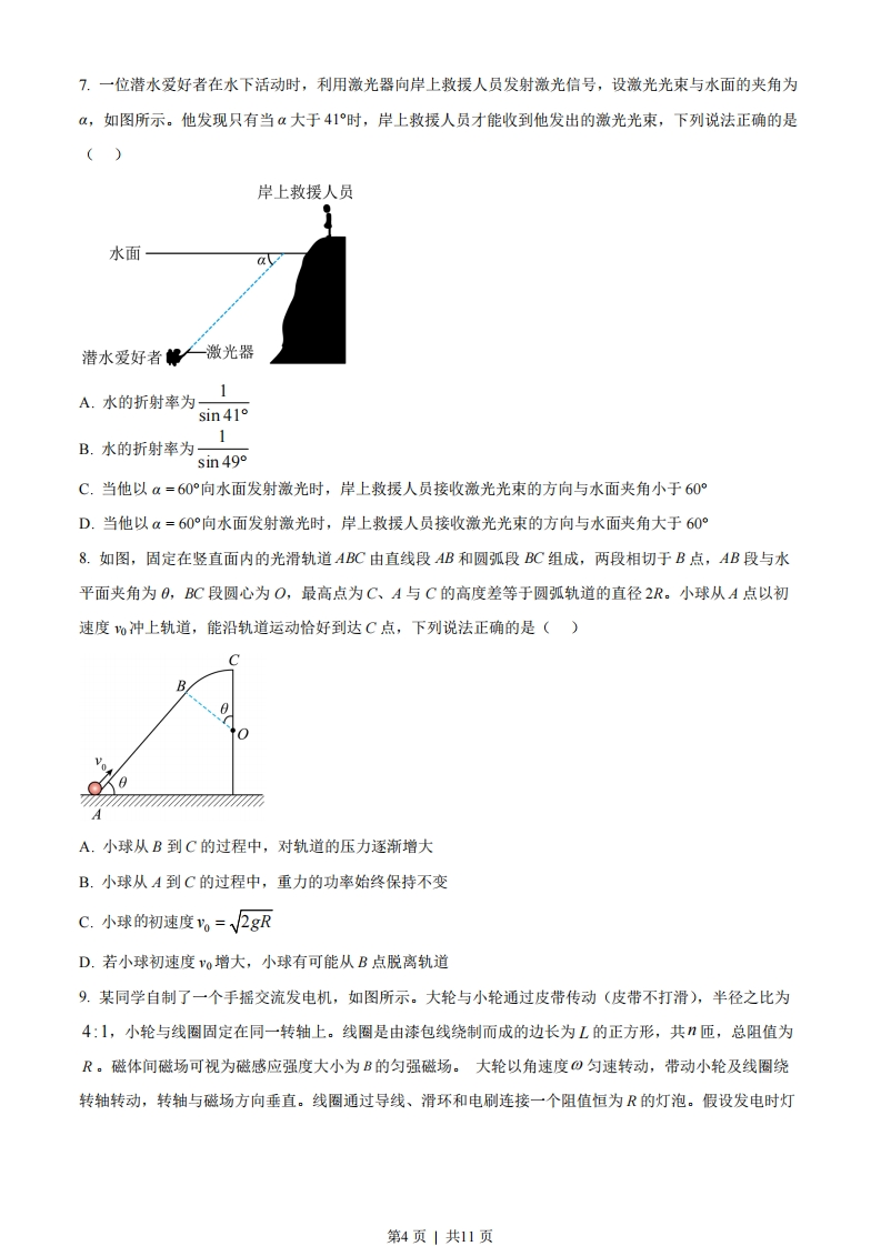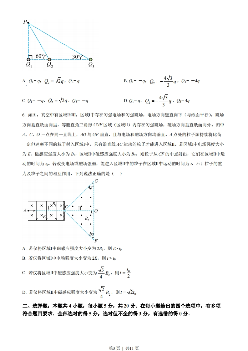 湖南省2023年普通高中学业水平选择性考试物理注意事项:1.答卷前,考生务必将自己的姓名、准考证号填写在本试卷和答题卡上2。回答选择题时,选出每小题答案后,用铅笔把答题卡上对应题目的答案标号涂黑。如需改动,用橡皮擦干净后,再选涂其他答案标号。回答非选择题时,将答案写在答题卡上。写在本试卷上无效.3.考试结束后,将本试卷和答题卡一并交回.一、选释题:本题共6小题,每小题4分,共24分。在每小题给出的四个选项中,只有一项符合题目要求.1,2023年4月13日,中国“人造太阳”反应堆中科院环流器装置(EAST)创下新纪录,实现403秒稳态长脉冲高约束模等离子体运行,为可控核聚变的最终实现又向前迈出了重要的一步,下列关于核反应的说法正确的是()A.相同质量的核燃料,轻核聚变比重核裂变释放的核能更多B.氘氚核聚变的核反应方程为H+H→He+eC.核聚变的核反应燃料主要是铀235D.核聚变反应过程中没有质量亏损2.如图(),我国某些农村地区人们用手抛撒谷粒进行水稻播种。某次抛出的谷粒中有两颗的运动轨迹如图(b)所示,其轨迹在同一竖直平面内,抛出点均为O,且轨迹交于P点,抛出时谷粒1和谷粒2的初速度分别为?和?,其中?方向水平,2方向斜向上。忽略空气阻力,关于两谷粒在空中的运动,下列说法正确的是(、谷粒2谷粒1图(a)图(b)A.谷粒1的加速度小于谷粒2的加速度B.谷粒2在最高点的速度小于?C.两谷粒从O到P的运动时间相等D.两谷粒从O到P的平均速度相等3.如图(a),在均匀介质中有AB、C和D四点,其中AB、C三点位于同一直线上,第1页」共11页AC=BC=4m,DC=3m,DC垂直AB.t=0时,位于A、B、C处的三个完全相同的横波波源同时开始振动,振动图像均如图(b)所示,振动方向与平面ABD垂直,己知波长为4m,下列说法正确的是()个ylcmD012tis3m4m4mACB-2图(a)图b)A.这三列波的波速均为2m/sB.1=2s时,D处的质点开始振动C.t=4.5s时,D处的质点向y轴负方向运动D.t=6s时,D处的质点与平衡位置的距离是6cm4.根据宇宙大爆炸理论,密度较大区域的物质在万有引力作用下,不断聚集可能形成恒星。恒星最终的归宿与其质量有关,如果质量为太阳质量的1~8倍将坍缩成白矮星,质量为太阳质量的10~20倍将坍缩成中子星,质量更大的恒星将坍缩成黑洞。设恒星坍缩前后可看成质量均匀分布的球体,质量不变,体积缩小,自转变快.不考虑恒星与其它物体的相互作用.己知逃逸速度为第一宇宙速度的√2倍,中子星密度大于白矮星。根据万有引力理论,下列说法正确的是()A.同一恒星表面任意位置的重力加速度相同B.恒星坍缩后表面两极处的重力加速度比坍缩前的大C.恒星坍缩前后的第一宇宙速度不变D.中子星的逃逸速度小于白矮星的逃逸速度5.如图,真空中有三个点电荷固定在同一直线上,电荷量分别为Q1、Q2和Q3,P点和三个点电荷的连线与点电荷所在直线的夹角分别为90°、60°、和30°。若P点处的电场强度为零,q>0,则三个点电荷的电荷量可能为()第2页」共11页60。-30°092A0=q4,02=V2q,Q=gB0=-g,g=-459,0=-4gC.01=-q,Q2=V2q,03=-q4v5D.21=q,Q2=-39,0=4g6.如图,真空中有区域和Ⅲ,区域I中存在匀强电场和匀强磁场,电场方向竖直向下(与纸面平行),磁场方向垂直纸面向里,等腰直角三角形CGF区域(区域Ⅱ)内存在匀强磁场,磁场方向垂直纸面向外。图中A、C、O三点在同一直线上,AO与GF垂直,且与电场和磁场方向均垂直。A点处的粒子源持续将比荷一定但速率不同的粒子射入区域虹中,只有沿直线AC运动的粒子才能进入区域。若区域中电场强度大小为E、磁感应强度大小为B,区域I中磁感应强度大小为B2,则粒子从C℉的中点射出,它们在区域Ⅱ中运动的时间为o。若改变电场或磁场强弱,能进入区域中的粒子在区域中运动的时间为4,不计粒子的重力及粒子之间的相互作用,下列说法正确的是()GB459A.若仅将区域I中磁感应强度大小变为2B1,则1>toB.若仅将区域I中电场强度大小变为2E,则t>oC若仅将区城中破感应强度大小变为5A,则1=号4D若仅将区姨中暖感应强度大小变为巨B,则1=,4二、选释题:本题共4小题,每小题5分,共20分,在每小题给出的四个选项中,有多项符合题目要求.全部选对的得5分,选对但不全的得3分,有选错的得0分.第3页」共11页
