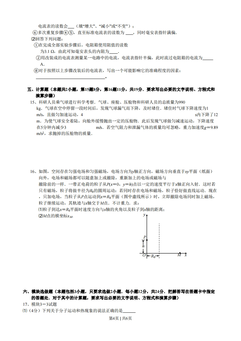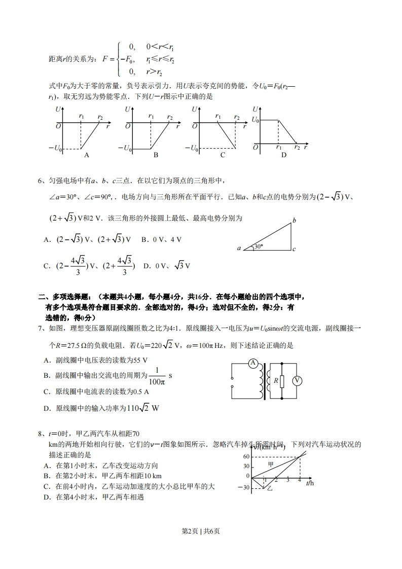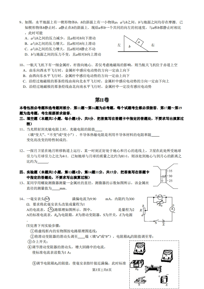 2008年全国普通高等学校招生统一考试海南(物理试卷)第I卷一、单项选择题:(本题共6小题,每小题3分,共18分。在每小题给出的四个选项中,只有一个是符合题目要求的)1、法拉第通过静心设计的一系列试验,发现了电磁感应定律,将历史上认为各自独立的学科“电学”与“磁学”联系起来.在下面几个典型的实验设计思想中,所作的推论后来被实验否定的是A.既然磁铁可使近旁的铁块带磁,静电荷可使近旁的导体表面感应出电荷,那么静止导线上的稳恒电流也可在近旁静止的线圈中感应出电流B.既然磁铁可在近旁运动的导体中感应出电动势,那么稳恒电流也可在近旁运动的线圈中感应出电流C.既然运动的磁铁可在近旁静止的线圈中感应出电流,那么静止的磁铁也可在近旁运动的导体中感应出电动势D.既然运动的磁铁可在近旁的导体中感应出电动势,那么运动导线上的稳恒电流也可在近旁的线圈中感应出电流2、如图,质量为M的楔形物块静置在水平地面上,其斜面的倾角为0.斜面上有一质量为m的小物块,小物块与斜面之间存在摩擦.用恒力F沿斜面向上拉小物块,使之匀速上滑.在小物块运动的过程中,楔形物块始终保持静止.地面对楔形物块的支持力为A.(M什m)gB.(M什m)gFC.(M+m)g+Fsin0 D.(M+m)g-Fsin03、如图,一轻绳的一端系在固定粗糙斜面上的O点,另一端系一小球.给小球一足够大的初速度,使小球在斜面上做圆周运动.在此过程中,。、、A.小球的机械能守恒0B.重力对小球不做功C.绳的张力对小球不做功D.在任何一段时间内,小球克服摩擦力所做的功总是等于小球动能的减少4、静电场中,带电粒子在电场力作用下从电势为p的a点运动至电势为p的b点.若带电粒子在a、b两点的速率分别为vav,不计重力,则带电粒子的比荷gm,为-哈B.-c.-哈-D.Po-Pa96-9a2(p。-9a)2(9。-pa)5、质子和中于是由更基本的粒子即所谓“夸克”组成的.两个强作用电荷相反(类似于正负电荷)的夸克在距离很近时几乎没有相互作用(称为“渐近自由”):在距离较远时,它们之间就会出现很强的引力(导致所谓“夸克禁闭”),作为一个简单的模型,设这样的两夸克之间的相互作用力F与它们之间的第1页1共6页0,0<<5距离的关系为:F=万≤r≤50,r>h式中F为大于零的常量,负号表示引力.用U表示夸克间的势能,令U%=F(一n),取无穷远为势能零点.下列U一图示中正确的是16、匀强电场中有a、b、c三点.在以它们为顶点的三角形中,∠a=30°、∠c=90°,电场方向与三角形所在平面平行.已知a、b和c点的电势分别为(2-√3)V、(2+√3)V和2V.该三角形的外接圆上最低、最高电势分别为A.(2-V3)V、(2+V3)VB.0V、4Va530c.2-45v、2+45D.ov.5v33二、多项选择题:(本题共4小题,每小题4分,共16分。在每小题给出的四个选项中,有多个选项是符合题目要求的.全部选对的,得4分:选对但不全的,得2分:有选错的,得0分)7、如图,理想变压器原副线圈匝数之比为4:1.原线圈接入一电压为u=Uosinot的交流电源,副线圈接一个R=27.52的负载电阻.若U6=220√2V,0=100πHz,则下述结论正确的是A.副线圈中电压表的读数为55VB.副线圈中输出交流电的周期为-S100C.原线圈中电流表的读数为0.5AD.原线圈中的输入功率为110√2W8、1=0时,甲乙两汽车从相距70km的两地开始相向行驶,它们的v一图象如图所示.忽略汽车掉头所需时间,下列对汽车运动状况的描述正确的是60A.在第1小时末,乙车改变运动方向30甲B.在第2小时末,甲乙两车相距10km0C.在前4小时内,乙车运动加速度的大小总比甲车的大t/h-30D.在第4小时末,甲乙两车相遇第2页|共6页9、如图,水平地面上有一楔形物体b,b的斜面上有一小物块:a与b之间、b与地面之间均存在摩擦.己知楔形物体b静止时,a静止在b的斜面上.现给a和b一个共同的向左的初速度,与a和b都静止时相比,此时可能A.a与b之间的压力减少,且a相对b向下滑动B.a与b之间的压力增大,且a相对b向上滑动左C.a与b之间的压力增大,且a相对b静止不动D.b与地面之间的压力不变,且a相对b向上滑动10、一航天飞机下有一细金属杆,杆指向地心.若仅考虑地磁场的影响,则当航天飞机位于赤道上空A.由东向西水平飞行时,金属杆中感应电动势的方向一定由上向下B.由西向东水平飞行时,金属杆中感应电动势的方向一定由上向下C.沿经过地磁极的那条经线由南向北水平飞行时,金属杆中感应电动势的方向一定由下向上D.沿经过地磁极的那条经线由北向南水平飞行时,金属杆中一定没有感应电动势第和卷本卷包括必考题和选考题两部分。第11题~第16题为必考题,每个试题考生都必须做答.第17题~第19题为选考题,考生根据要求做答.三、填空题(本思共2小思,每小题4分,共8分,把答案写在答题卡中指定的答题处,不要求写出演算过程)11、当光照射到光敏电阻上时,光敏电阻的阻值」(填“变大”、“不变”或“变小”)·半导体热敏电阻是利用半导体材料的电阻率随变化而改变的特性制成的.12、一探月卫星在地月转移轨道上运行,某一时刻正好处于地心和月心的连线上,卫星在此处所受地球引力与月球引力之比为4:1.己知地球与月球的质量之比约为81:1,则该处到地心与到月心的距离之比约为四、实验题(本题共2小题,第13题4分,第14题11分,共15分.把答案写在答题卡35中指定的答题处,不要求写出演算过程)3013、某同学用螺旋测微器测量一金属丝的直径,测微器的示数如图所示,该金属丝025直径的测量值为_mm,14、一毫安表头m满偏电流为9.90mA,内阻约为3002.要求将