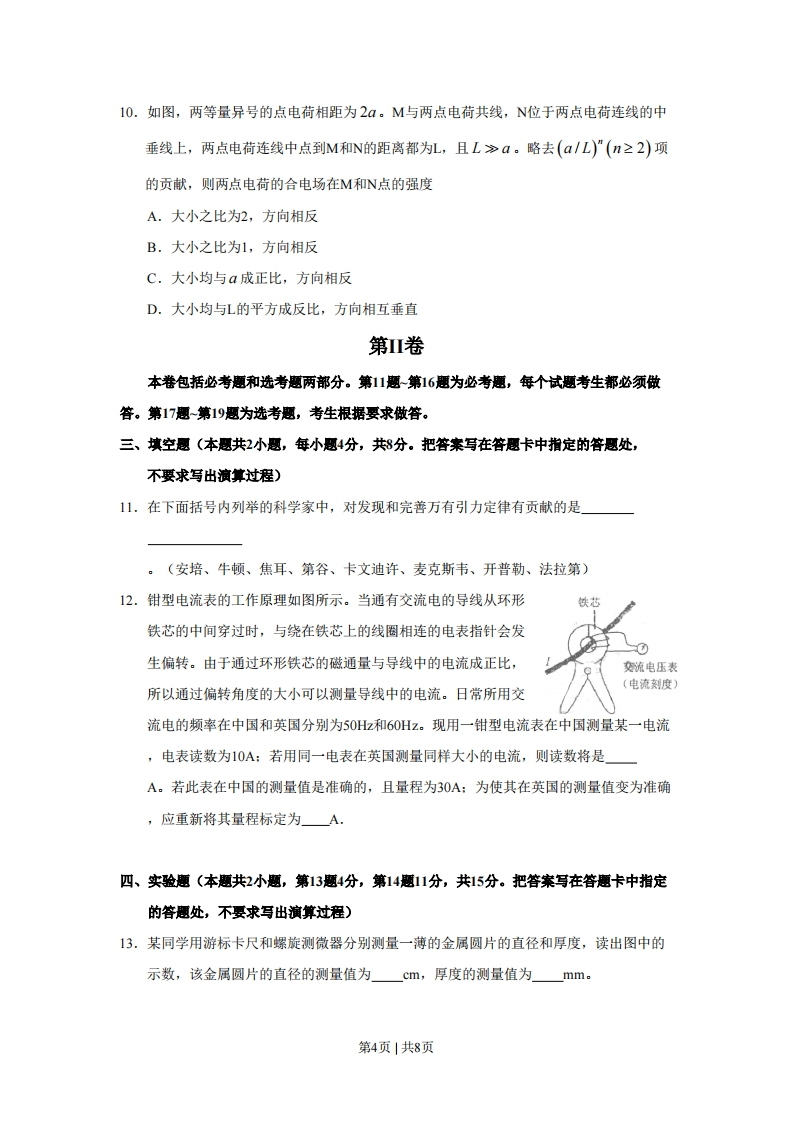 2009年普通高等学校招生全国统一考试(海南卷)物理注意事项:1.本试卷分第I卷(选择题)和第Ⅱ卷(非选择题)两部分。答卷前,考试务必将自己的姓名、准考证号填写在答题卡上。2.回答第I卷时,选出每小题答案后,用铅笔把答题卡上对应题目的答案标号涂黑,如需改动,用橡皮擦干净后,再选涂其它答案标号,写在本试卷上无效。3.回答第Ⅱ卷时,将答案写在答题卡上,写在本试卷上无效。4.考试结束后,将本试卷和答题卡一并交回。第卷一、单项选择题:(本题共6小题,每小题3分,共18分,在年小题给出的四个选项中,只有一项是符合题目要求的)1.两个大小分别为F和F(Fd,)将a、b球依次放入一竖直放置、内径为d(dS)。初始时,甲车在乙车前方甲56处。0A.若S。=十2,两车不会相遇B.若S。<,两车相遇2次C.若S。=S,两车相遇1次D.若S。=2,两车相遇1次9.一台发电机最大输出功率为4000kW,电压为4000V,经变压器T升压后向远方输电。输电线路总电阻R=1kQ。到目的地经变压器T,降压,负载为多个正常发光的灯泡(220V、60W)。若在输电线路上消耗的功率为发电机输出功率的10%,变压器T和T,的损耗可忽略,发电机处于满负荷工作状态,则A.T原、副线圈电流分别为103A和20AB.T,原、副线圈电压分别为1.8×10V和220VC.T和T2的变压比分别为1:50和40:1D.有6×10盏灯泡(220V、60W)正常发光第3页|共8页M