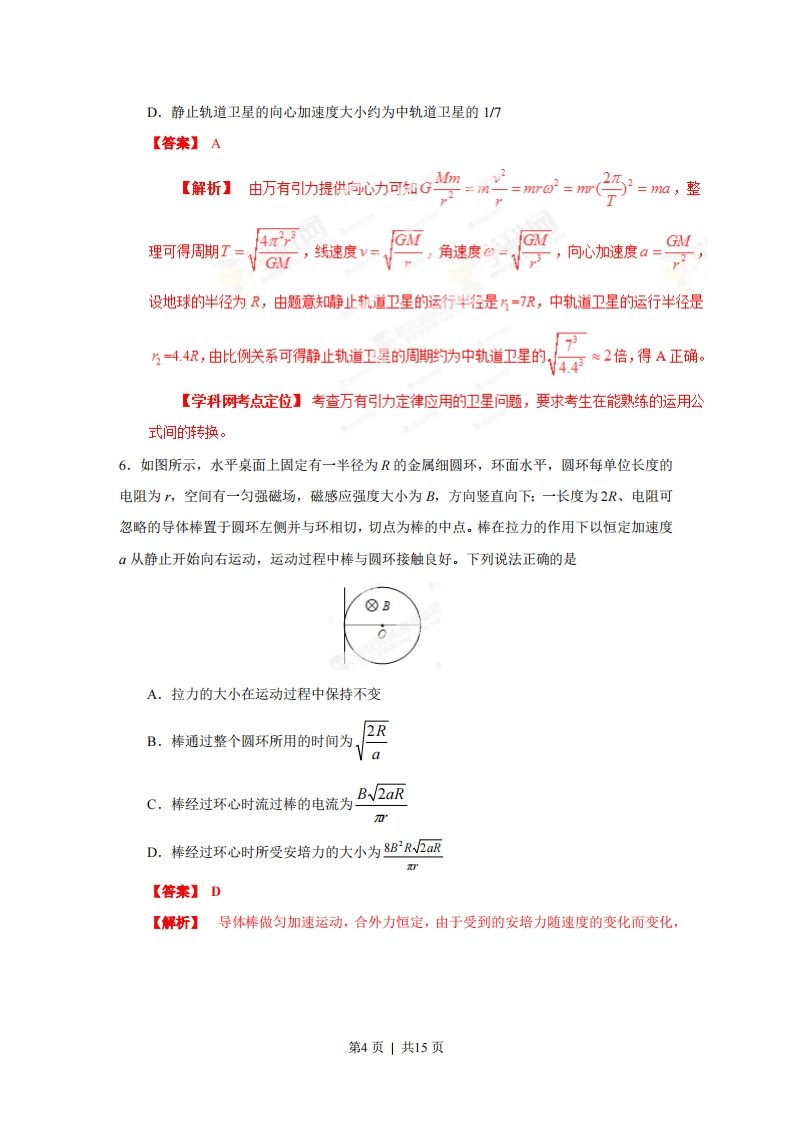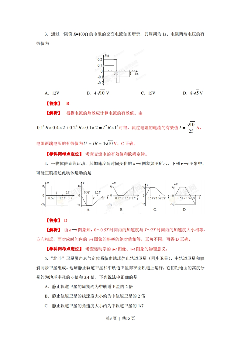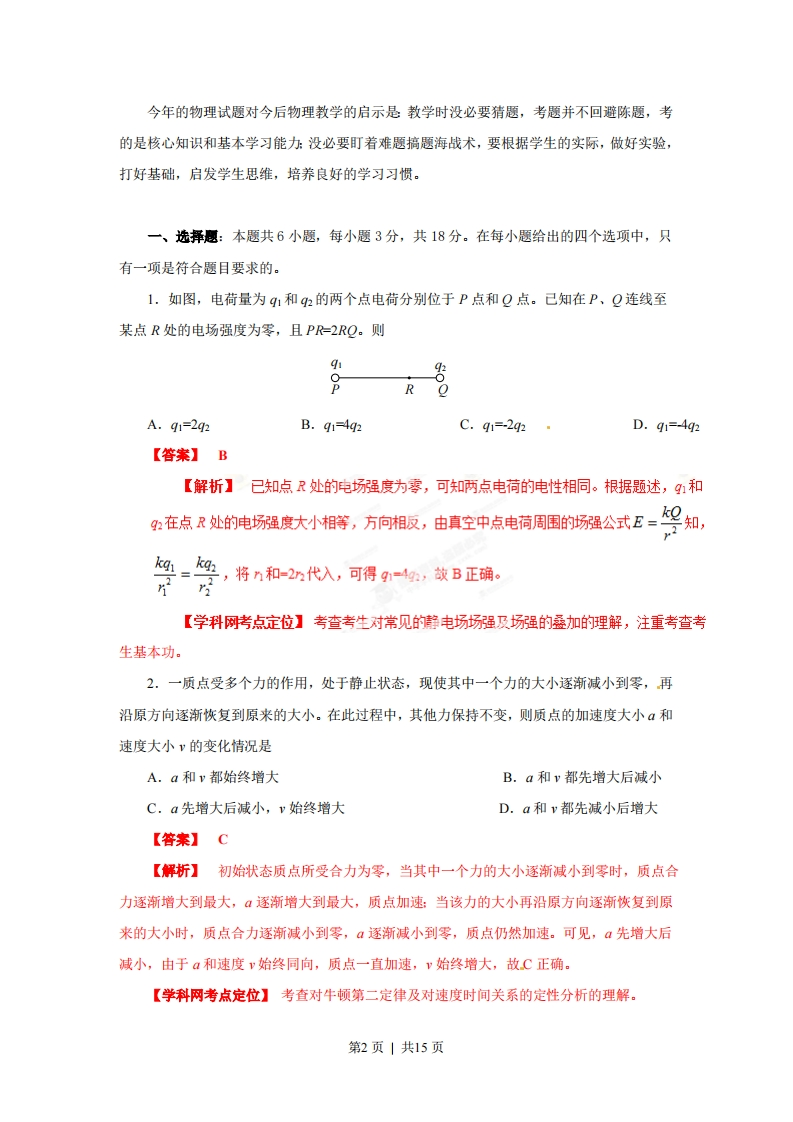 2013年普通高等学校招生全国统一考试(海南卷)》物理【学科网试卷总评】2013年高考物理试题(海南卷)与前几年相比较,明显不同的是,去掉了必考内容的两道填空题,考生答题总量为16题,减少了2题。因此考生审题、解题时间比往年略为充裕,有利于考生考出应有的水平另外,多项选择题和必考计算题各增加了4分,有利于提高全省大多数考生的分数。同时,2013年高考物理试题(海南卷)与前几年相比较,有更多的相同点,最突出的特点就是稳定。试题遵循考试大纲的要求,整体难度基本不变,易、中、难题分布合理。例如选择题中有关物理学发展史的考题:关于力与运动的关系,“变速率圆周运动”、“速率不变的曲线运动”中的合力方向问题。实验题的“研究机械能守恒定律”的数据分析,计算纸带的某时刻的瞬时速度等题目,考试内容与前几年相同,只是从“光电门”变为“打点计时器”的背景,其难度与高中基础会考的要求相当。电学实验题依然是给定实验原理图,连接实验电路,用串联分压、并联分流和欧姆定律等知识进行分析,解方程组求出两个电阻的阻值。而计算题与往年相比,亦稳中有变,如力学计算题,考查的是物体沿斜面运动的问题,但题目中给出的已知条件是以动能变化、机械能变化的形式呈现的,加大了对能量转化与守恒的物理思想的考查。电学计算题依然考查带电粒子在场中的运动,但考生解题时要自行画出带电粒子的运动示意图,如果没有良好的解题习惯就不容易解答。此外,考查的热点不变。如必考内容中“速度图像”、“天体的运动”、“功和能”、“带电粒子在磁场中的运动”、“电磁感应”、“伏安法测量电阻”等考生熟,悉的考点,都使考生倍感亲切。三道选考题的呈现方式完全相同,均是4分的六选三的选择题与8分的计算题,三道选考的计算题考查“气体定律”、“光的折射”、“动量守恒定律”,且题目中规中矩,容易得分。尽管今年的物理试题分析起来觉得不是太难,但是如果考试经验不足,也不容易得高分。若平时老师重视应试指导,考生按照选择题、实验题、选考题、计算题的顺序解答,也许在相同的时间里会拿到更多的分数。而如果在两道必考内容的计算题上花的时间多,势必造成解答选考题的时间仓促而无法拿到应有的分数。今年的平均分或比去年提高3至5分。第1页|共15页今年的物理试题对今后物理教学的启示是教学时没必要猜题,考题并不回避陈题,考的是核心知识和基本学习能力没必要盯着难题搞题海战术,要根据学生的实际,做好实验,打好基础,启发学生思维,培养良好的学习习惯。一、选择愿:本题共6小题,每小题3分,共18分。在每小题给出的四个选项中,只有一项是符合题目要求的。1.如图,电荷量为q1和2的两个点电荷分别位于P点和Q点。己知在P、Q连线至某点R处的电场强度为零,且PR=2RQ。则gi92A.q1=2q2B.q1=4q2C.q1=-2q2·D.q1=-4q2【答案】B【解析】已知点R处的电场强度为零,可知两点电荷的电性相同。根据题述,q1和2在点R处的电场强度大小相等,方向相反,由真空中点电荷周围的场强公式E=kqzR,将n和=2n代入,可得g1=4q,故B正确。【学科网考点定位】考查考生对常见的静电场场强及场强的桑加的理解,注重考查考生基本功。2.一质点受多个力的作用,处于静止状态,现使其中一个力的大小逐渐减小到零,再沿原方向逐渐恢复到原来的大小。在此过程中,其他力保持不变,则质点的加速度大小和速度大小v的变化情况是A.a和v都始终增大B.a和v都先增大后减小C.a先增大后减小,v始终增大D.a和v都先减小后增大【答案】C【解析】初始状态质点所受合力为零,当其中一个力的大小逐渐减小到零时,质点合力逐渐增大到最大,逐渐增大到最大,质点加速:当该力的大小再沿原方向逐渐恢复到原来的大小时,质点合力逐渐减小到零,a逐渐减小到零,质点仍然加速。可见,a先增大后减小,由于a和速度v始终同向,质点一直加速,v始终增大,故C正确。【学科网考点定位】考查对牛顿第二定律及对速度时间关系的定性分析的理解。第2页|共15页3.通过一阻值=1000的电阻的交变电流如图所示,其周期为1s。电阻两端电压的有效值为0.20.1-0.1-0.2A.12VB.4v10 VC.15VD.85V【答案】B【解析】根据电流的热效应计算电流的有效值。由0.12R×0.4×2+0.22R×0.1×2=I2R×12可得,流过电阻的电流的有效值I=10A,25电阻两端电压的有效值为U=IR=4V10V,C正确【学科网考点定位】考查交流电的有效值和欧姆定律。4.一物体做直线运动,其加速度随时间变化的a一图象如图所示。下列v一图象中,可能正确描述此物体运动的是370.5T15T0.5715T0.5TT1.512Tt0.5TT1.5T2T t0.5TT1.32109D【答案】D【解析】由a图象知,00.5T时间内的加速度与T~2T时间内的加速度大小相等,方向相反,而对应时间内的图象的斜率的绝对值相等,正负不同,可得D正确。【学科网考点定位】考查运动学的-1图像、t图象的物理意义。5.“北斗”卫星屏声息气定位系统由地球静止轨道卫星(同步卫星)、中轨道卫星和倾斜同步卫星组成。地球静止轨道卫星和中轨道卫星都在圆轨道上运行,它们距地面的高度分别约为地球半径的6倍和3.4倍,下列说法中正确的是A,静止轨道卫星的周期约为中轨道卫星的2倍B.静止轨道卫星的线速度大小约为中轨道卫星的2倍C.静止轨道卫星的角速度大小约为中轨道卫星的1/7第3页|共15页