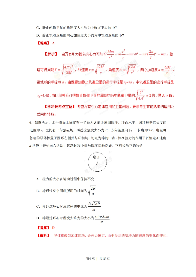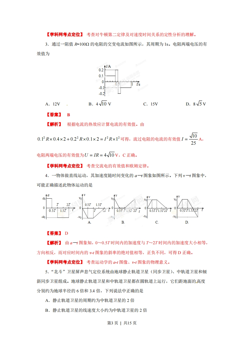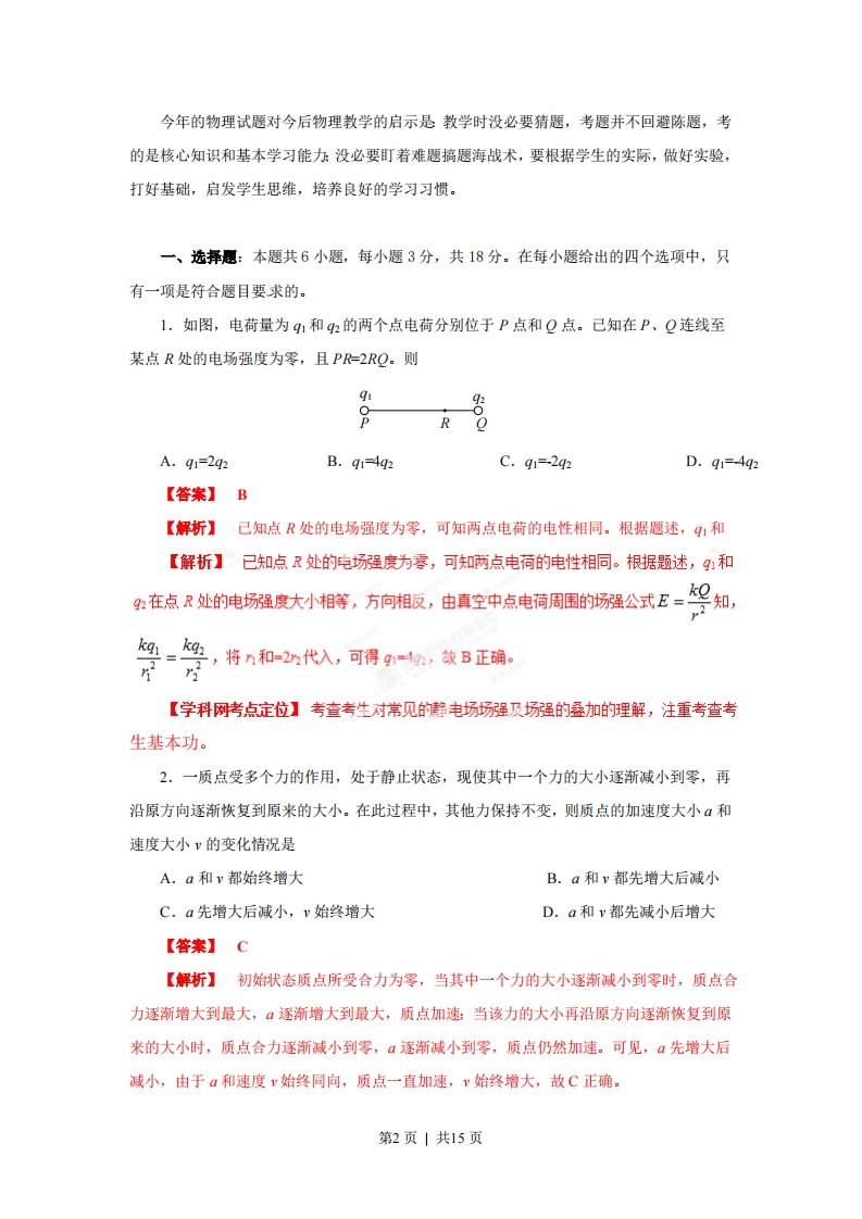 2013年普通高等学校招生全国统一考试(海南卷)》物理【学科网试卷总评】2013年高考物理试题(海南卷)与前几年相比较,明显不同的是,去掉了必考内容的两道填空题,考生答题总量为16题,减少了2题。因此考生审题、解题时间比往年略为充裕,有利于考生考出应有的水平另外,多项选择题和必考计算题各增加了4分,有利于提高全省大多数考生的分数。同时,2013年高考物理试题(海南卷)与前几年相比较,有更多的相同点,最突出的特点就是稳定。试题遵循考试大纲的要求,整体难度基本不变,易、中、难题分布合理。例如选择题中有关物理学发展史的考题:关于力与运动的关系,“变速率圆周运动”、“速率不变的曲线运动”中的合力方向问题。实验题的“研究机械能守恒定律”的数据分析,计算纸带的某时刻的瞬时速度等题目,考试内容与前几年相同,只是从“光电门”变为“打点计时器”的背景,其难度与高中基础会考的要求相当。电学实验题依然是给定实验原理图,连接实验电路,用串联分压、并联分流和欧姆定律等知识进行分析,解方程组求出两个电阻的阻值。而计算题与往年相比,亦稳中有变,如力学计算题,考查的是物体沿斜面运动的问题,但题目中给出的已知条件是以动能变化、机械能变化的形式呈现的,加大了对能量转化与守恒的物理思想的考查。电学计算题依然考查带电粒子在场中的运动,但考生解题时要自行画出带电粒子的运动示意图,如果没有良好的解题习惯就不容易解答。此外,考查的热点不变。如必考内容中“速度图像”、“天体的运动”、“功和能”、“带电粒子在磁场中的运动”、“电磁感应”、“伏安法测量电阻”等考生熟,悉的考点,都使考生倍感亲切。三道选考题的呈现方式完全相同,均是4分的六选三的选择题与8分的计算题,三道选考的计算题考查“气体定律”、“光的折射”、“动量守恒定律”,且题目中规中矩,容易得分。尽管今年的物理试题分析起来觉得不是太难,但是如果考试经验不足,也不容易得高分。若平时老师重视应试指导,考生按照选择题、实验题、选考题、计算题的顺序解答,也许在相同的时间里会拿到更多的分数。而如果在两道必考内容的计算题上花的时间多,势必造成解答选考题的时间仓促而无法拿到应有的分数。今年的平均分或比去年提高3至5分。第1页|共15页今年的物理试题对今后物理教学的启示是教学时没必要猜题,考题并不回避陈题,考的是核心知识和基本学习能力没必要盯着难题搞题海战术,要根据学生的实际,做好实验,打好基础,启发学生思维,培养良好的学习习惯。一、选择愿:本题共6小题,每小题3分,共18分。在每小题给出的四个选项中,只有一项是符合题目要求的。1.如图,电荷量为q1和2的两个点电荷分别位于P点和Q点。己知在P、Q连线至某点R处的电场强度为零,且PR=2RQ。则giA.q1=2q2B.q1=4q2C.q1=-2q2D.q1=4q2【答案】B【解析】己知点R处的电场强度为零,可知两点电荷的电性相同。根据题述,1和【解析】已知点R处的电场强度为零,可知两点电荷的电性相同。根据题述,9和®在点R处的电场娜强度大小相等,方向相反,由真空中点电荷周围的场强公式E-华知,=学,将n和-2奶代入,可得91=4g,故B正【学科网转点定位】考查考生对常见的静电场场强及场强的桑加的理解,注重考查考生基本功。2.一质点受多个力的作用,处于静止状态,现使其中一个力的大小逐渐减小到零,再沿原方向逐渐恢复到原来的大小。在此过程中,其他力保持不变,则质点的加速度大小α和速度大小ⅴ的变化情况是A.a和v都始终增大B.a和v都先增大后减小C.a先增大后减小,v始终增大D.a和v都先减小后增大【答業】C【解析】初始状态质点所受合力为零,当其中一个力的大小逐渐减小到零时,质点合力逐渐增大到最大,逐渐增大到最大,质点加速:当该力的大小再沿原方向逐渐恢复到原来的大小时,质点合力逐渐减小到零,a逐渐减小到零,质点仍然加速。可见,a先增大后减小,由于a和速度v始终同向,质点一直加速,v始终增大,故C正确。第2页|共15页【学科网考点定位】考查对牛顿第二定律及对速度时间关系的定性分析的理解。3.通过一阻值R=1002的电阻的交变电流如图所示,其周期为1s。电阻两端电压的有效值为A0.20.1-0.1-02A.12VB.4v10VC.15VD.85v【答案】B【解析】根据电流的热效应计算电流的有效值。由0.1PR×0.4×2+0.2R×0.1×2=PR×12可得,流过电阻的电流的有效值I=A25电阻两端电压的有效值为U=IR=4√10V,C正确。【学科网考点定位】考查交流电的有效值和欧姆定律。4.一物体做直线运动,其加速度随时间变化的aH图象如图所示。下列图象中,可能正确描述此物体运动的是a0.5T1.5700.5115T05T T15T 2T0.5TT1.572rt0.5TT1.320【答案】D【解析】由a一图象知,00.5T时间内的加速度与T~2T时间内的加速度大小相等,方向相反,而对应时间内的图象的斜率的绝对值相等,正负不同,可得D正确。【学科网考点定位】考查运动学的a-1图像、1图象的物理意义。5.“北斗”卫星屏声息气定位系统由地球静止轨道卫星(同步卫星)、中轨道卫星和倾斜同步卫星组成。地球静止轨道卫星和中轨道卫星都在圆轨道上运行,它们距地面的高度分别约为地球半径的6倍和3.4倍,下列说法中正确的是A.静止轨道卫星的周期约为中轨道卫星的2倍B.静止轨道卫星的线速度大小约为中轨道卫星的2倍第3页|共15页